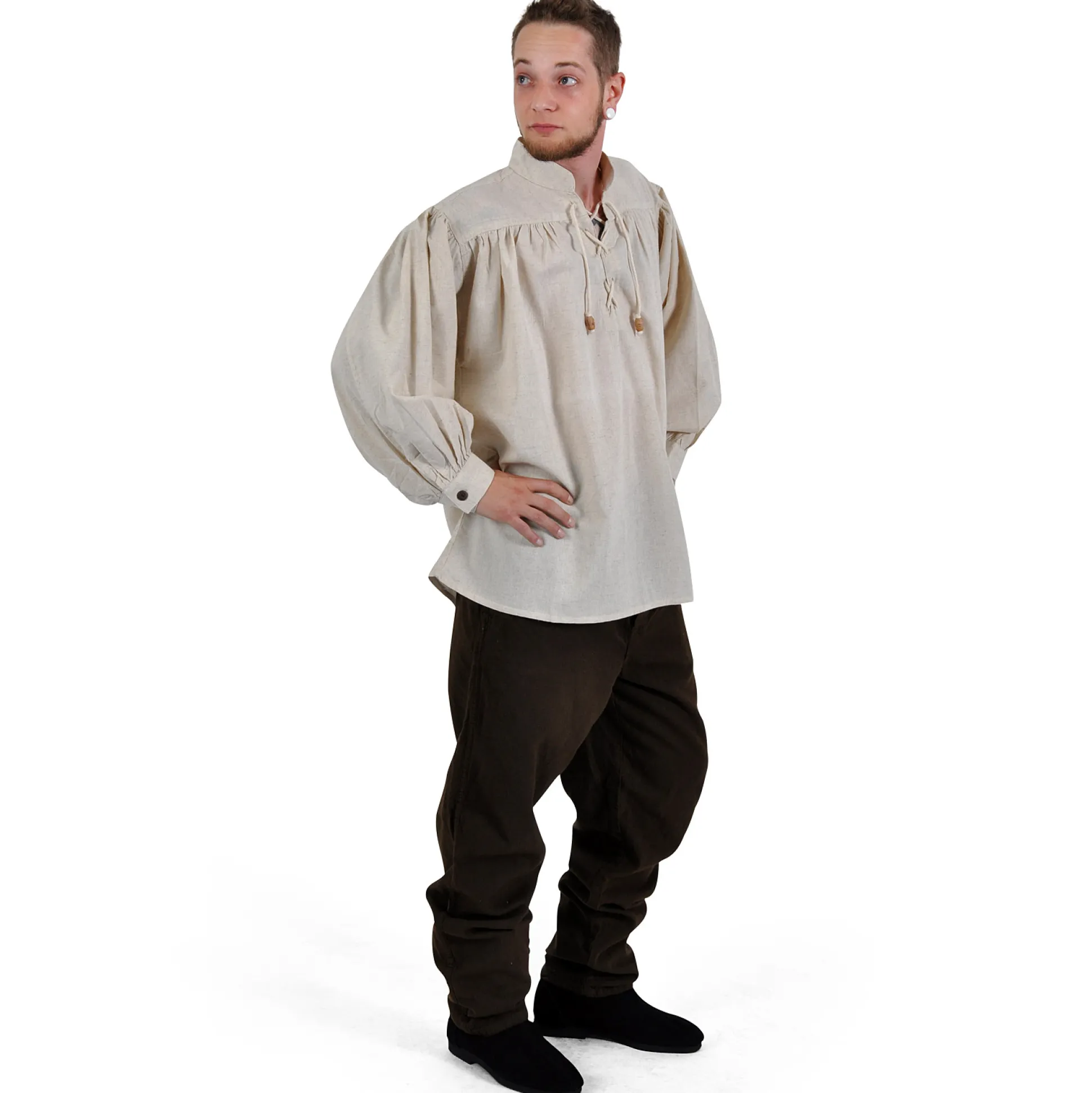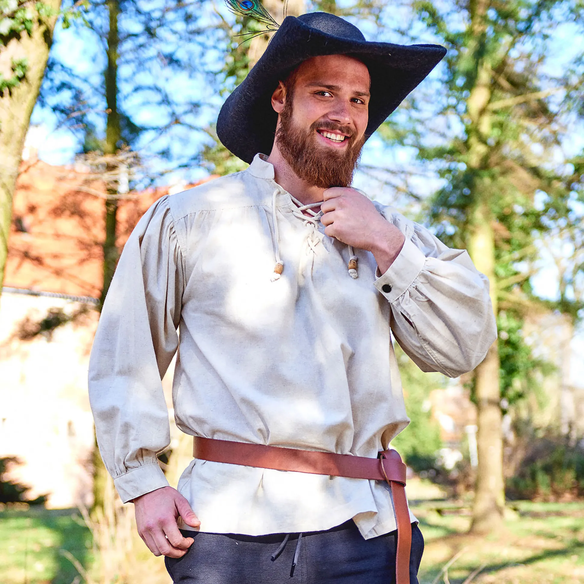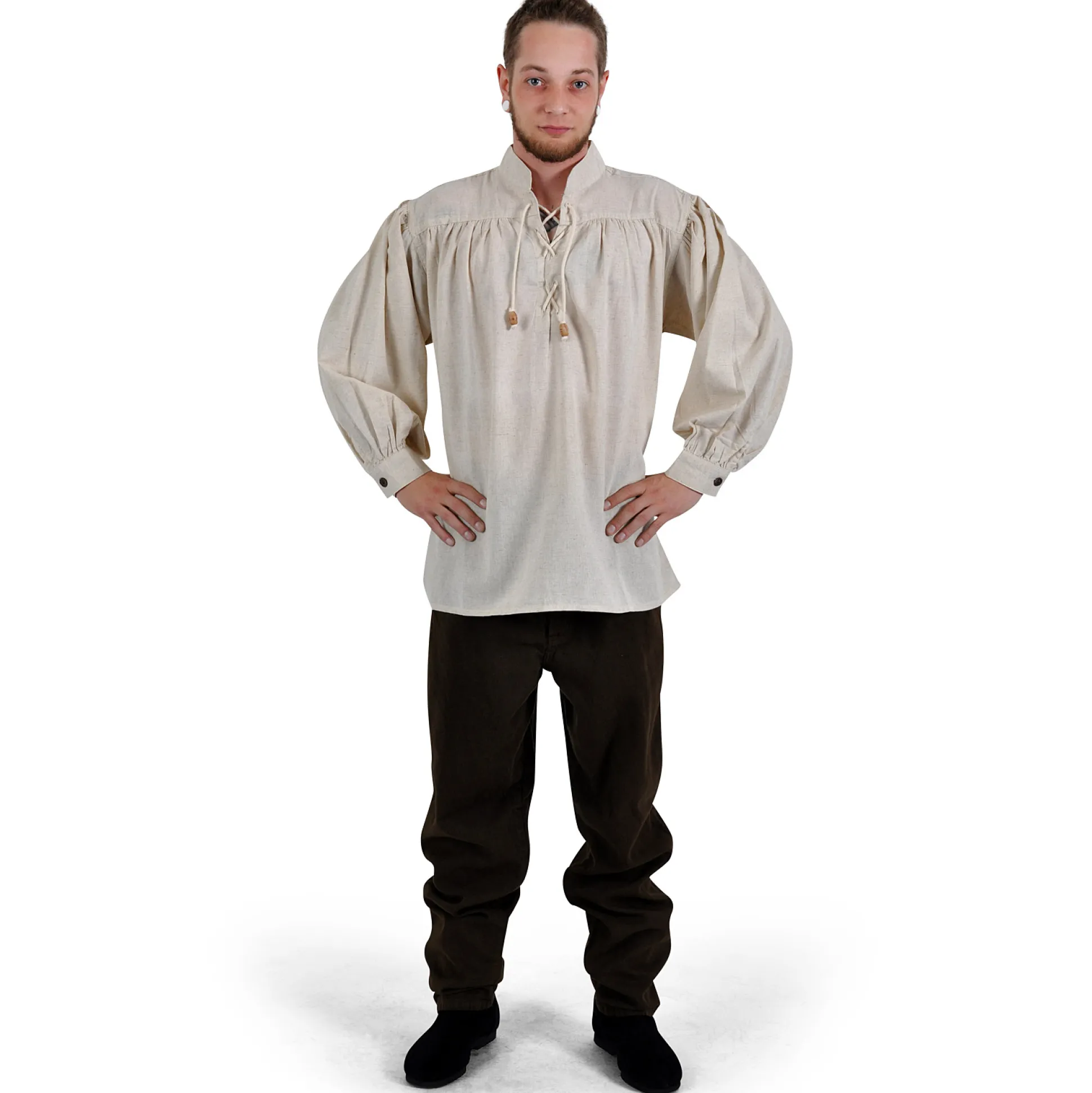 Een eenvoudig middeleeuws hemd voor elke gelegenheid. Gemaakt van zeer stevig katoen met linnenlook, geschikt voor allerlei evenementen en makkelijk te combineren met andere kledingstukken. Of je nu naar riddertoernooien, middeleeuwse markten of kasteelfeesten gaat – dit hemd geeft je veel bewegingsvrijheid en voelt prettig aan op de huid. Het is voorzien van een koordvetering en een kleine opstaande kraag. Zo ben je gegarandeerd perfect gekleed.