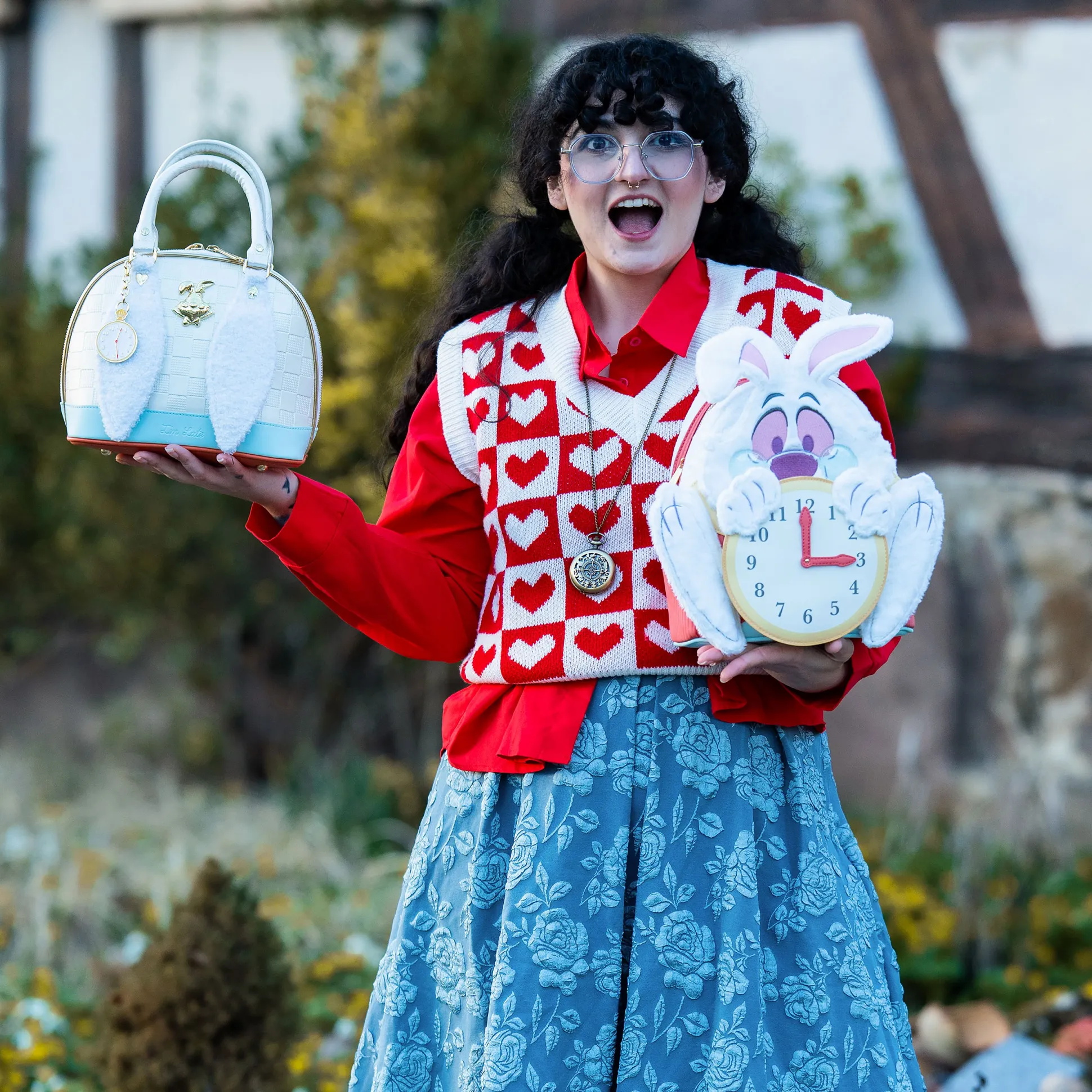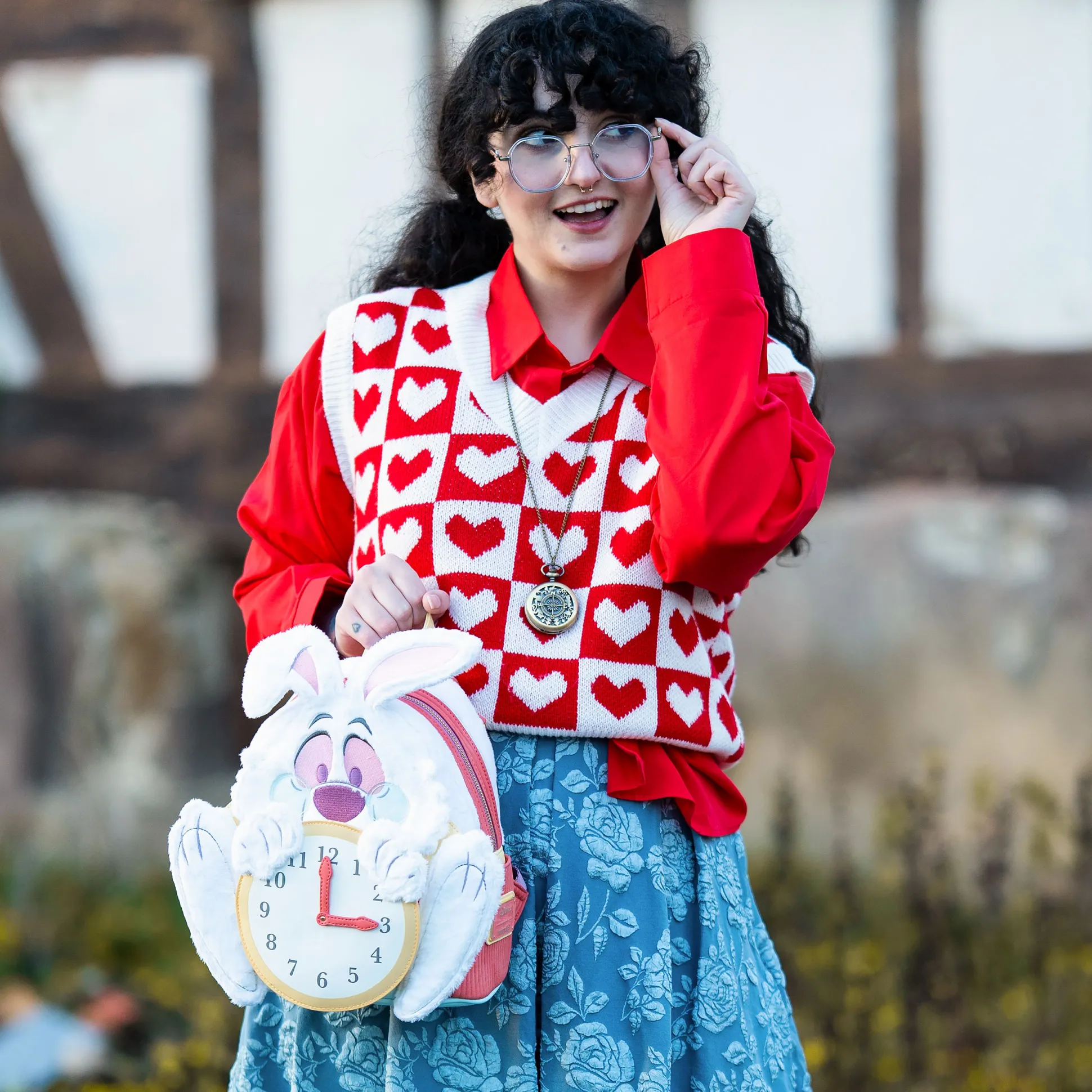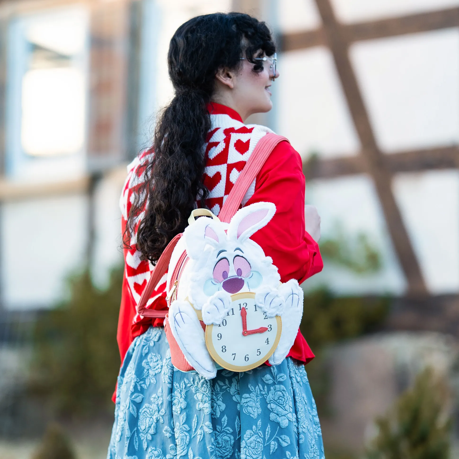 Met de verstelbare schouderbanden en het handvat draag je deze mini rugzak precies zoals jouw persoonlijke reis door het konijnenhol dat vraagt. Met afmetingen van 22,8 x 25 x 11,5 cm is hij compact genoeg voor dagelijks gebruik, maar ruim genoeg voor alles wat je nodig hebt op je volgende echte of denkbeeldige avontuur. Ideaal voor Alice in Wonderland-fans die hun innerlijke Witte Konijn stijlvol – en met een vleugje chaos – willen loslaten.