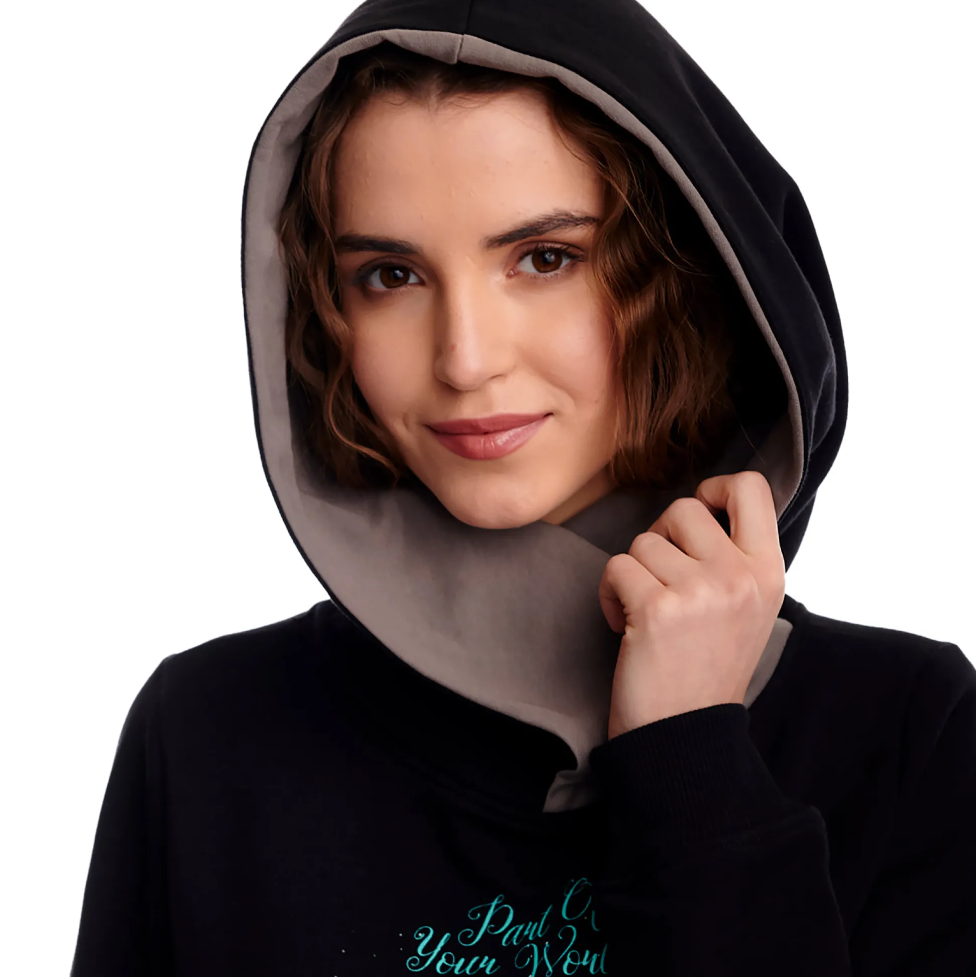Voor iedereen die “Part of Your World” onder de douche meezingt: deze officieel gelicentieerde dames-hoodie van Disney’s De Kleine Zeemeermin brengt oceaanvibes naar je dag. De voorkant toont het silhouet van Ariël en het citaat, de stof is warm en zacht met een opgeruwde binnenkant. Een grijze sjaalkraag, stevige boorden en een kangoeroezak voor zorgen voor extra knusheid — in klassiek zwart. Perfect voor filmavonden, strandwandelingen of wanneer je je benen het liefst ruilt voor maximaal knusgehalte — helemaal zonder deal met de zeeheks.