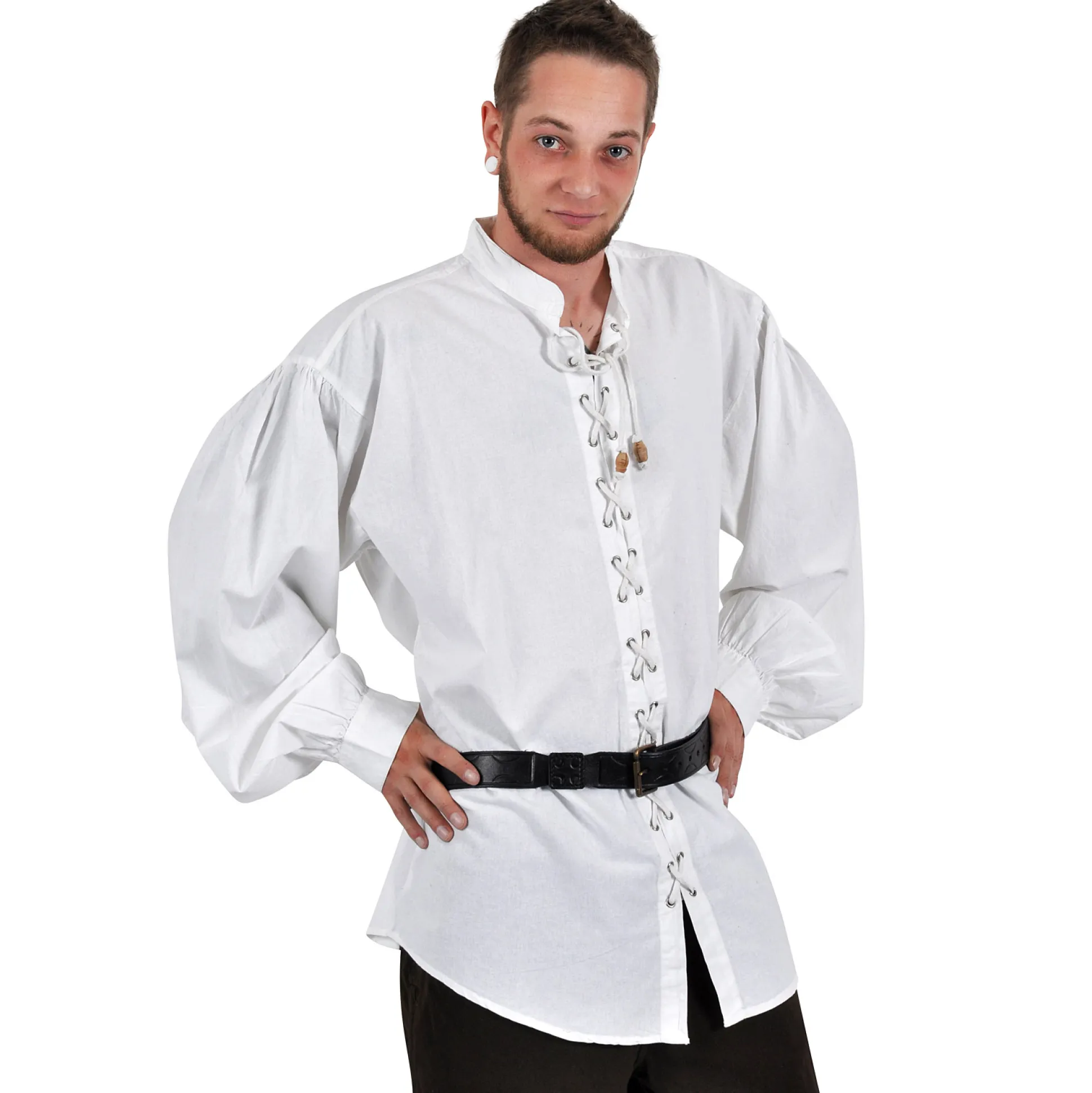 Het hoeft niet altijd de klassieke knoopsluiting te zijn als je voor een overhemd kiest. Veel origineler is de variant met veters, zoals bij dit overhemd, dat zijn middeleeuwse stijl geeft. De blote metalen oogjes schitteren op luchtig wit, dus met dit overhemd maak je de juiste keuze voor de zomer of het volgende middeleeuwse spektakel.