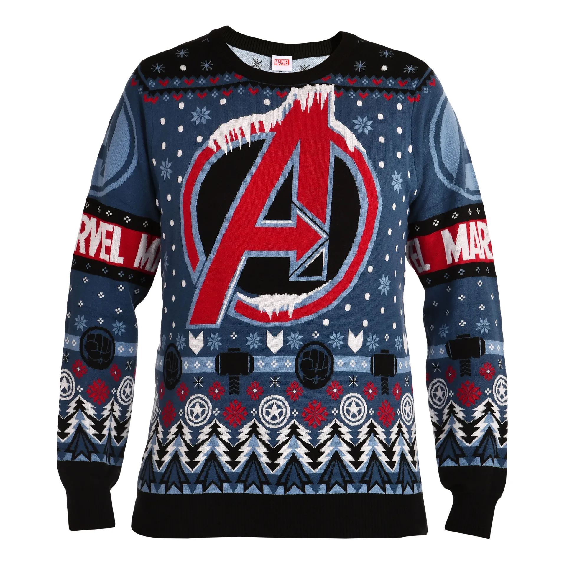 De winter belt: assemble! Deze officieel gelicentieerde Marvel gebreide trui met een ijzig Avengers-logodesign maakt koude dagen heldhaftig. Een Noords patroon rondom — voor én achter — met de logo’s van Hulk, Captain America en Thor loopt over de zachte brei: perfect voor kerstmarkten, kantoorborrels of bankmarathons. De ronde hals en rechte pasvorm zitten relaxed, terwijl brede, stevige boorden de warmte vasthouden. In blauw en zwart past deze foute kersttrui bij jeans, leggings en een spoor van kruimels. Pak je winter-sidekick en geef de boom een scheut superheldengloed.
