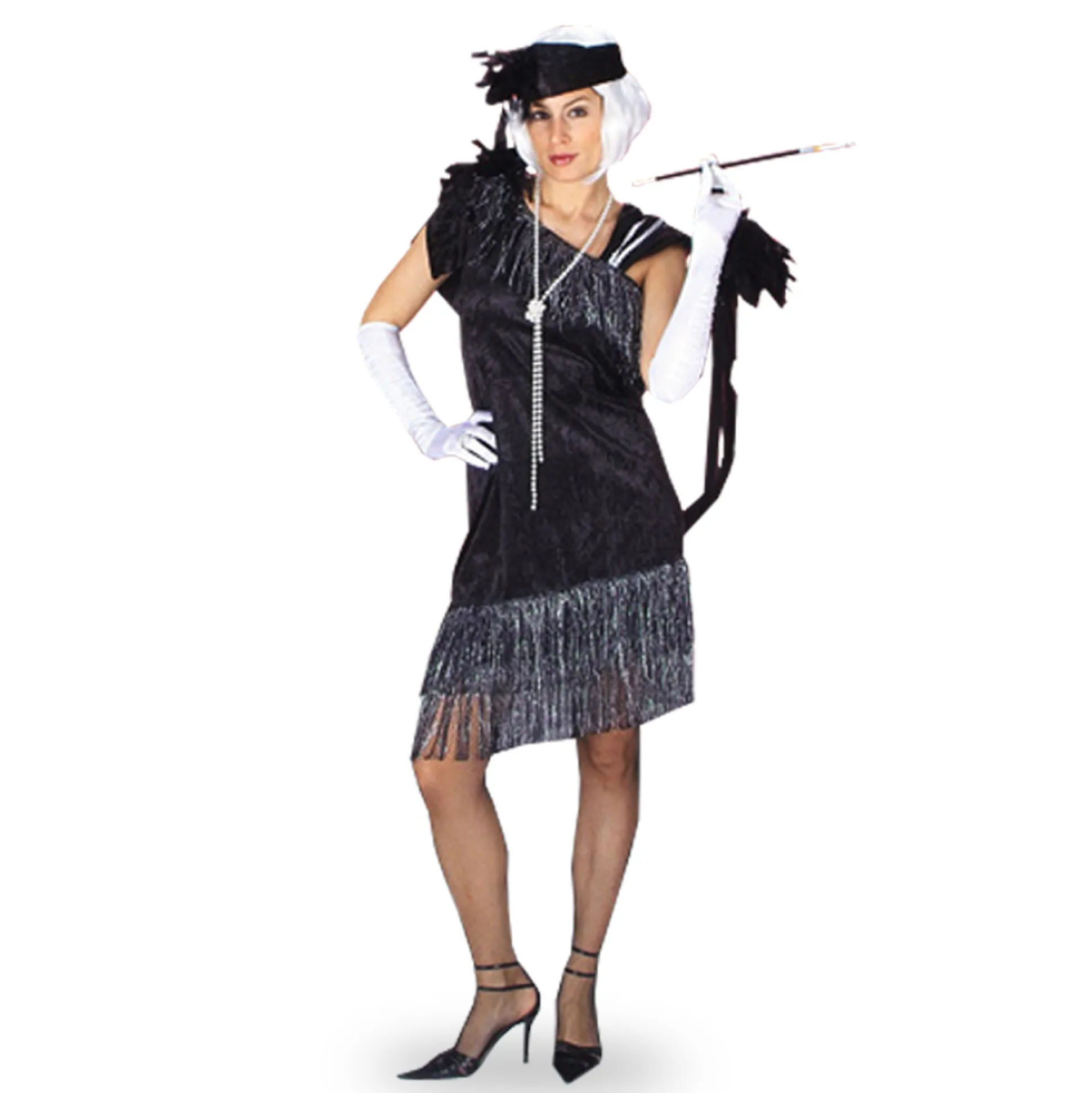 Dit Charleston kostuum bestaat uit de jurk met sjaal en een hoofdband. Het brengt je terug naar de Roaring Twenties. Je bent absoluut perfect gestyled voor een themafeest. De jurk is met liefde voor detail versierd met franjes en veren.