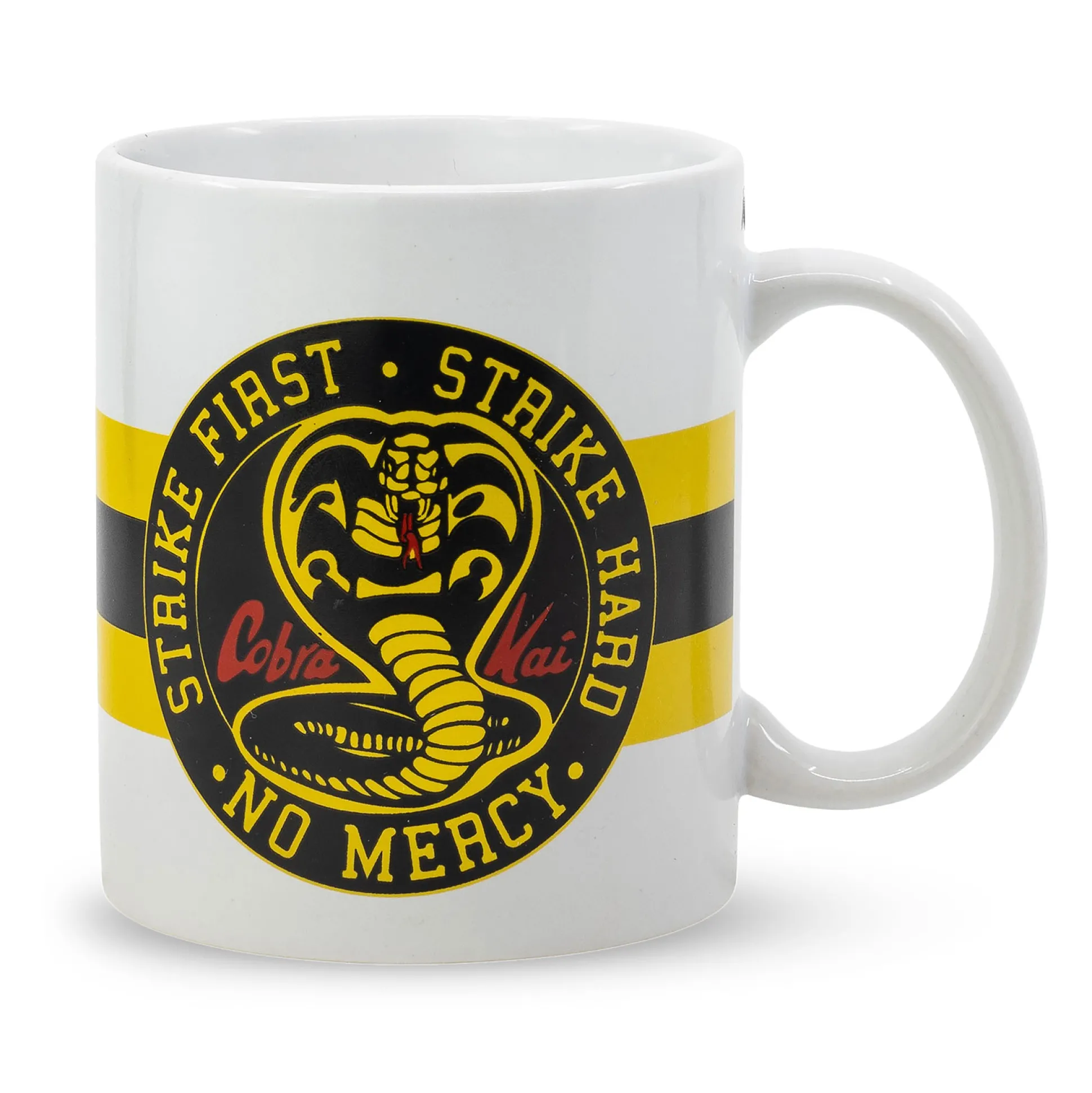 Begin je dag op de Cobra Kai‑manier: Strike First. Strike Hard. No Mercy — voor ochtendmoeheid. Deze witte mok is officieel gelicentieerd en heeft aan beide kanten het logo van de serie Cobra Kai, zodat je dojo‑spirit vanuit elke hoek te zien is. Met een inhoud van 320 ml is hij klaar voor koffie, thee of wat jouw training ook voedt. Vaatwasser‑ en magnetronbestendig, want zelfs door de sensei goedgekeurde mokken mogen handig zijn. Een knaller van een cadeau voor fans en de ultieme desk‑flex voor iedereen die volgens het motto leeft: No Mercy.