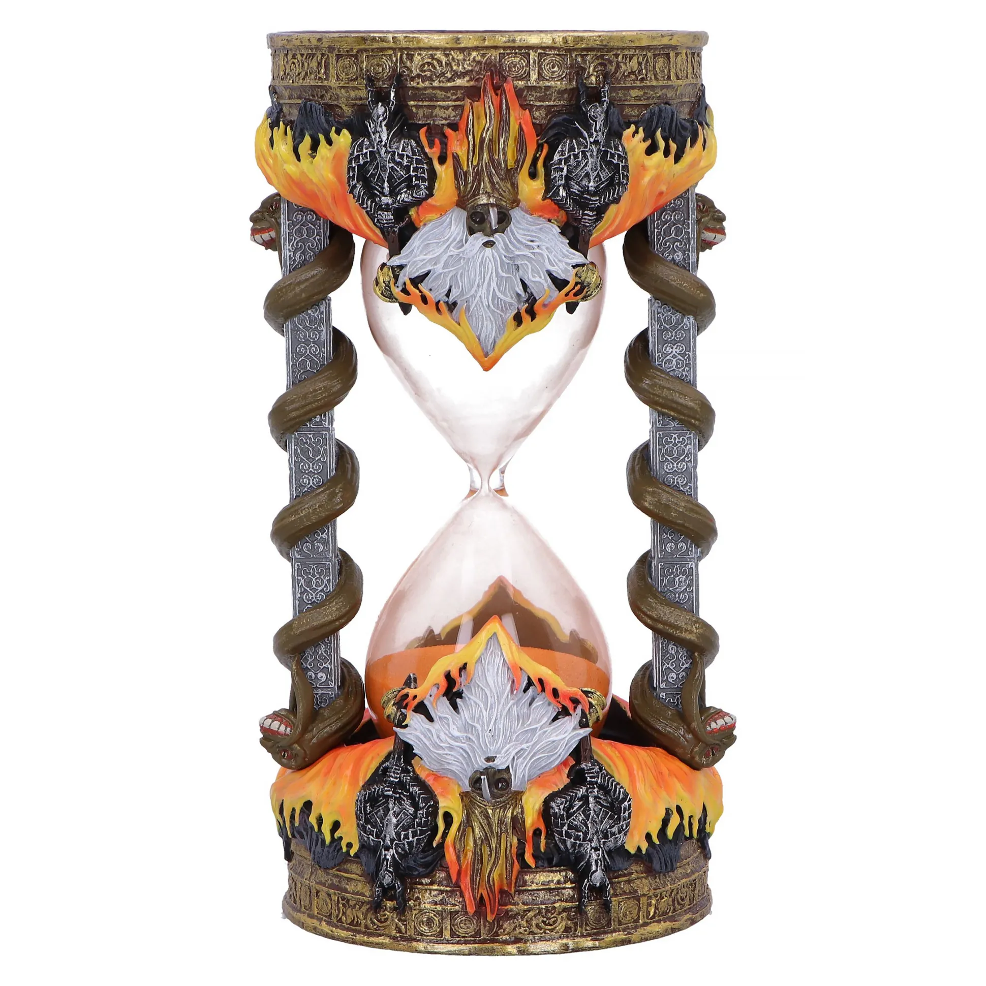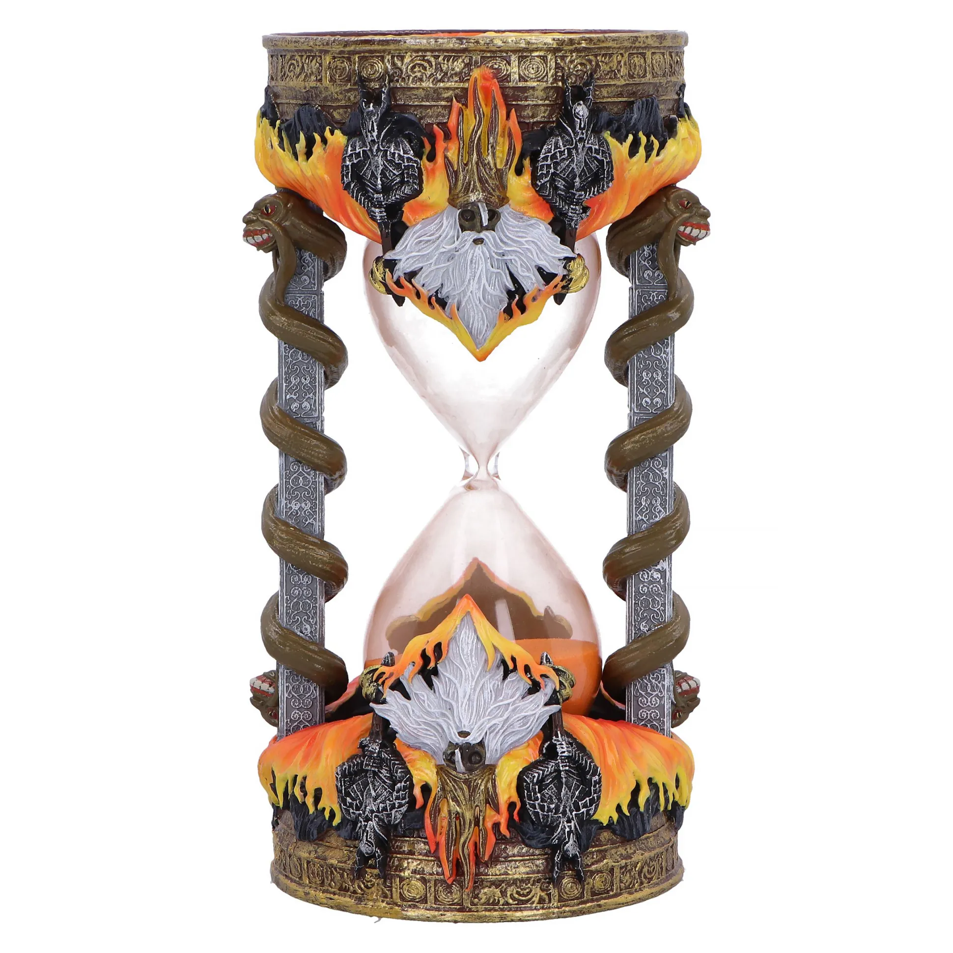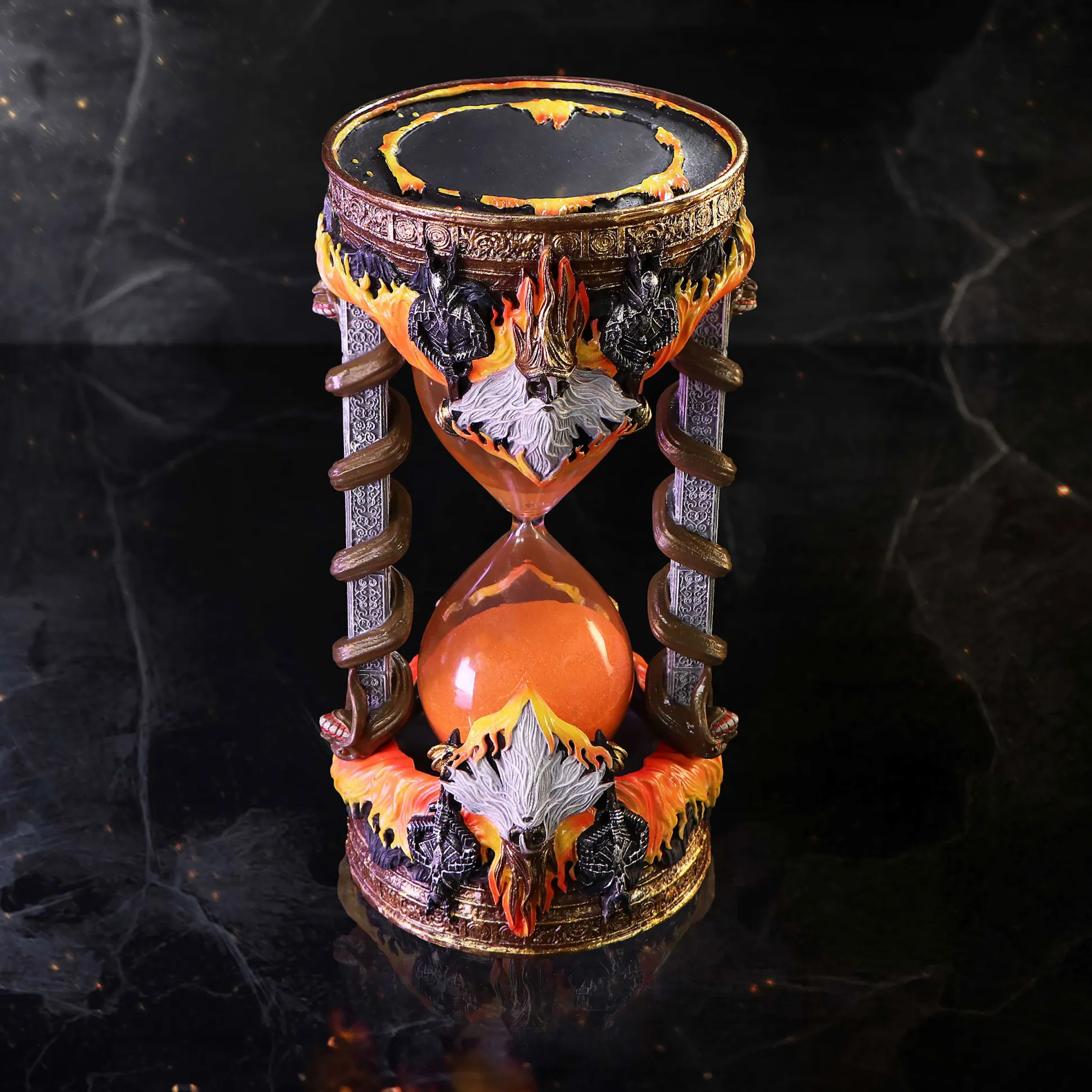 Hoeveel seconden heb jij nodig om “You Died” te lezen? Met deze officieel gelicenseerde Dark Souls zandloper in het ontwerp van Gwyn, Heer van het Zonlicht kun je dat eindelijk precies uitvinden – helemaal in Souls-stijl. De zandloper wordt omringd door slangenachtige zuilen die direct doen denken aan de mysterieuze slangen uit Firelink Shrine, en overal zitten vuurgerelateerde details die Gwyns brandende aanwezigheid perfect vangen. Met een hoogte van 17,5 cm past hij moeiteloos op je bureau, op een geïmproviseerd zonaltaar of tussen je verzameling game-relics, en valt hij toch flink op. Elke zandloper is rijk aan details en met de hand beschilderd, waardoor hij oogt als een echt relikwie uit Lordran – maar dan zonder dat je je eerst door een dodelijke kerker hoeft te vechten. Of je hem nu gebruikt als timer voor je volgende boss-poging, als sfeervolle decoratie voor je gaming-setup of als stille reminder dat elke seconde telt, deze Gwyn-zandloper haalt de duistere Dark Souls-sfeer rechtstreeks naar je huis, zonder dat je daarbij ook maar één ziel kwijtraakt.