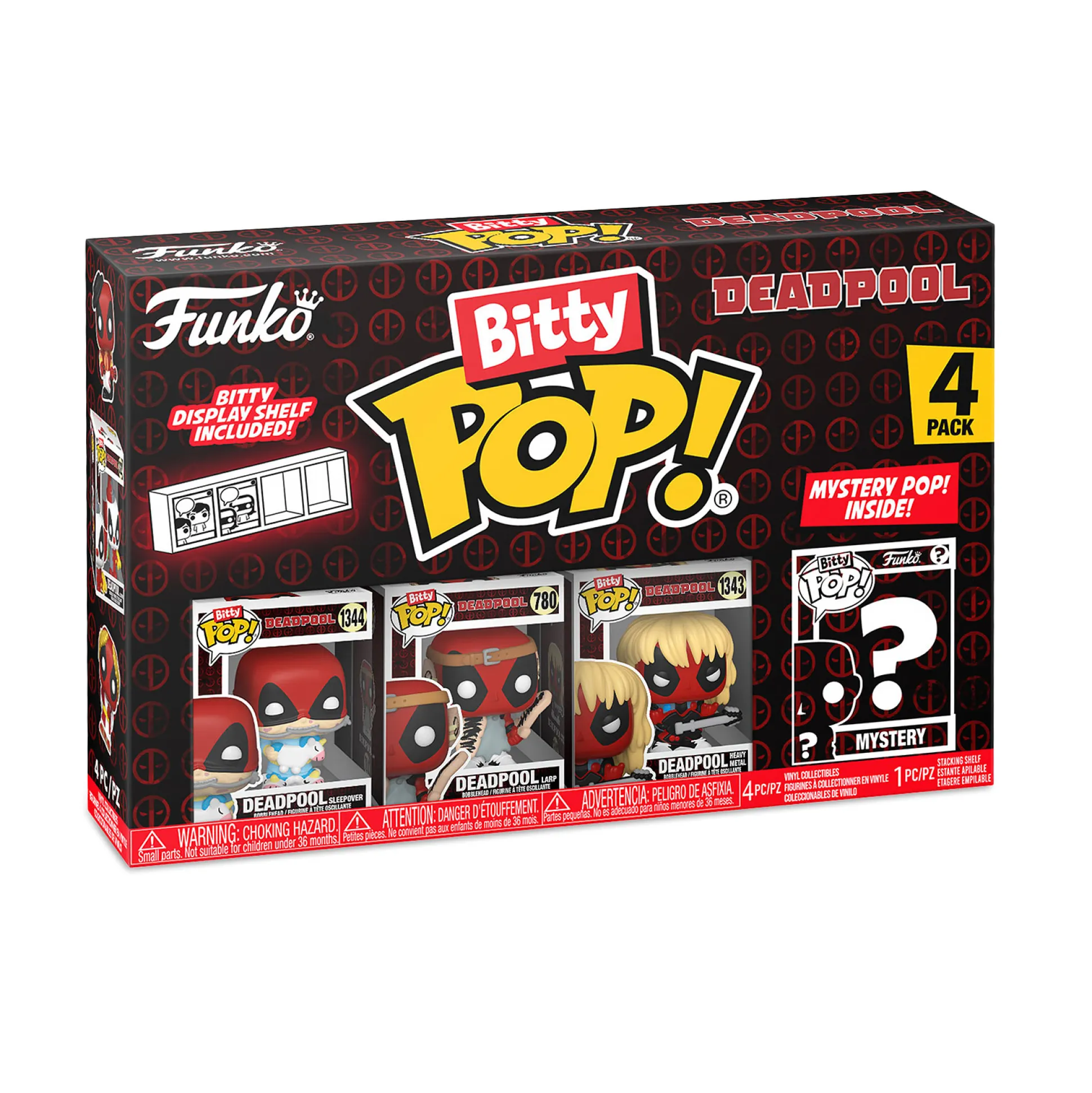 - bevat 4 Deadpool Funko Pop figuren: Heavy Metal, Rollenspel, Pyjama en 1 Mystery Figuur