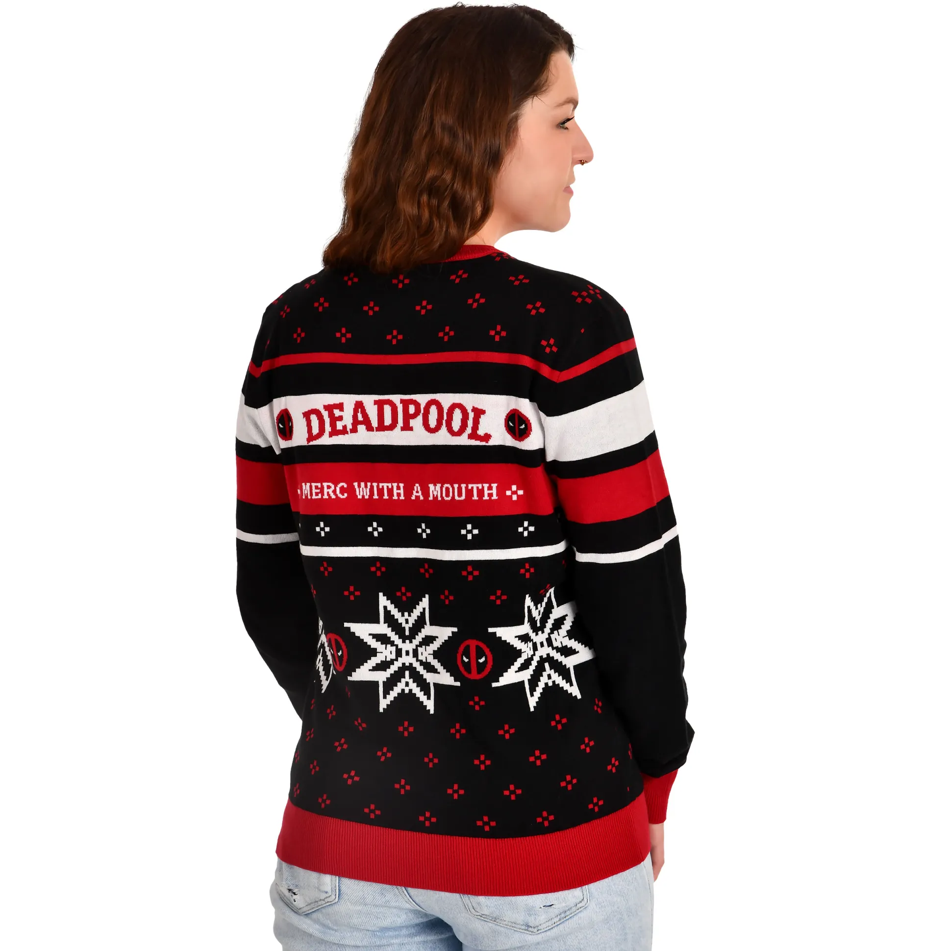 Ho-ho-holy chimichangas! Deze officieel gelicenseerde Marvel ugly Christmas sweater (foute kersttrui) haalt Deadpool naar jouw feestdagen.