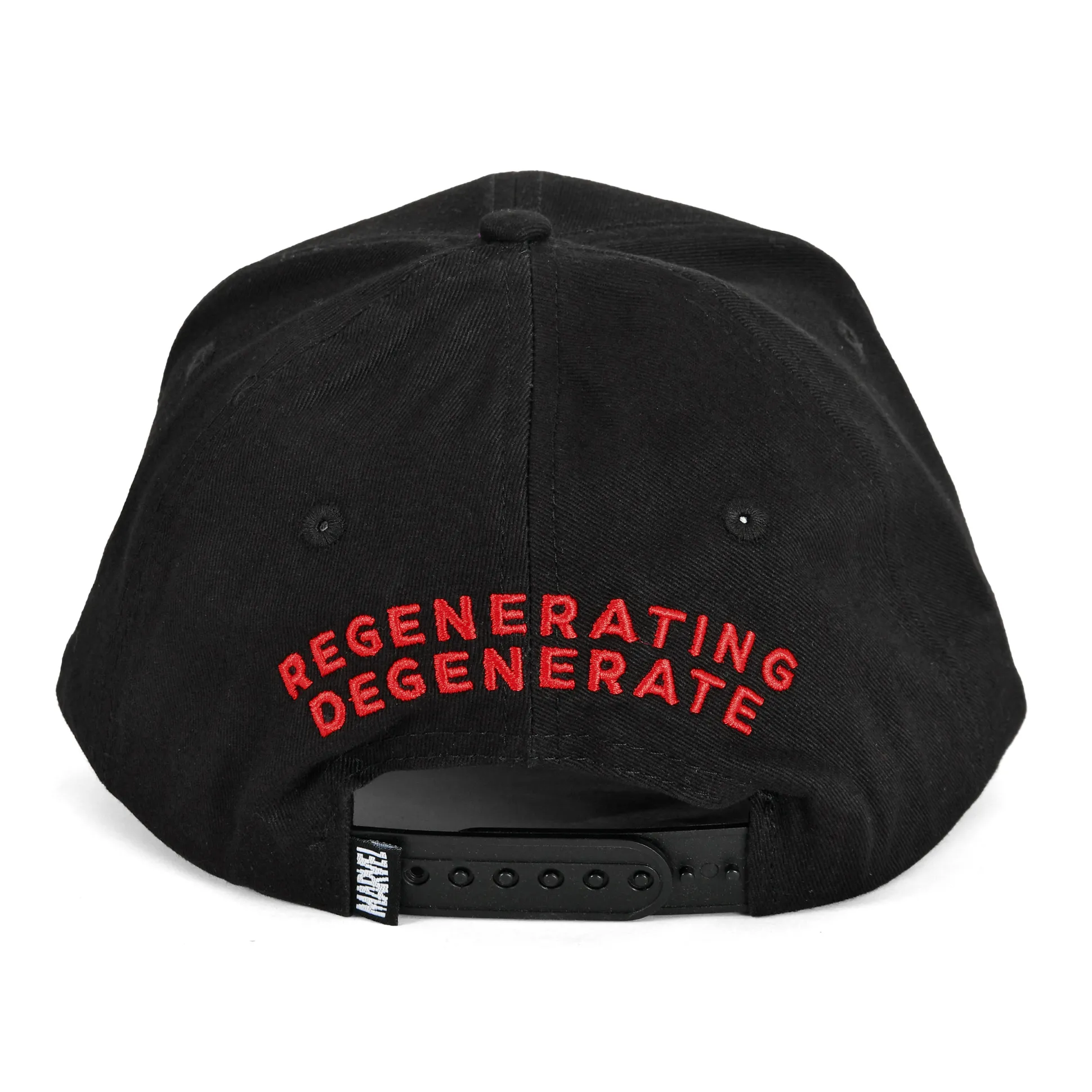 Kop omhoog, held: met deze officieel gelicentieerde Marvel-snapback zet je Deadpool precies waar hij hoort — op je voorhoofd. Het iconische logo springt eruit met 3D-borduurwerk voorop; achterop is ‘Regenerating Degenerate’ geborduurd, typisch Wade Wilson. De zwarte pet past overal bij, en dankzij de verstelbare drukknoopsluiting zit hij goed van chimichanga-run tot bingewatch-avond. Maximale attitude, minimale moeite: pet op, wereld uit.