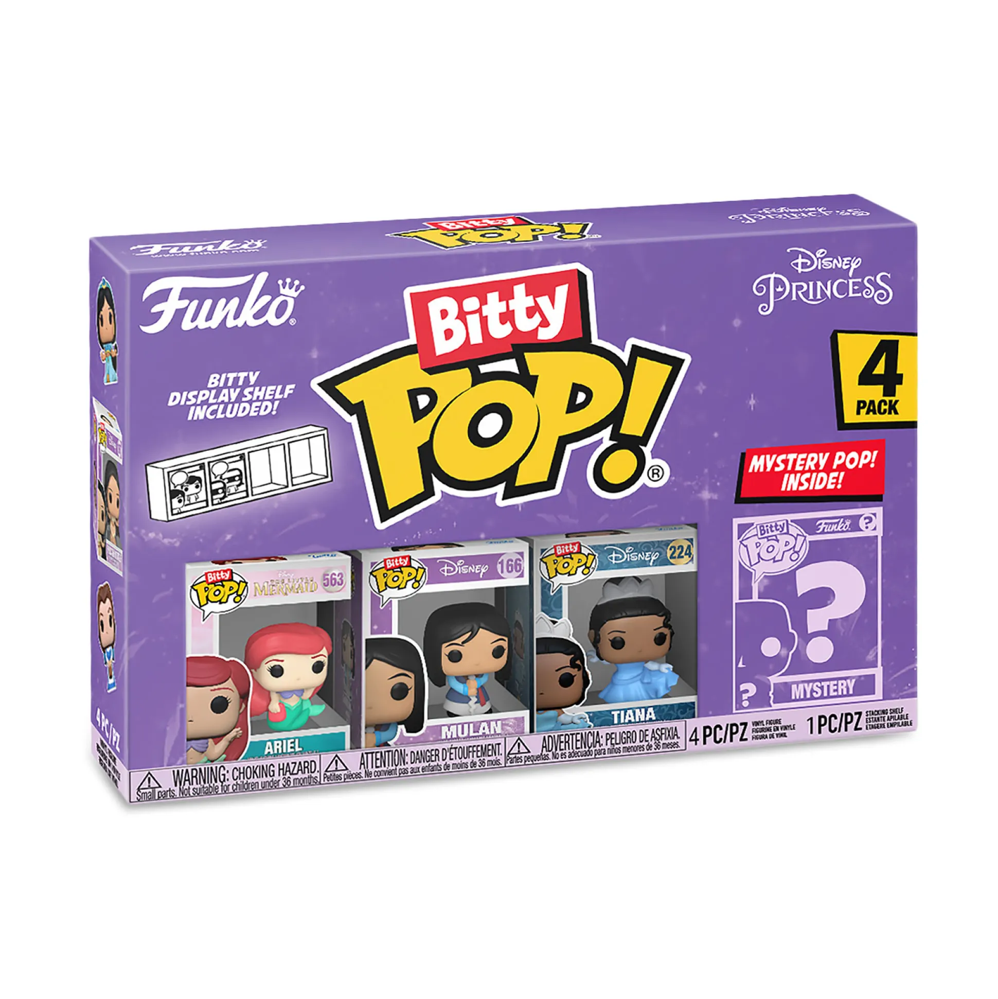 - bevat 4 Funko Pop figuren: Ariel, Mulan, Tiana en 1 mysterie figuur