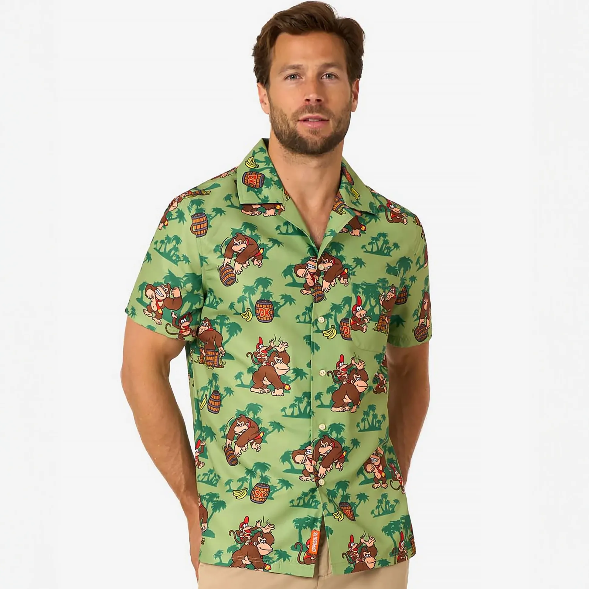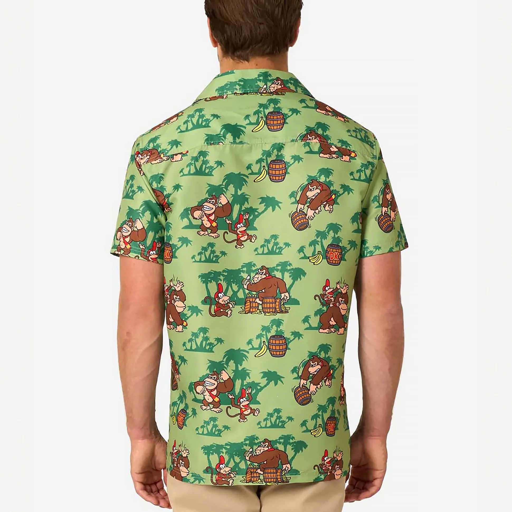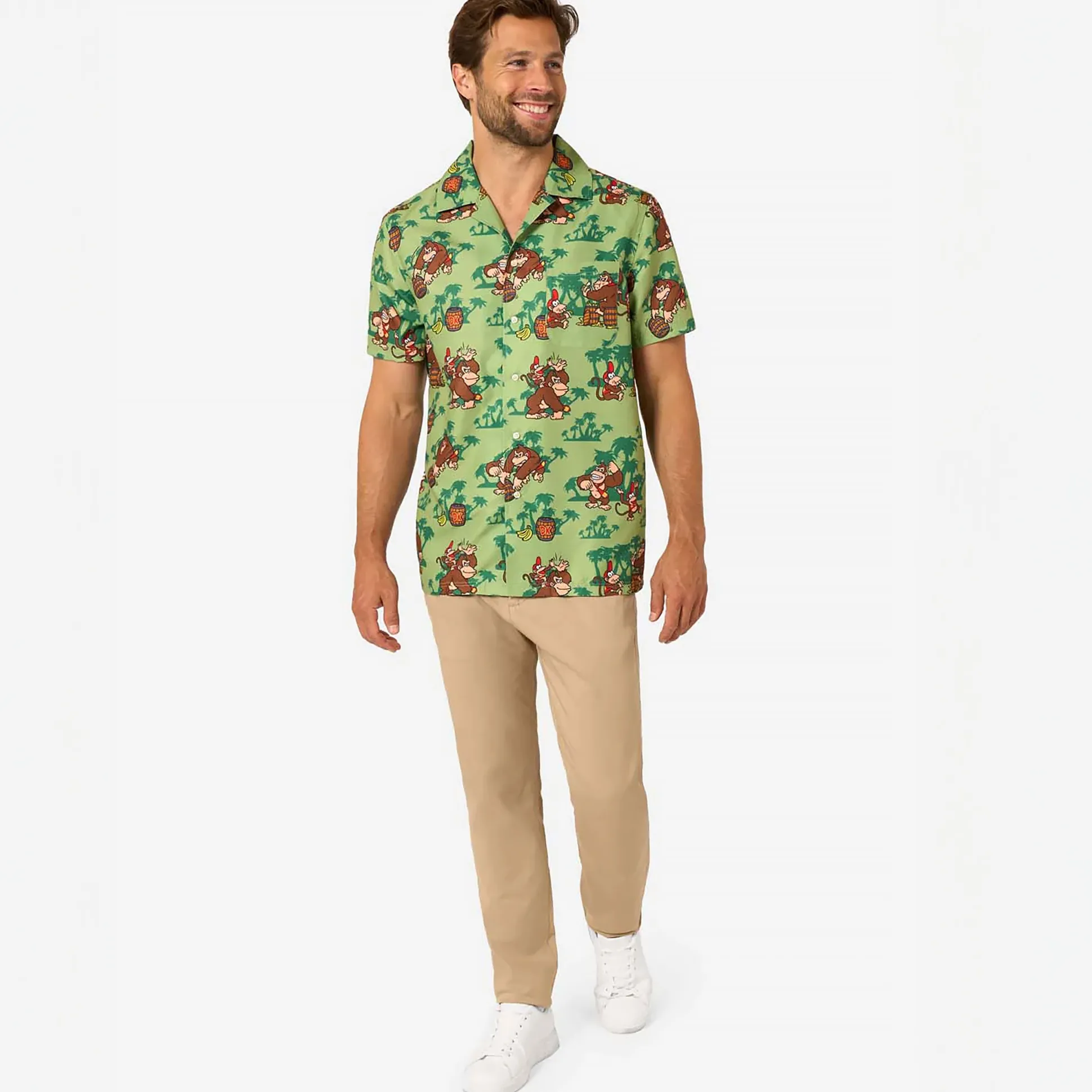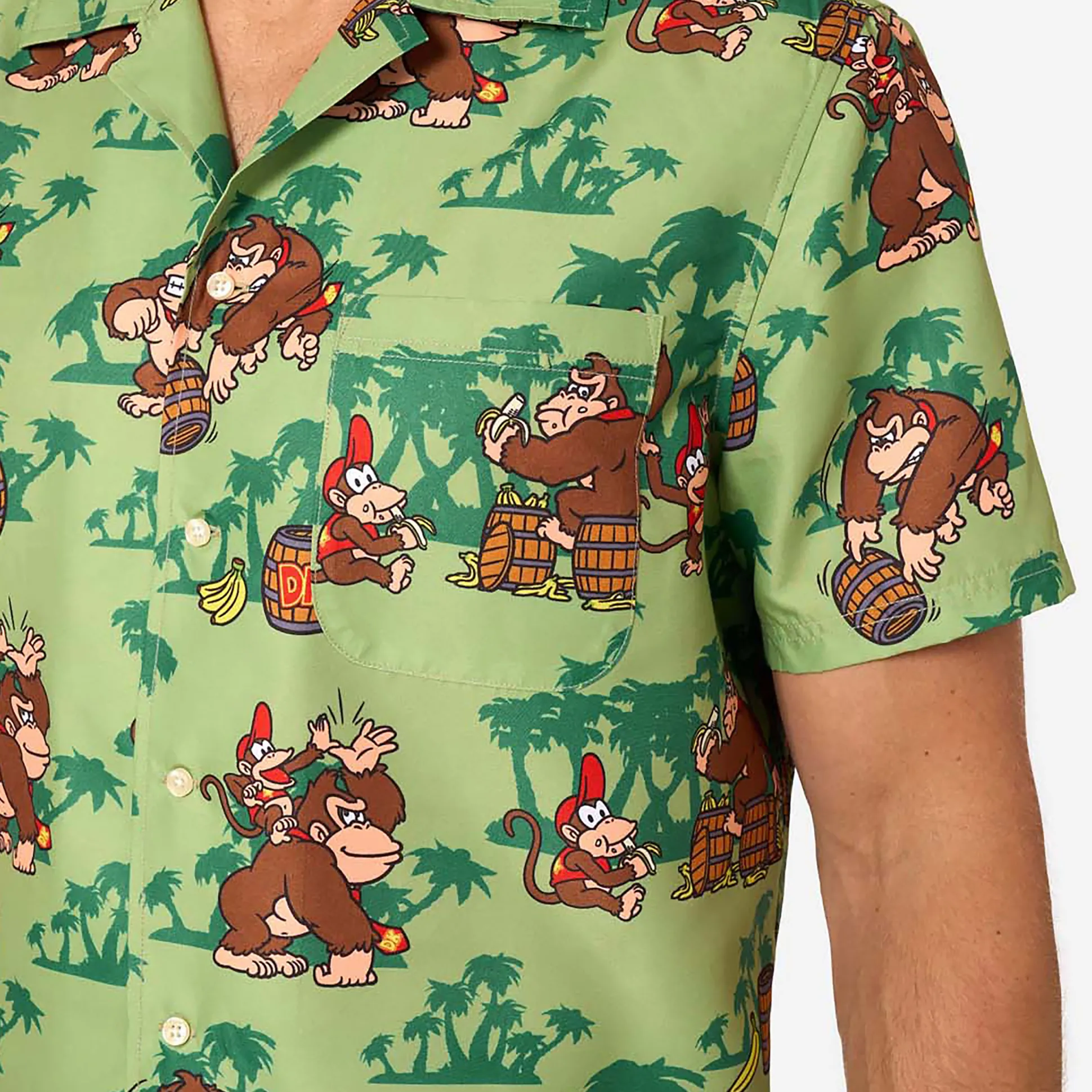 Helemaal vol met Donkey Kong-motieven, diep junglegroen, korte mouwen voor maximale bananen-slinger-vrijheid – plus een borstzak voor alles wat echt belangrijk is: munten, snacks of gewoon je telefoon.