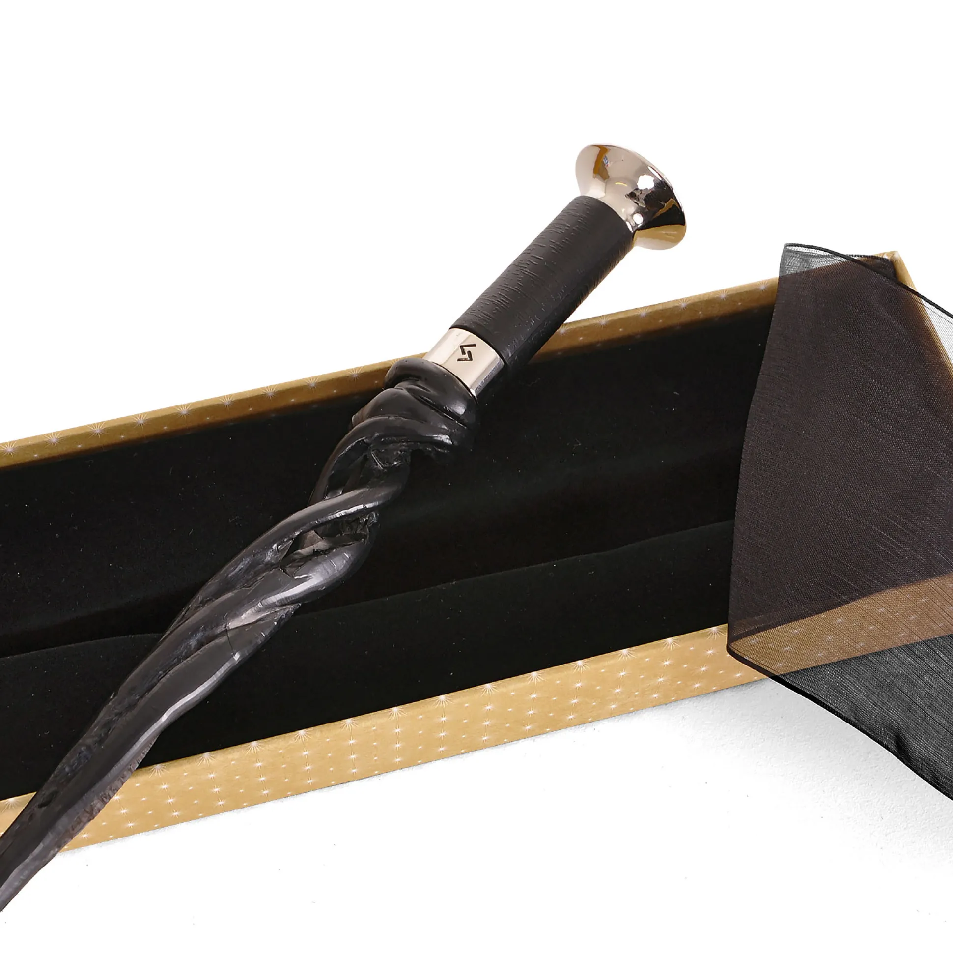 Met de toverstaf van Albus Dumbledore haal je niet alleen een geweldige filmrekwisiet vol magische details in huis, maar ook een betekenisvol stukje tovenaarsgeschiedenis. De staf is gedetailleerd afgewerkt en valt vooral op door zijn bijzondere, gedraaide vorm. De greep is voorzien van zilverkleurige elementen met ingegraveerde runachtige ornamenten. Hij ligt prettig in de hand en is gemaakt van Cold Cast, een speciaal kunststof.