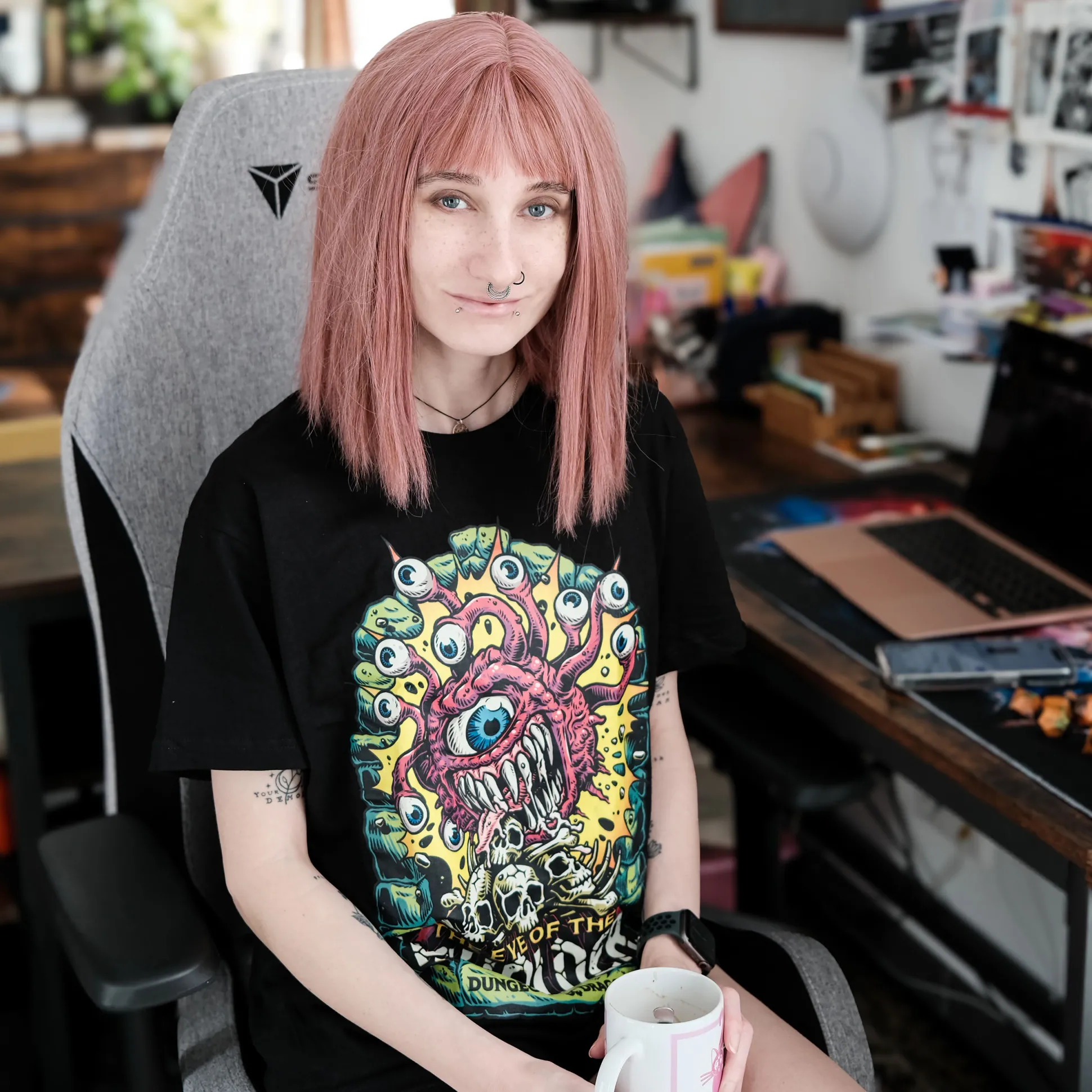 Neem het oog dat alles ziet mee naar je volgende sessie: dit officieel gelicentieerde Dungeons & Dragons T-shirt zet een Beholder groot en dreigend midden op je borst — en serieus stijlvol. Zwarte stof, rechte pasvorm en een ronde hals zorgen voor comfort tijdens lange campagnes aan tafel, in de taverne of wanneer de eindbaas genaamd het dagelijks leven opduikt. Combineer met je favoriete harnas (jeans) en je reddingsworpen tegen slechte smaak worden een natural 20.
