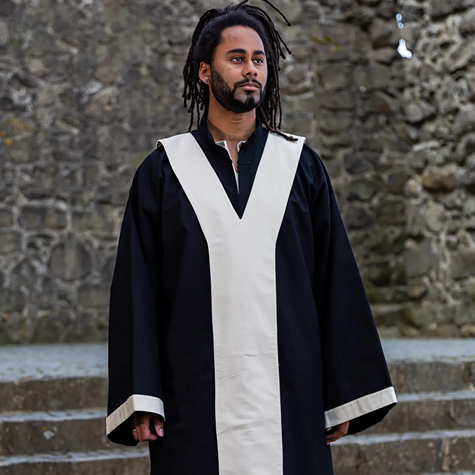 Je volgende sessie belt: dit tovenaarsgewaad in middeleeuwse stijl uit de ‘D&D Call to Arms’-collectie haalt Dungeons & Dragons zo je kledingkast in. Zwart/naturel, clean en klaar voor avontuur — en ja, ook zonder spreukenboek staat ’ie fantastisch. De opstaande kraag heeft een split en lusjes zodat je ’m kunt sluiten of je favoriete broche kunt vastmaken. De brede band aan de voorkant kan op de schouder worden bevestigd en de contrasterende mouwzoom maakt het af. Perfect voor pen-en-paper-avonden, cons, LARP of je dagelijkse tocht naar de taverne: aantrekken, episch ogen, initiatief gooien.