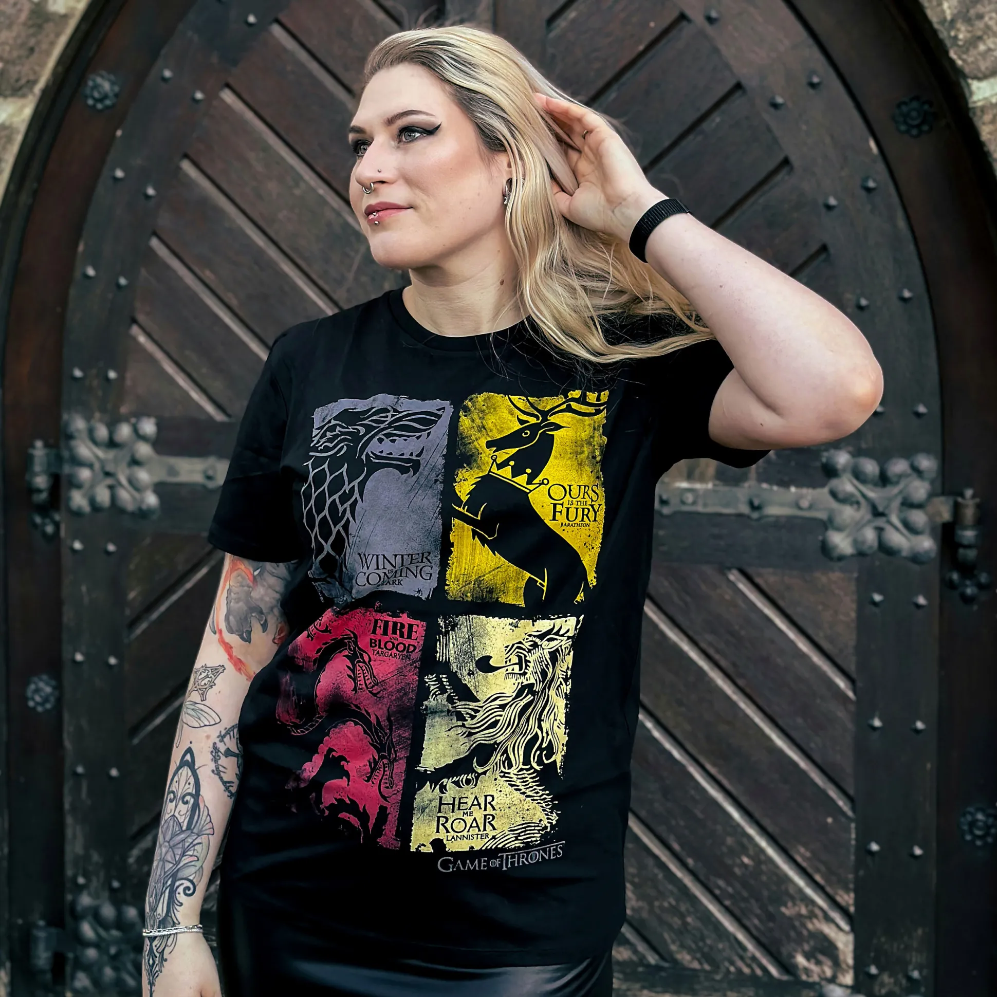 Je hoeft niet te kiezen, want hier krijg je ze allemaal tegelijk: de grootste en belangrijkste huizen uit de hitserie ‘Game of Thrones’. Gepresenteerd door hun expressieve wapenschilden met de bijbehorende motto’s. De schaduwwolf van de Starks blijft heel rustig naast het gekroonde hert van de Baratheons, de driekoppige draak van het huis Targaryen kan (nog) heel goed opschieten met de trotse leeuw van de Lannisters.