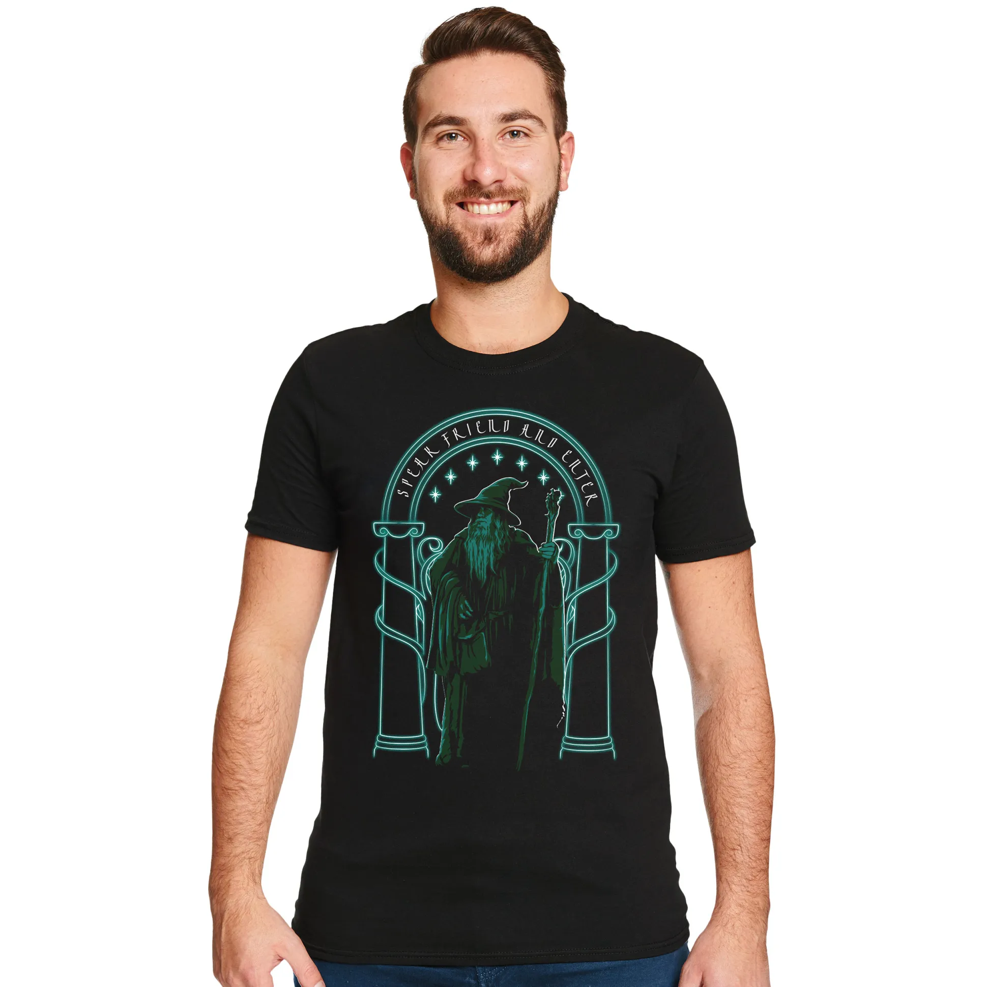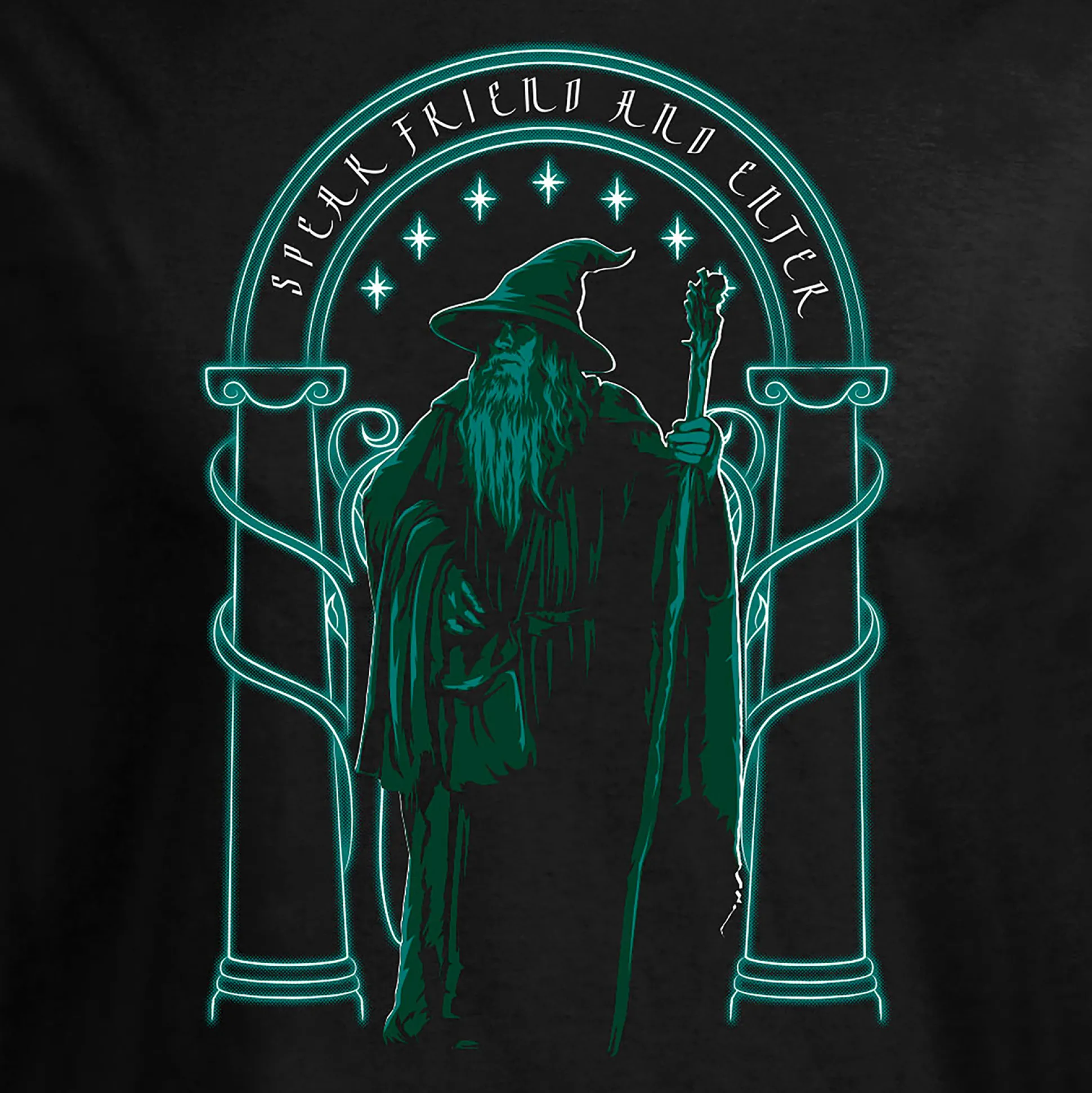 Zeg ‘Mellon’ en je outfit stapt zo de legende binnen. Dit officieel gelicentieerde In de Ban van de Ring‑T‑shirt heeft een grote frontprint van Gandalf voor de Poorten van Durin, alsof Moria elk moment opengaat. Zwart, regular fit, klassieke ronde hals – past overal bij, van filmmarathons tot college. Een duidelijk fan‑statement, geen Balrog nodig. Voor iedereen die Midden‑aarde graag op de borst draagt.