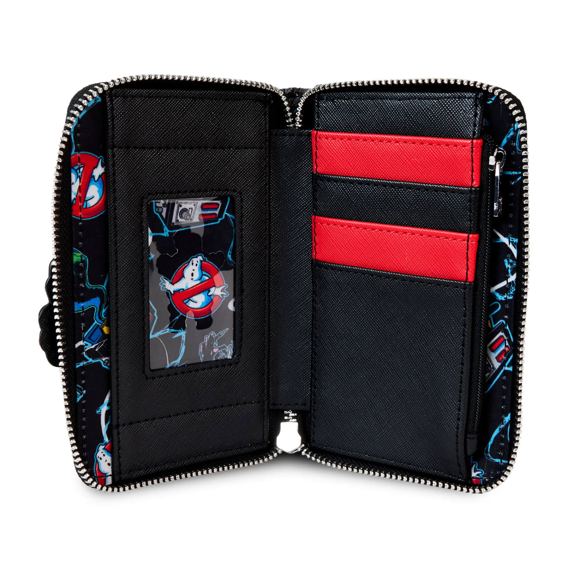 Praktisch tot in het laatste vakje: 4 kaartvakken, 1 fotovak, een muntvak met ritssluiting en een veilige rondom‑ritssluiting. Binnenin een bedrukte voering; achterop een metalen Loungefly‑label. Afmetingen: 15,5 x 2,5 x 10 cm – het perfecte cadeau voor Ghostbusters‑fans.
