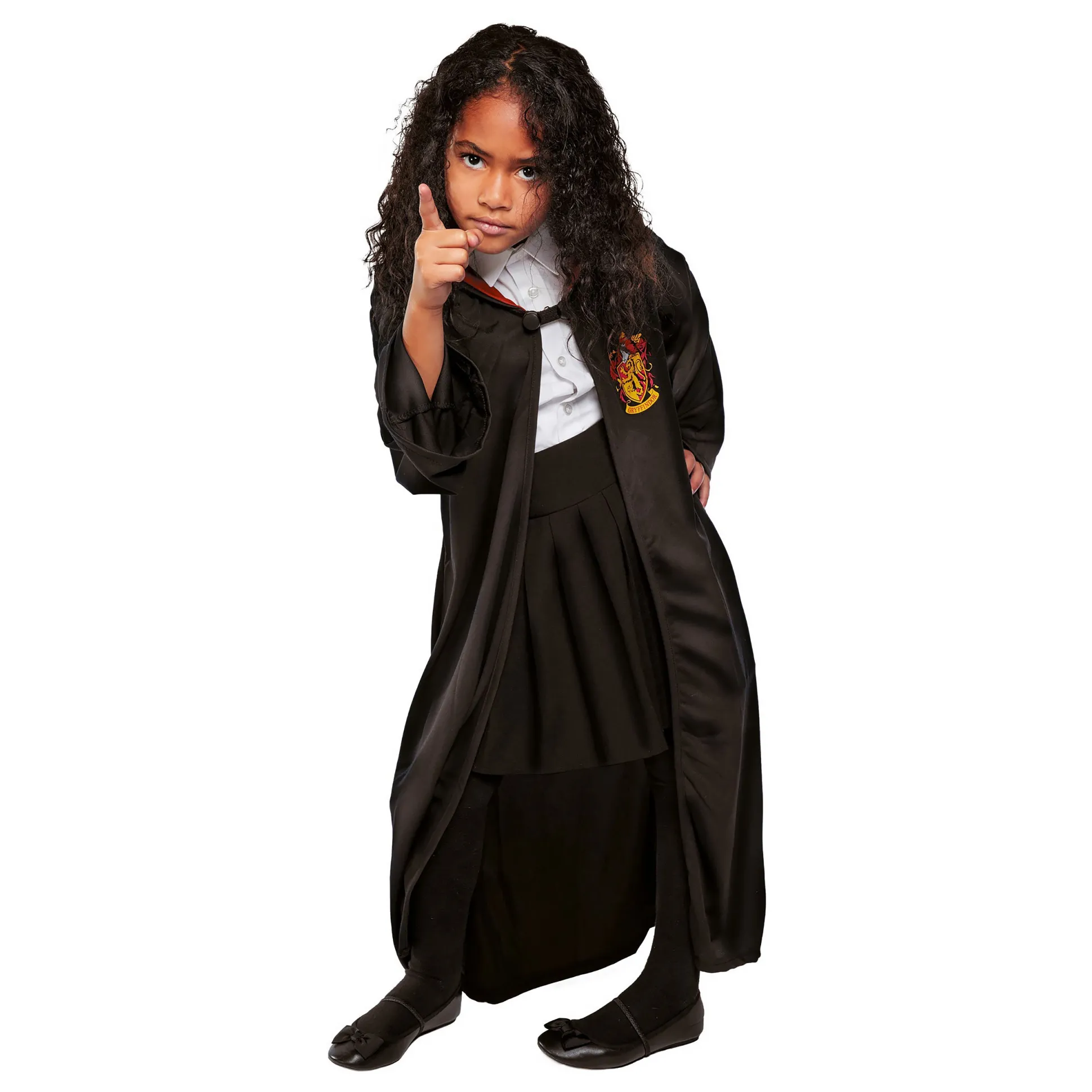 De zwarte mantel heeft een groot Griffoendor-wapen op de borst, zodat meteen duidelijk is bij welk Huis jouw jonge heks of tovenaar hoort. De puntkap zorgt voor een dramatische entree op het schoolplein of tijdens carnaval, en de sluiting aan de voorkant houdt alles netjes op zijn plek – ook tijdens fanatieke „Wingardium Leviosa“-oefensessies.