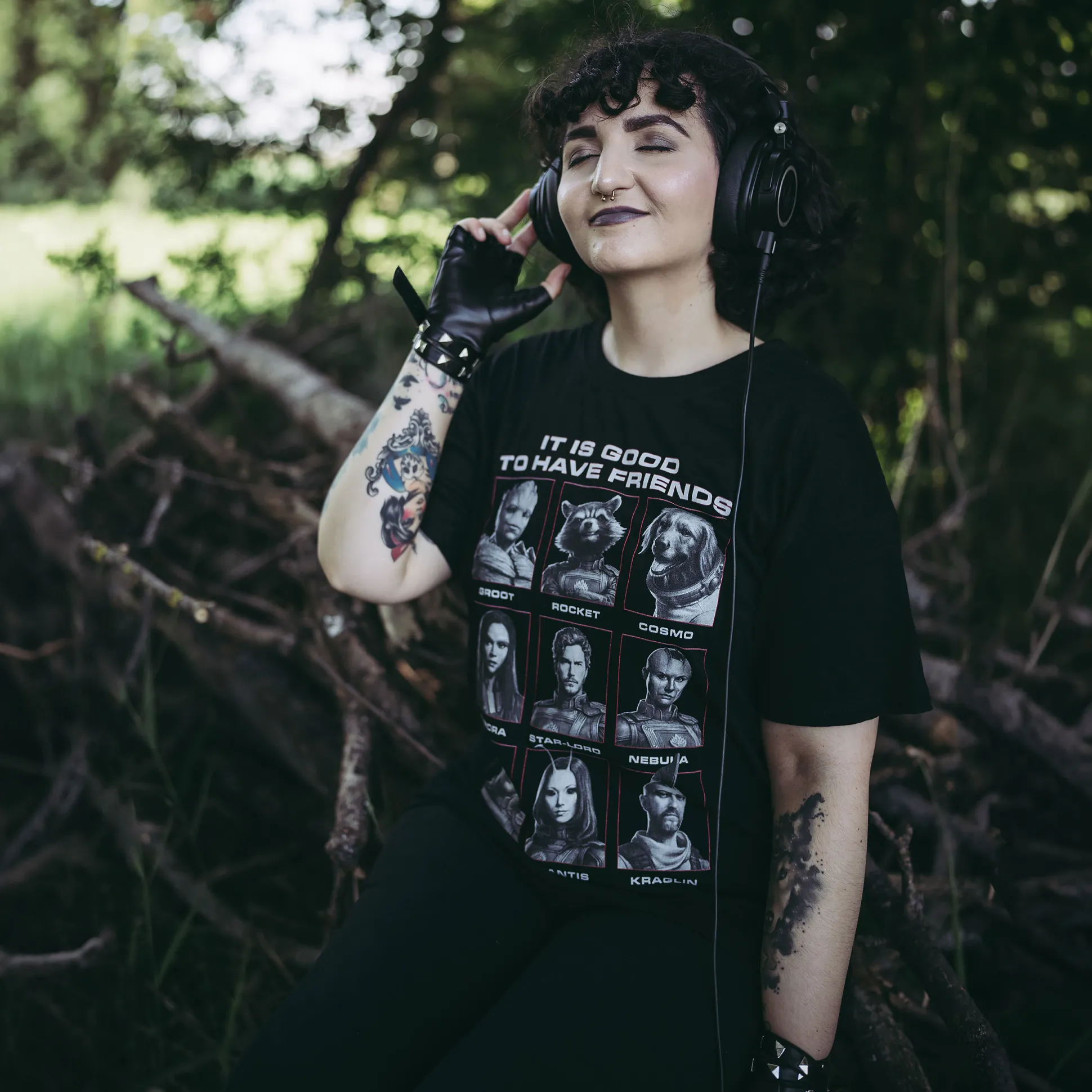 Goede vrienden, grote chaos: dit officieel gelicentieerde Marvel Guardians of the Galaxy T-shirt zet de hele crew op je borst. Groot, Rocket, Cosmo, Gamora, Star-Lord en Mantis staan groot als portretprint op de voorkant — Awesome Mix-vibes inbegrepen. Met rechte pasvorm, klassieke ronde hals en diepzwart is het jouw allrounder voor filmavonden, cons of even snel de melkweg redden tussen de snacks door. Aantrekken, op Play drukken en de squad laat van zich horen — geen vertalerhalsband nodig.