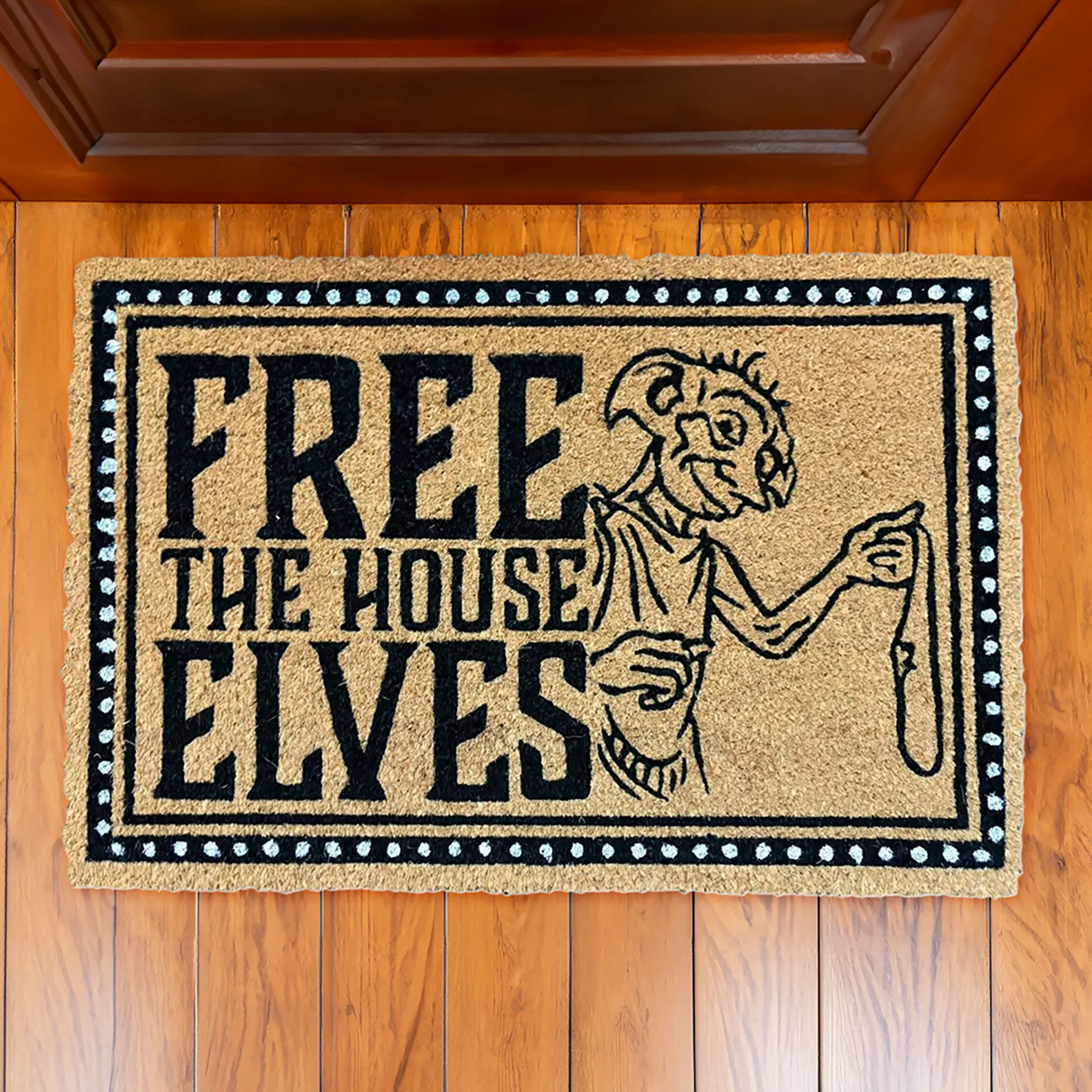 Maak van je voordeur een sokvriendelijke zone voor huiselfen: deze officieel gelicentieerde Harry Potter-deurmat toont Dobby met zijn iconische sok en de oproep “Free the House Elves”. Hij heet je gasten welkom, houdt vuil tegen en blijft keurig liggen dankzij de met kunststof gecoate, antislip-onderzijde. Licht- en waterbestendig, zodat hij er na talloze bezoeken nog steeds uitziet alsof hij net uit de Wegisweg komt. Met 60 x 40 x 1,7 cm past hij voor bijna elke deur – van een Dreuzelappartement tot de Griffoendor-gemeenschappelijke ruimte. Subtiel je liefde voor Zweinstein tonen? Laat Dobby de wacht houden – en je vloeren schoon.