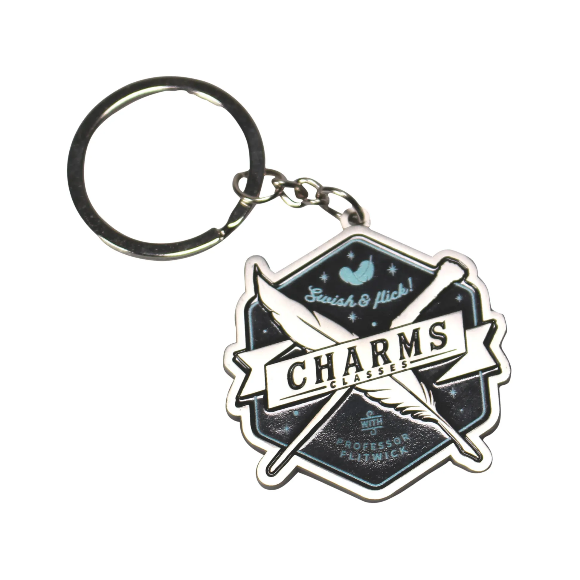 Swish, flick — sleutels kwijt? Niet met jou. Deze officieel gelicentieerde Harry Potter-sleutelhanger brengt de les Toverformules naar je dagelijks leven: retrodesign met de tekst “Swish & Flick! Charms Classes with Professor Flitwick”. Hij laat je sleutels niet zweven (daar is Wingardium Leviosa voor), maar houdt ze wel netjes bij elkaar: sleutelring Ø 3,2 cm, totale lengte 9,7 cm — ideaal voor broekzak, rugzak en bezemritten.