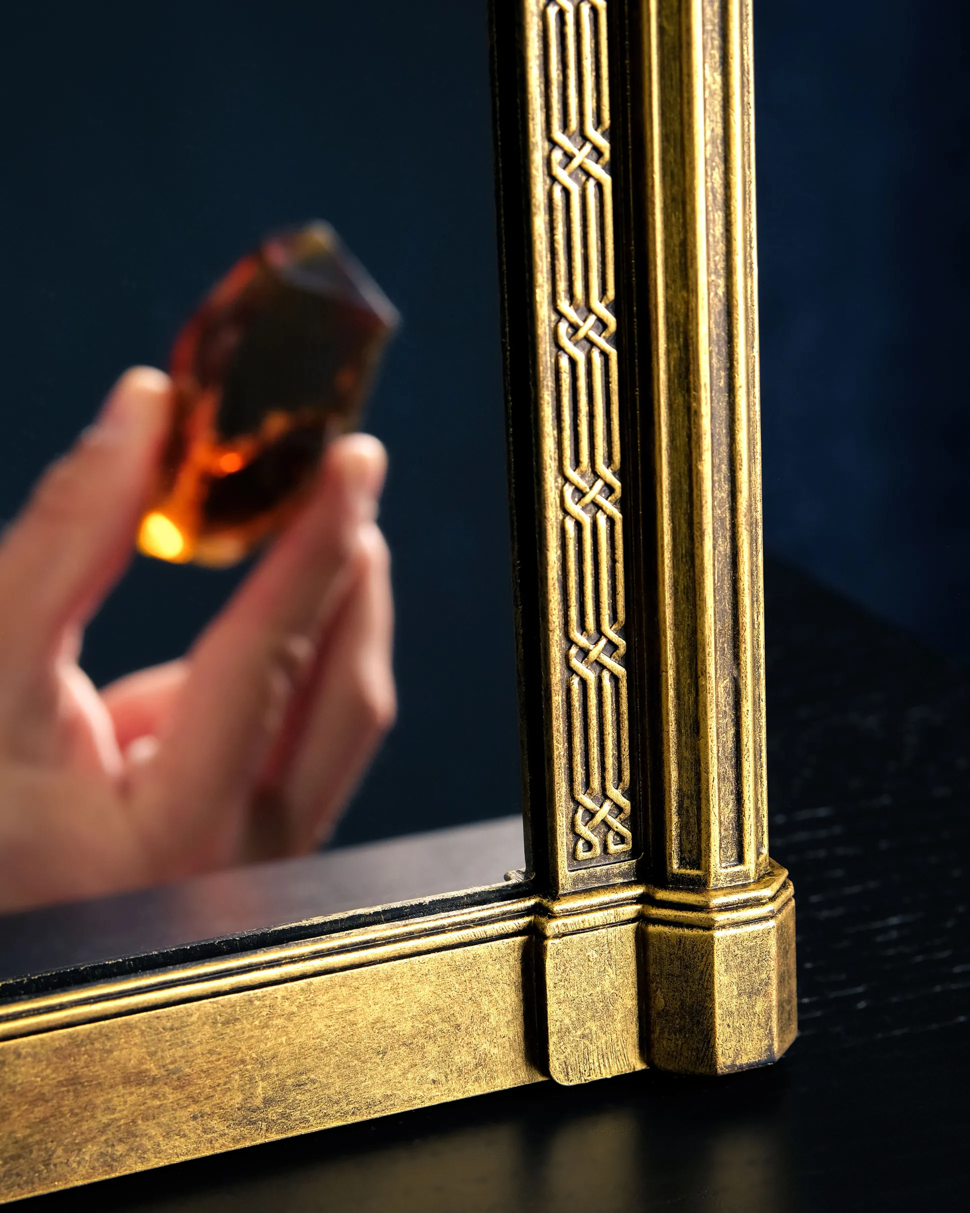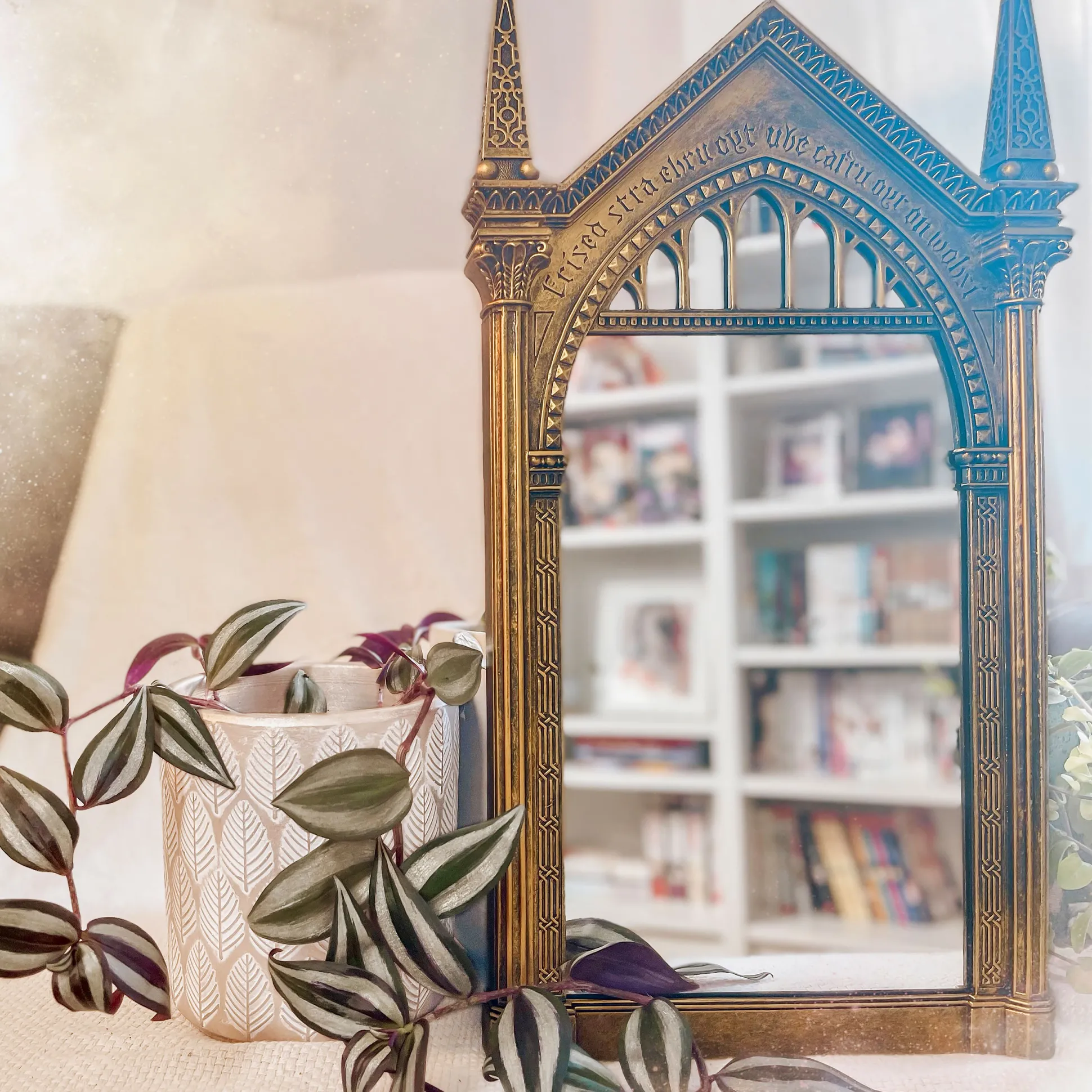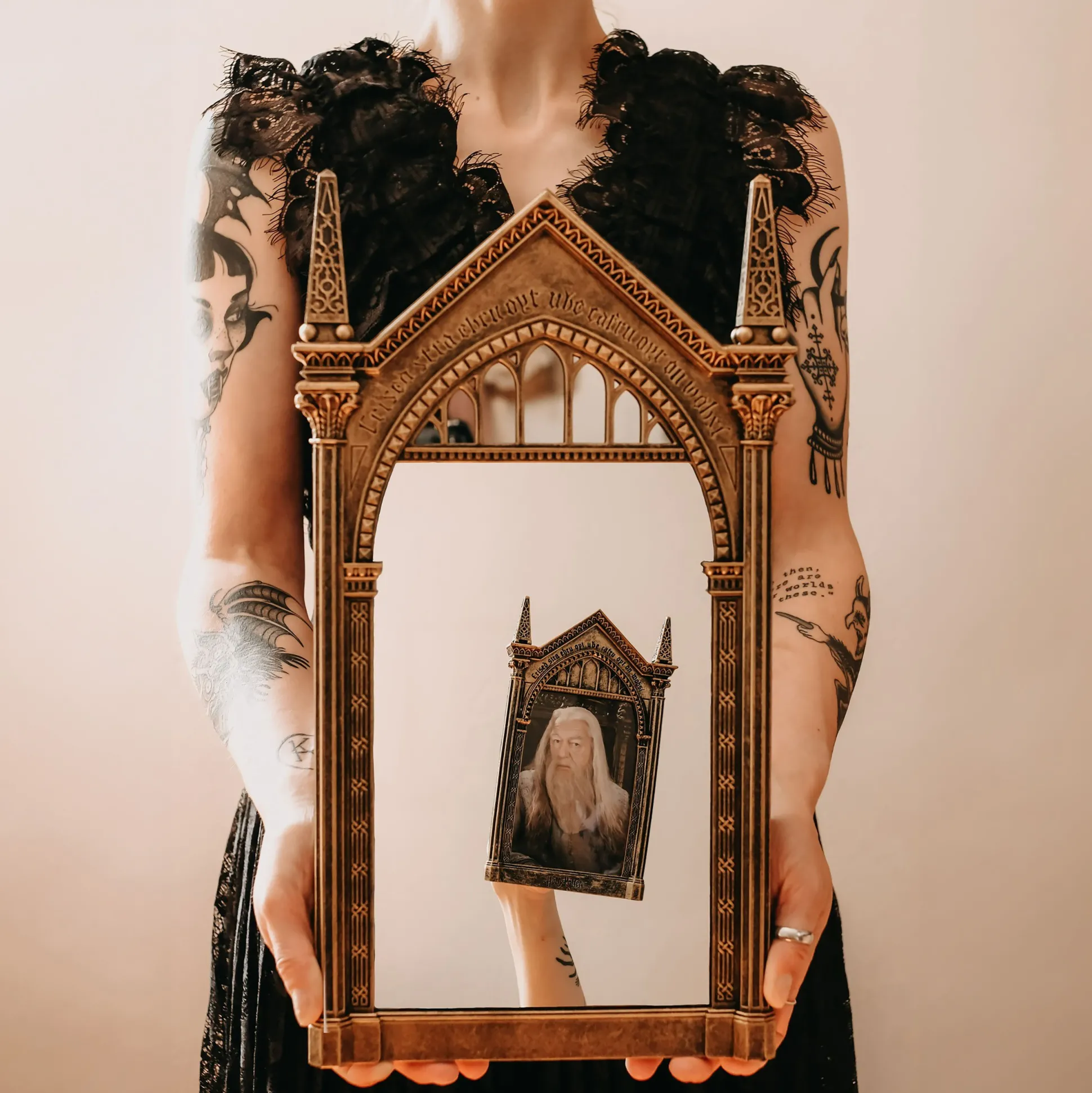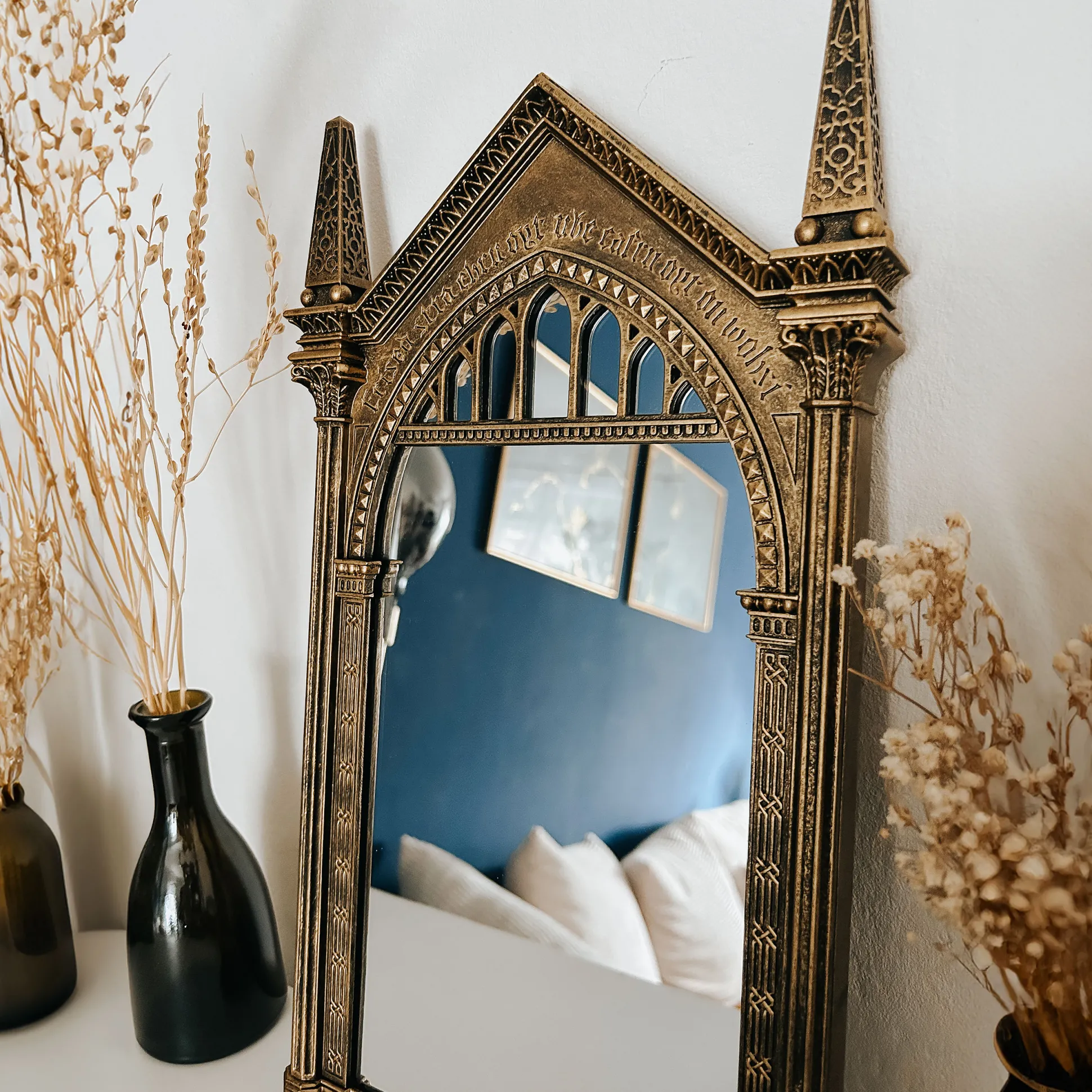 Wanneer je in deze spiegel kijkt, zie je niet je eigen spiegelbeeld – maar je diepste verlangens. Nou ja, bijna. Deze zorgvuldig gedetailleerde replica van de beroemde Spiegel van Neregeb uit de Harry Potter-wereld brengt pure magie in je huis. Het kunstig versierde frame, de mysterieuze inscriptie en het authentieke ontwerp maken het tot een van de meest iconische fanartikelen ooit. Stel je nu eens voor: je komt thuis, de spiegel hangt daar – en elke keer voel je je een beetje alsof je in Zweinstein bent.