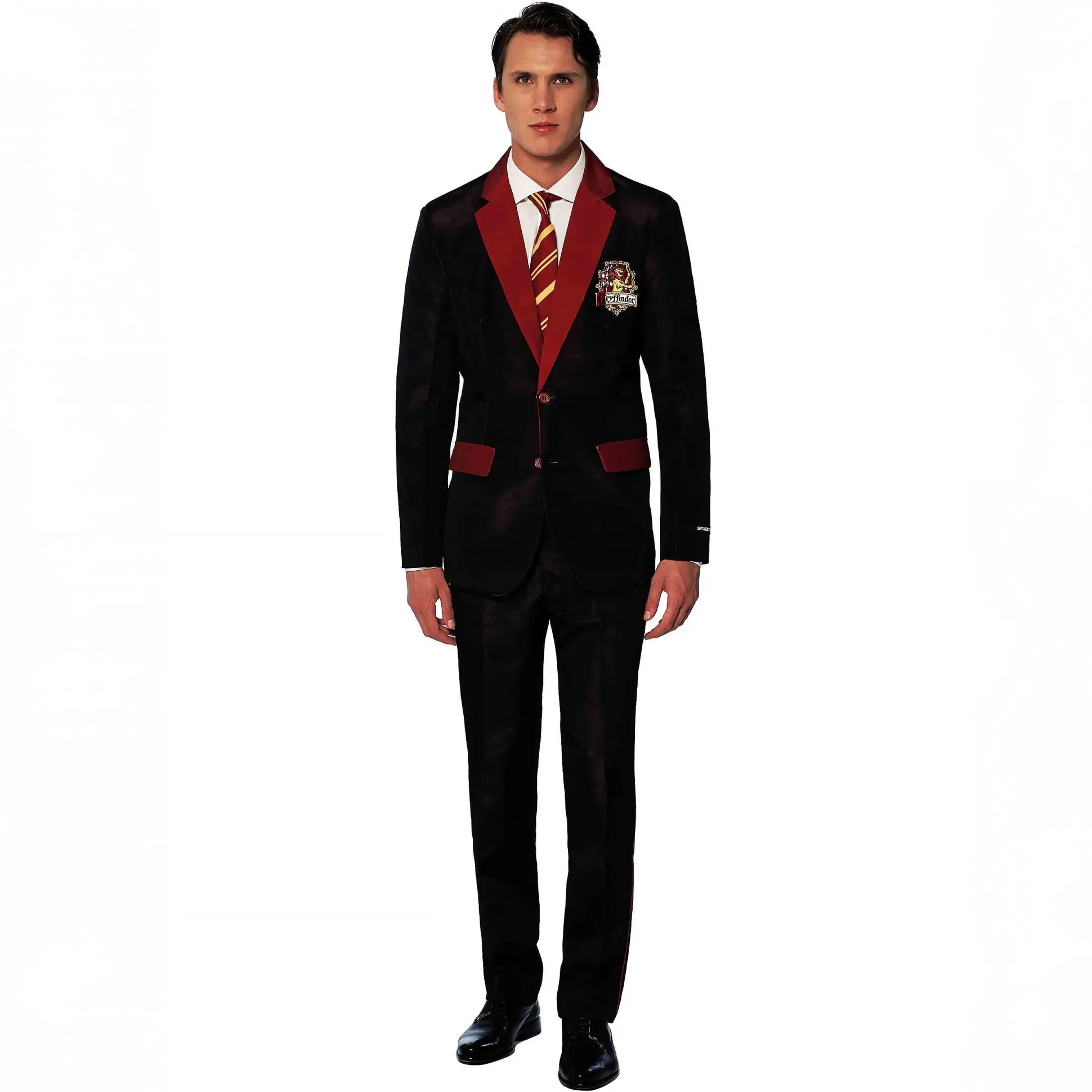 Het pak is helemaal in Griffoendor stijl, met een grote huiswapen-print zodat iedereen meteen ziet bij welk huis je hoort (sorry, Zwadderich-fans). Het colbert is netjes gesneden, met knoopsluiting, een binnenzak voor je toverstok, telefoon of Chocolade Kikker, en een dubbele split aan de achterkant zodat je soepel kunt bewegen – of je nu op een bezem stapt of de dansvloer onveilig maakt.