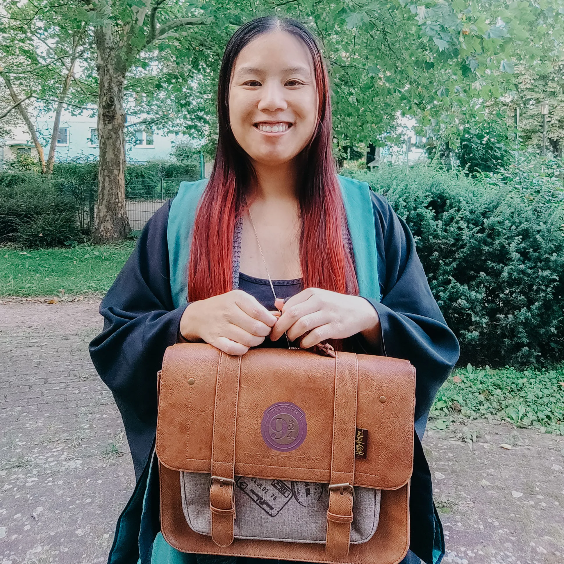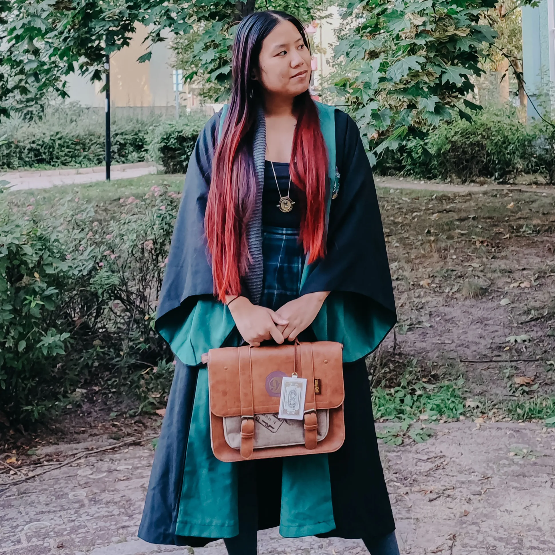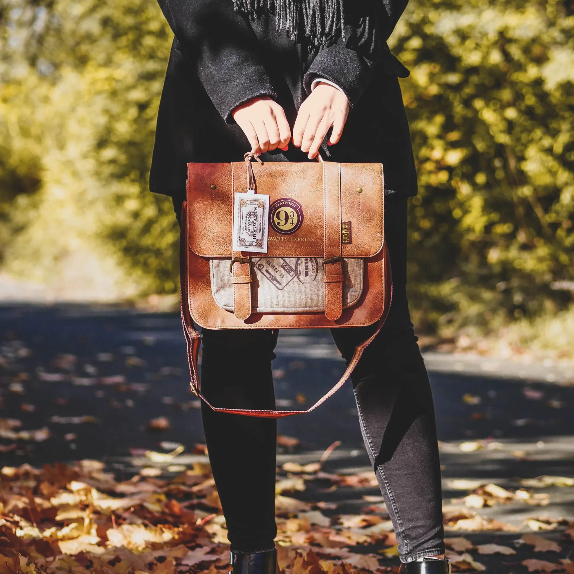 Een ruim hoofdvak voor toverstokken, notitieboeken en dreuzelspul, een insteekvak voorop en een magnetische drukknoop in gesp-look houden alles op z’n plek. Draag ’m met de verstelbare schouderriem of grijp het handvat wanneer de Zweinsteinexpres binnenkomt. Het bagagelabel met naamkaartje laat uilen en conducteurs zien van wie dit pareltje is.