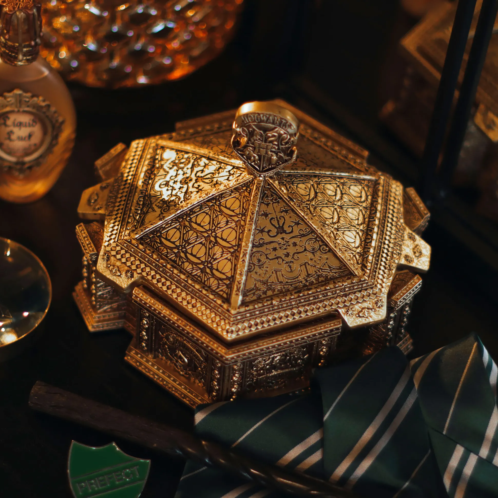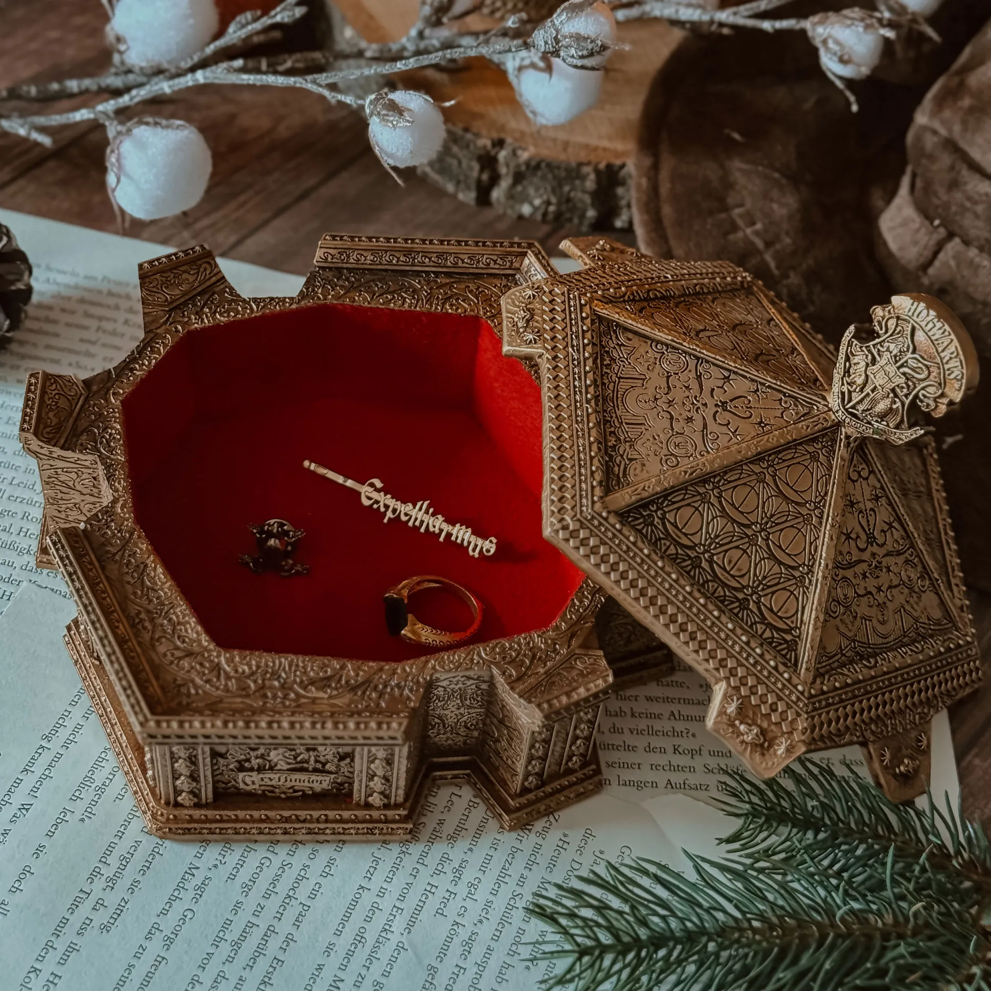 - deksel met verhoogd Hogwarts wapen, interieur van de sieradendoos bekleed met rood fluweel
