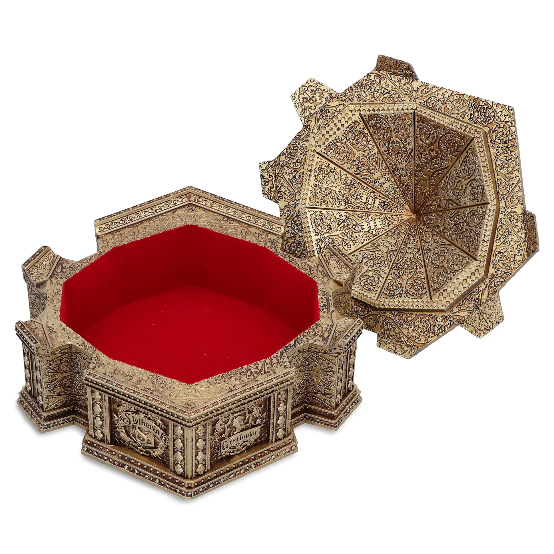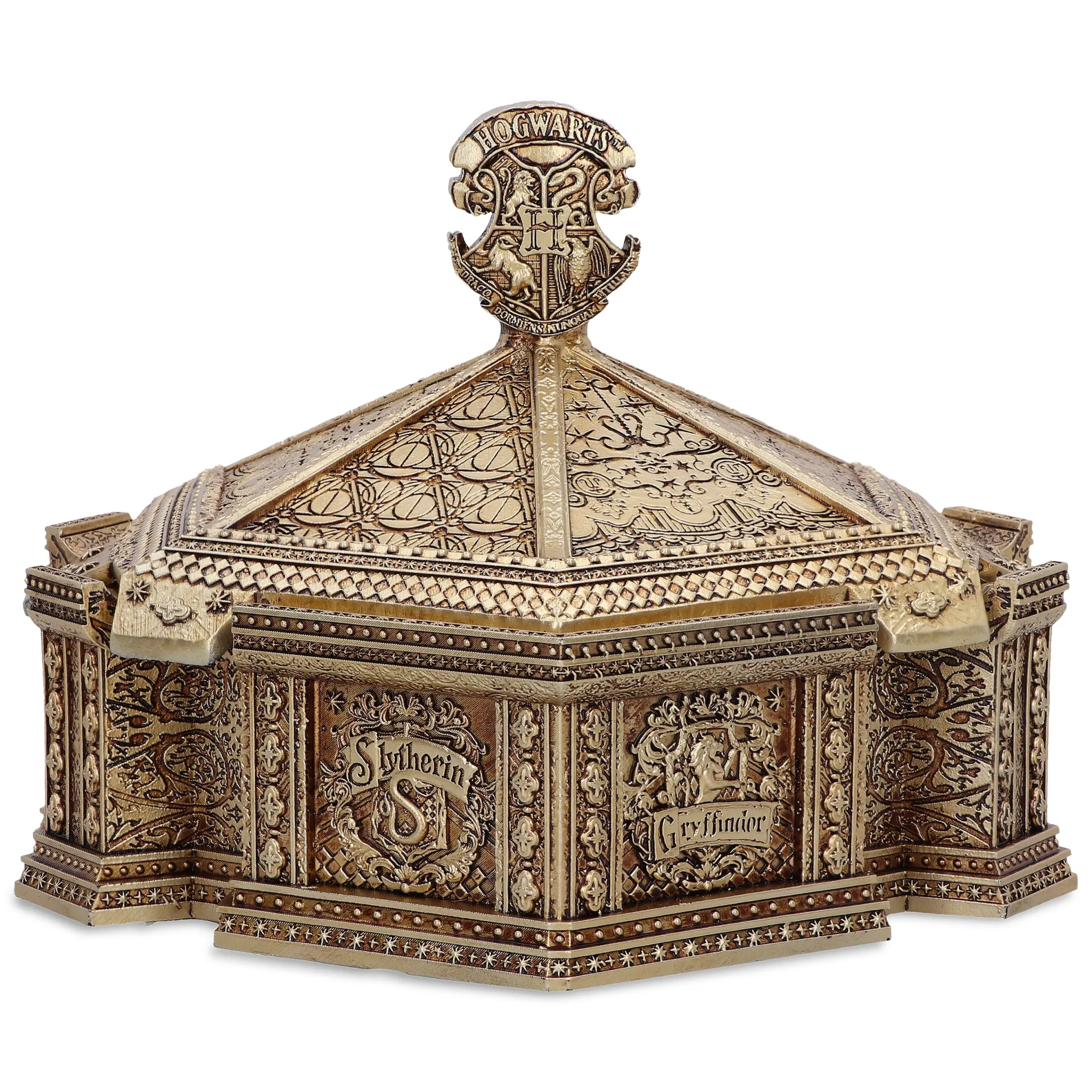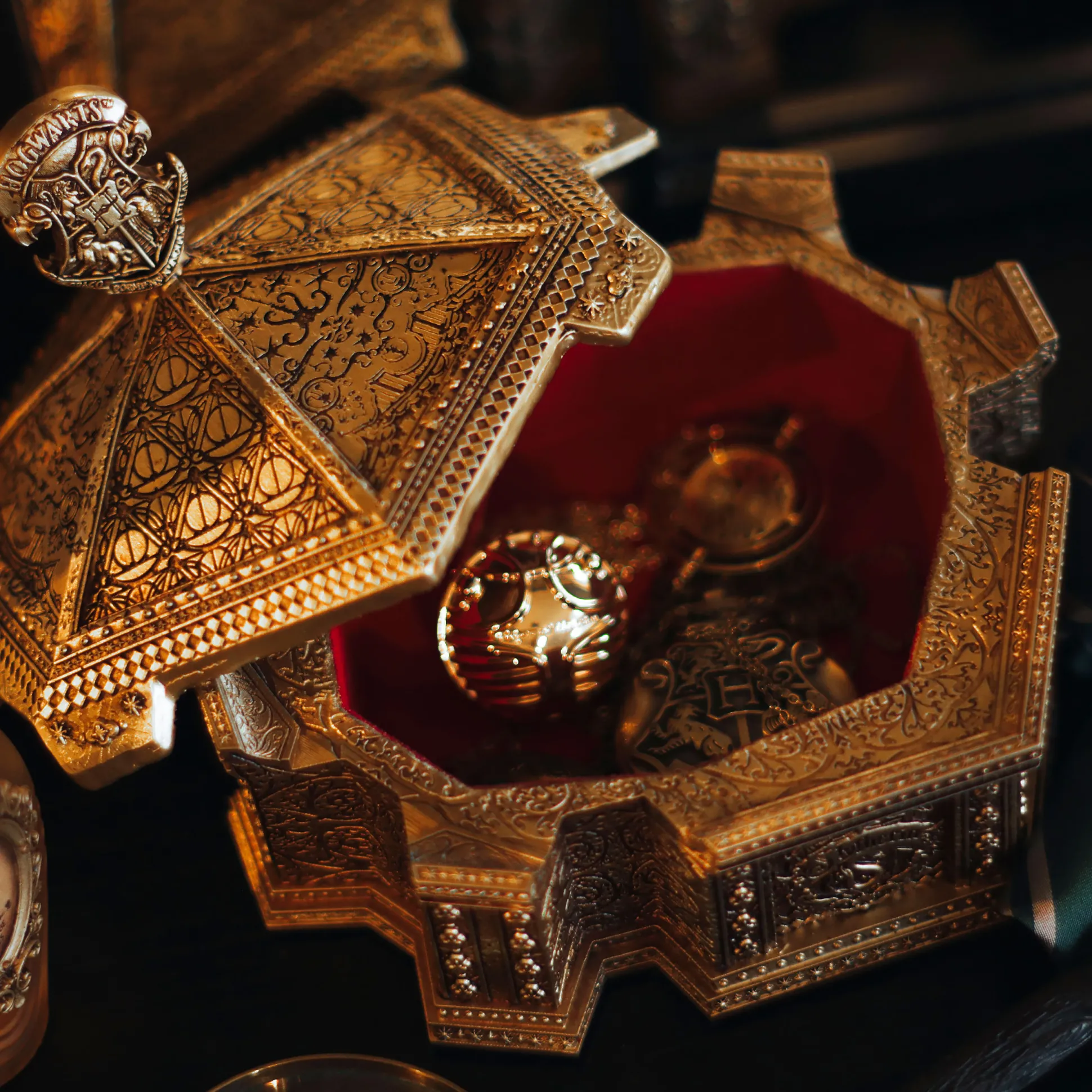 Voor sieraden, schatten en een vleugje toverschool: deze officieel gelicentieerde Harry Potter sieradendoos haalt Hogwarts naar je kamer. De goudkleurige look, het verhoogde Hogwarts-wapen op het deksel en de vier huiswapens rondom maken hem tot een blikvanger op je dressoir, kaptafel of plank. Binnenin wacht rood fluweel — perfect voor kettingen, oorbellen en al het moois dat glinstert. Decoratief, stevig en klaar voor een beetje dagelijkse magie. Afmetingen: 16 x 13,5 x 17 cm.