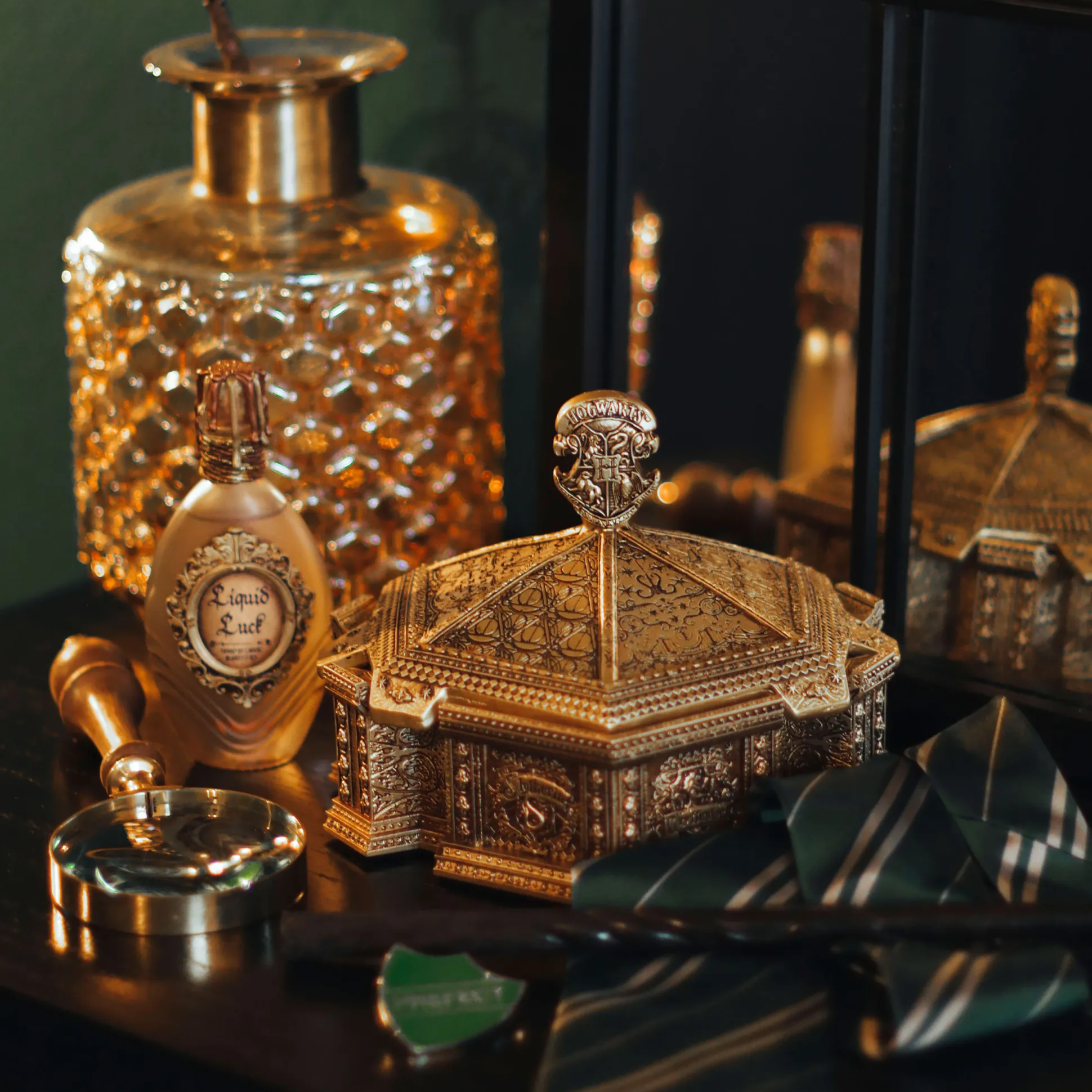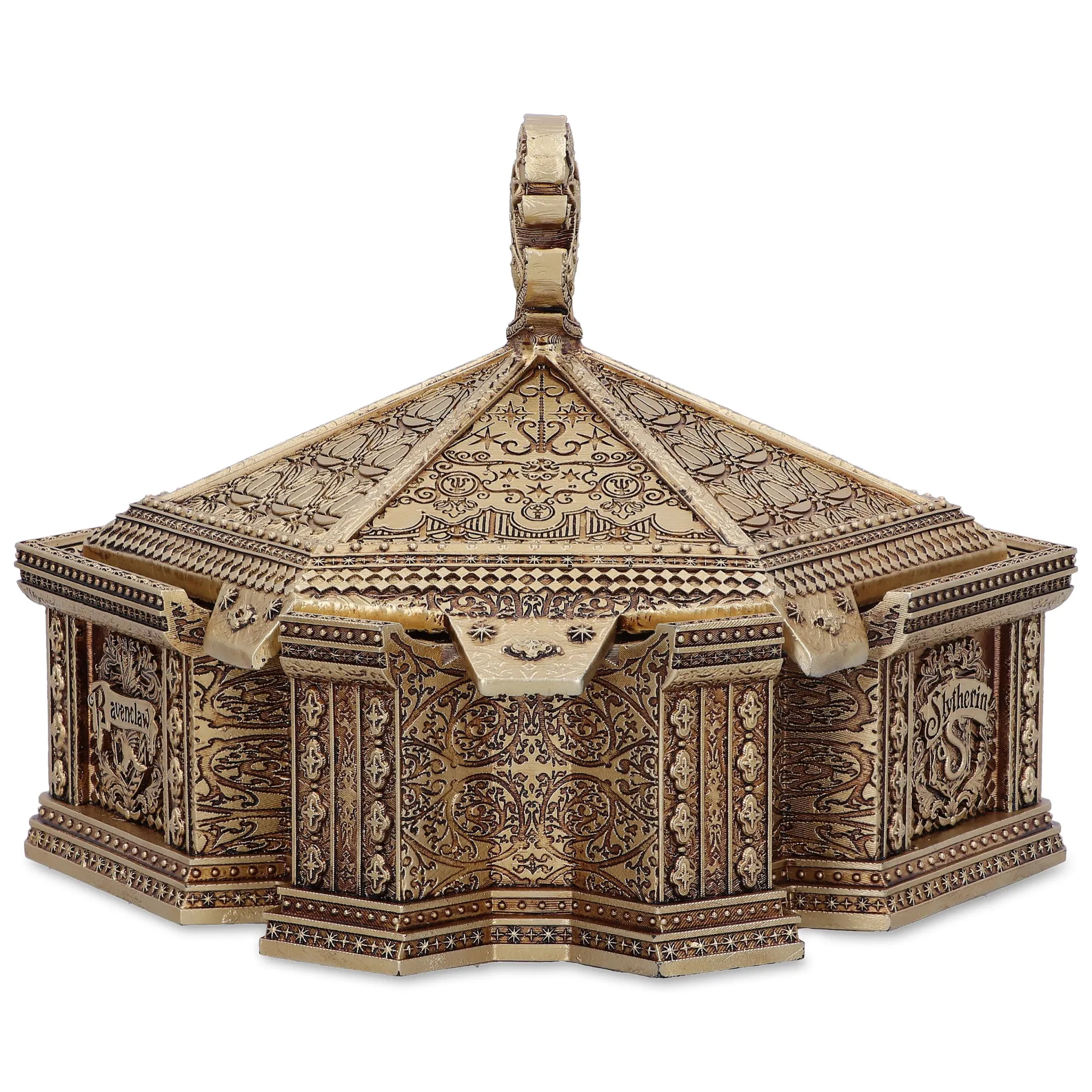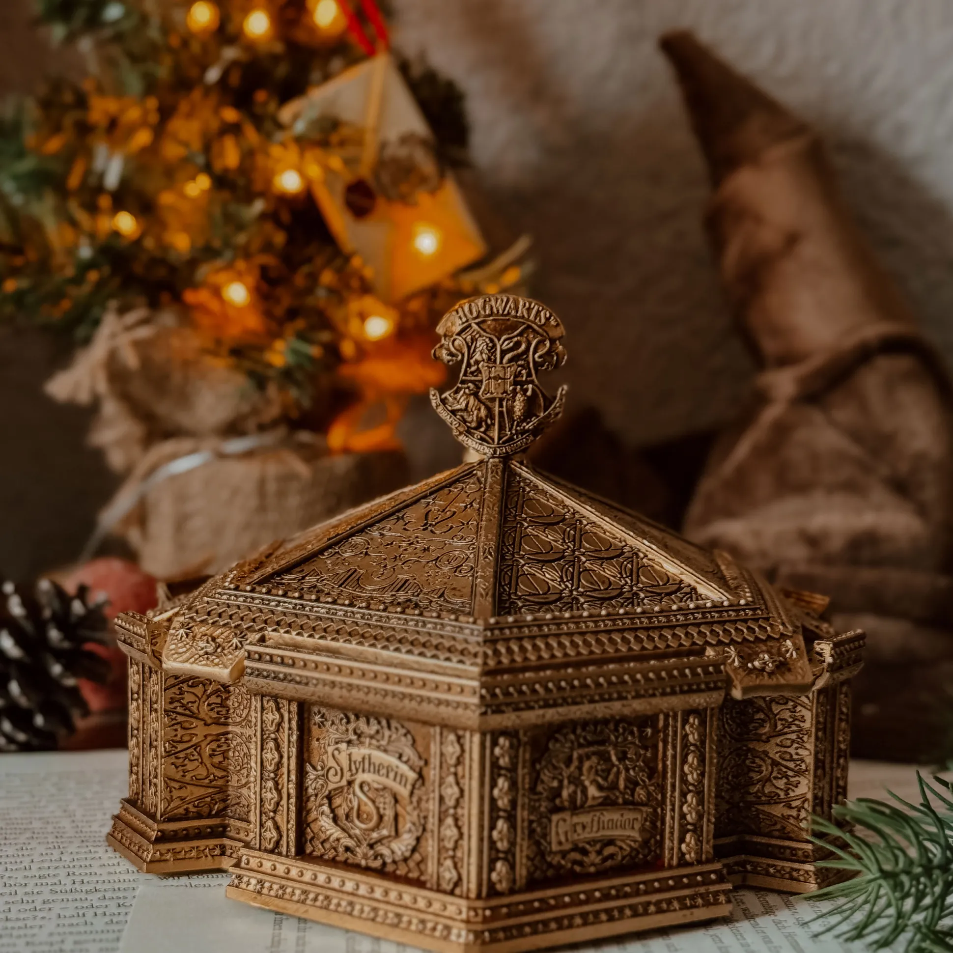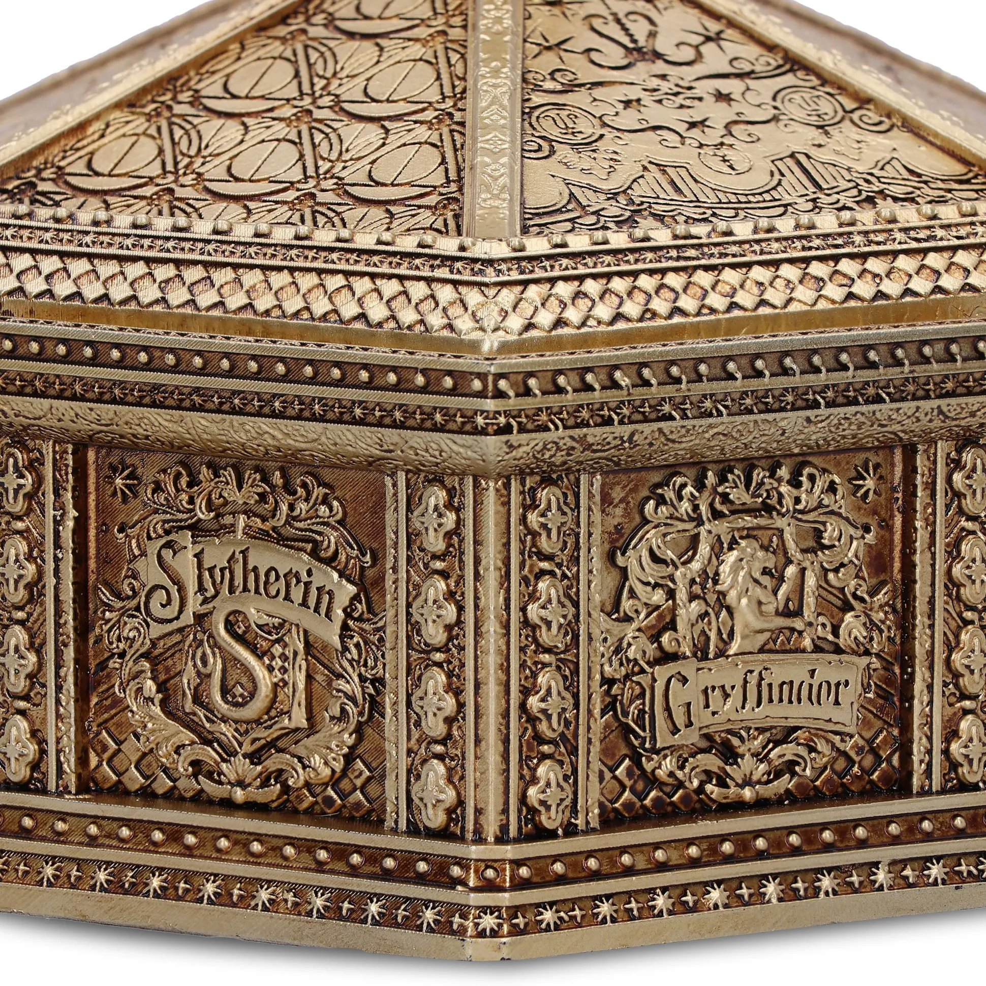 Voor sieraden, schatten en een vleugje toverschool: deze officieel gelicentieerde Harry Potter sieradendoos haalt Hogwarts naar je kamer. De goudkleurige look, het verhoogde Hogwarts-wapen op het deksel en de vier huiswapens rondom maken hem tot een blikvanger op je dressoir, kaptafel of plank. Binnenin wacht rood fluweel — perfect voor kettingen, oorbellen en al het moois dat glinstert. Decoratief, stevig en klaar voor een beetje dagelijkse magie. Afmetingen: 16 x 13,5 x 17 cm.
