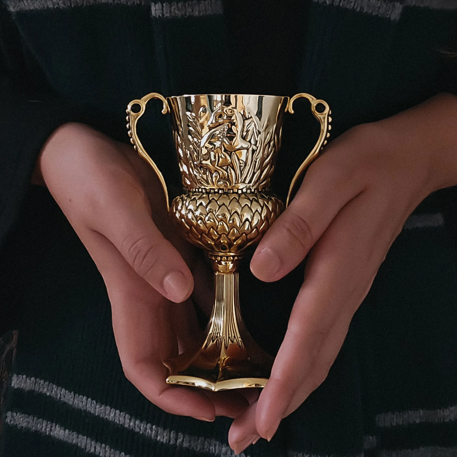 Trouw, behulpzaamheid en rechtvaardigheid – dit zijn de deugden van het Huffelpuf-huis. Helga Huffelpuf, de oprichtster van het Huffelpuf-huis, liet een drinkbeker achter, die later door Heer Voldemort werd veranderd in een van zijn Gruzielementen. Hij werd veilig bewaard in de kluis van Bellatrix van Detta bij Goudgrijp, totdat Harry, Ron en Hermelien hem vonden en vernietigden. De beker is goudkleurig en versierd met het symbool van Huffelpuf, een das. Met veel oog voor detail ontworpen, is het een prachtige verzamelobject voor elke Harry Potter-fan.