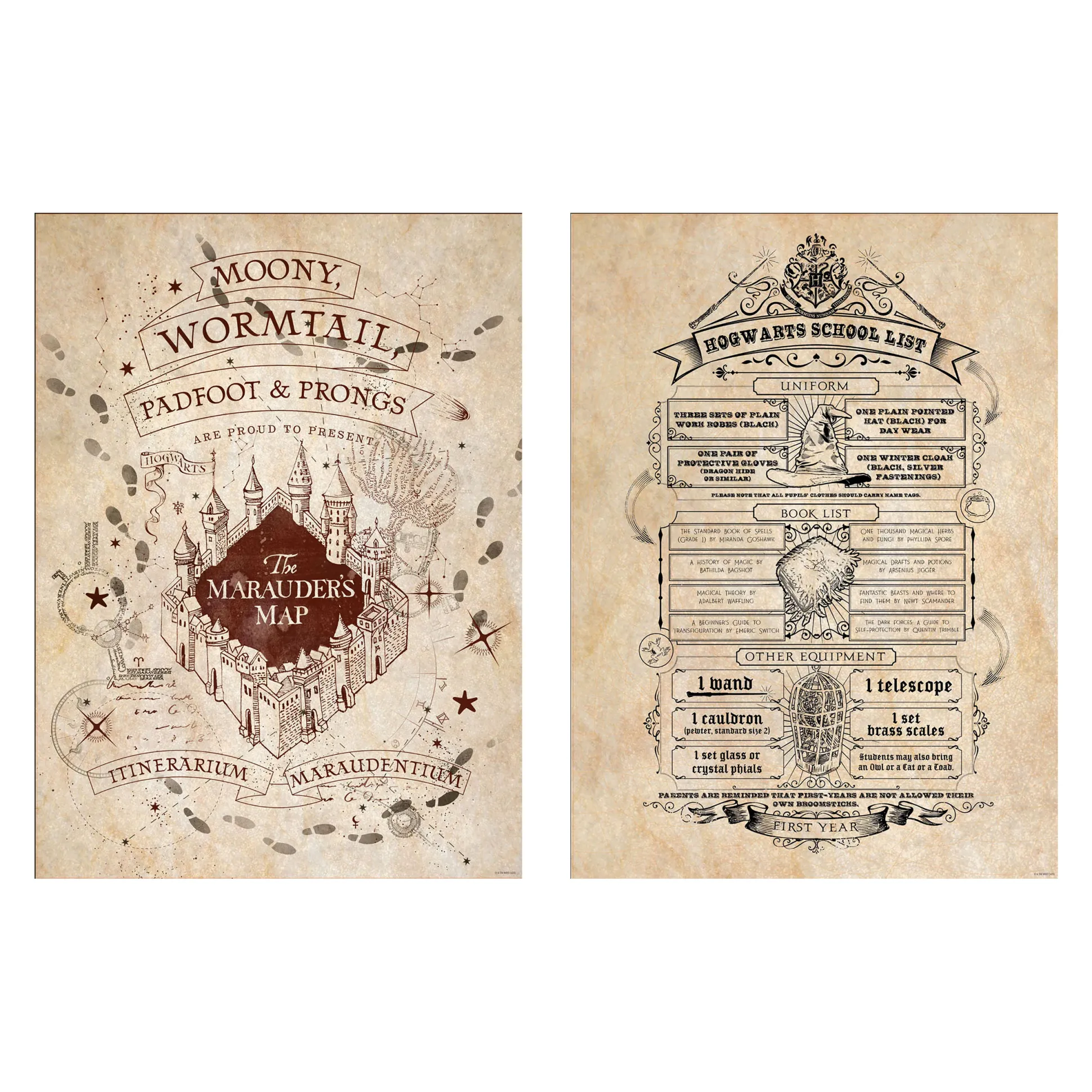 Muurmagie, geregeld. Deze officieel gelicentieerde Harry Potter-posterset combineert De Sluipwegwijzer met de benodigdhedenlijst voor Zweinstein-eerstejaars — ideaal om sluiproutes te plannen en je koffer in één oogopslag te organiseren.