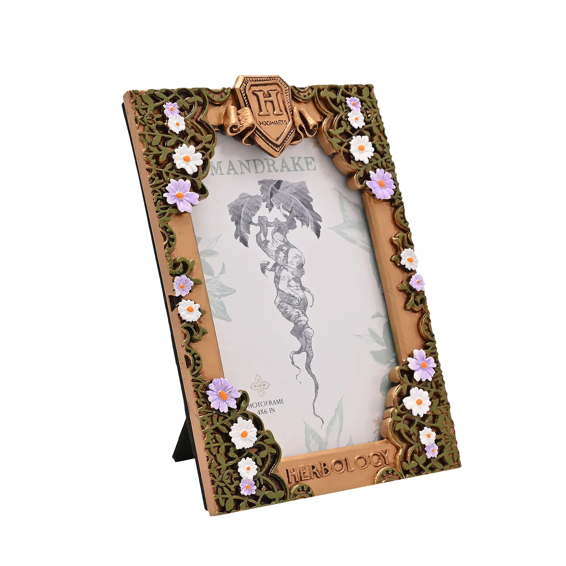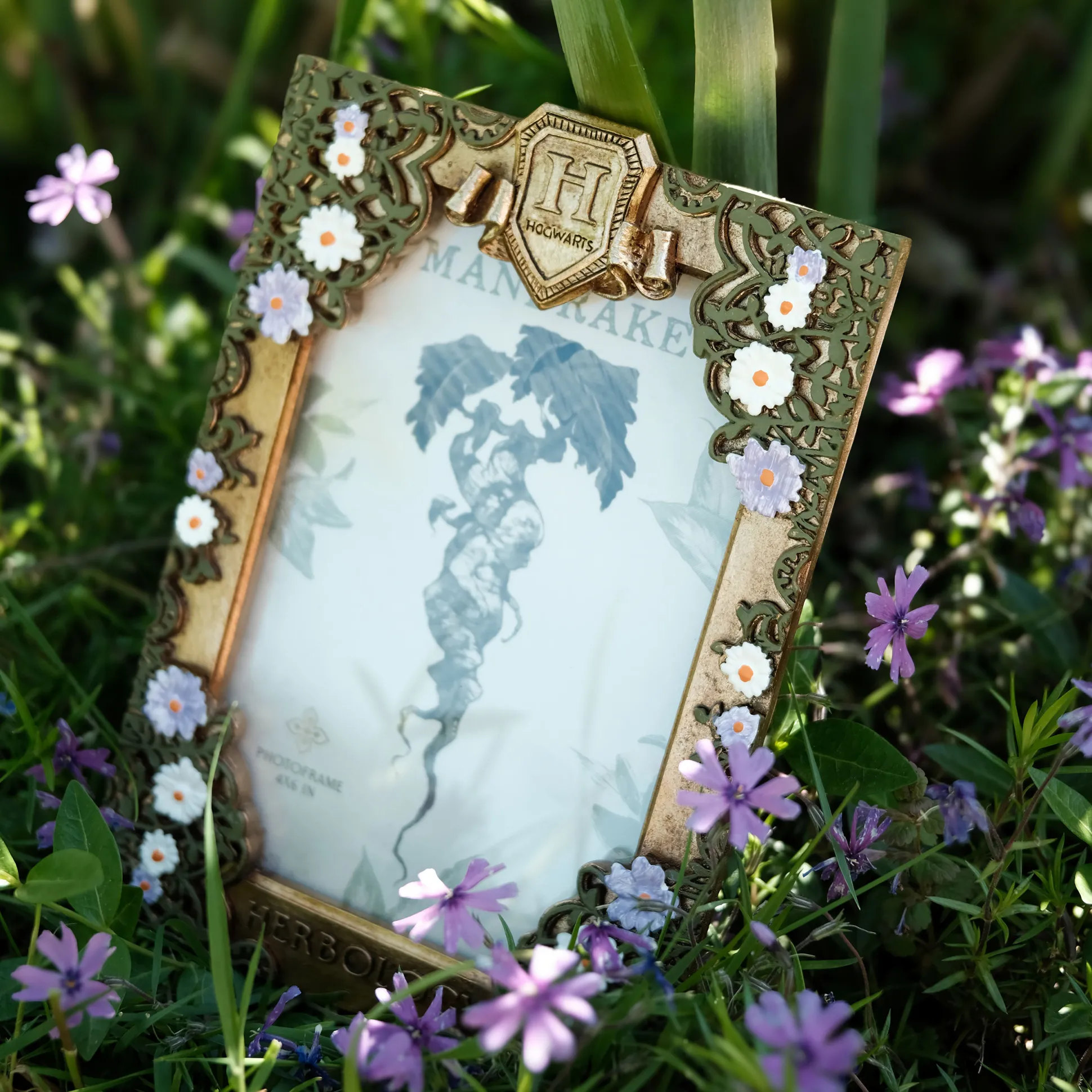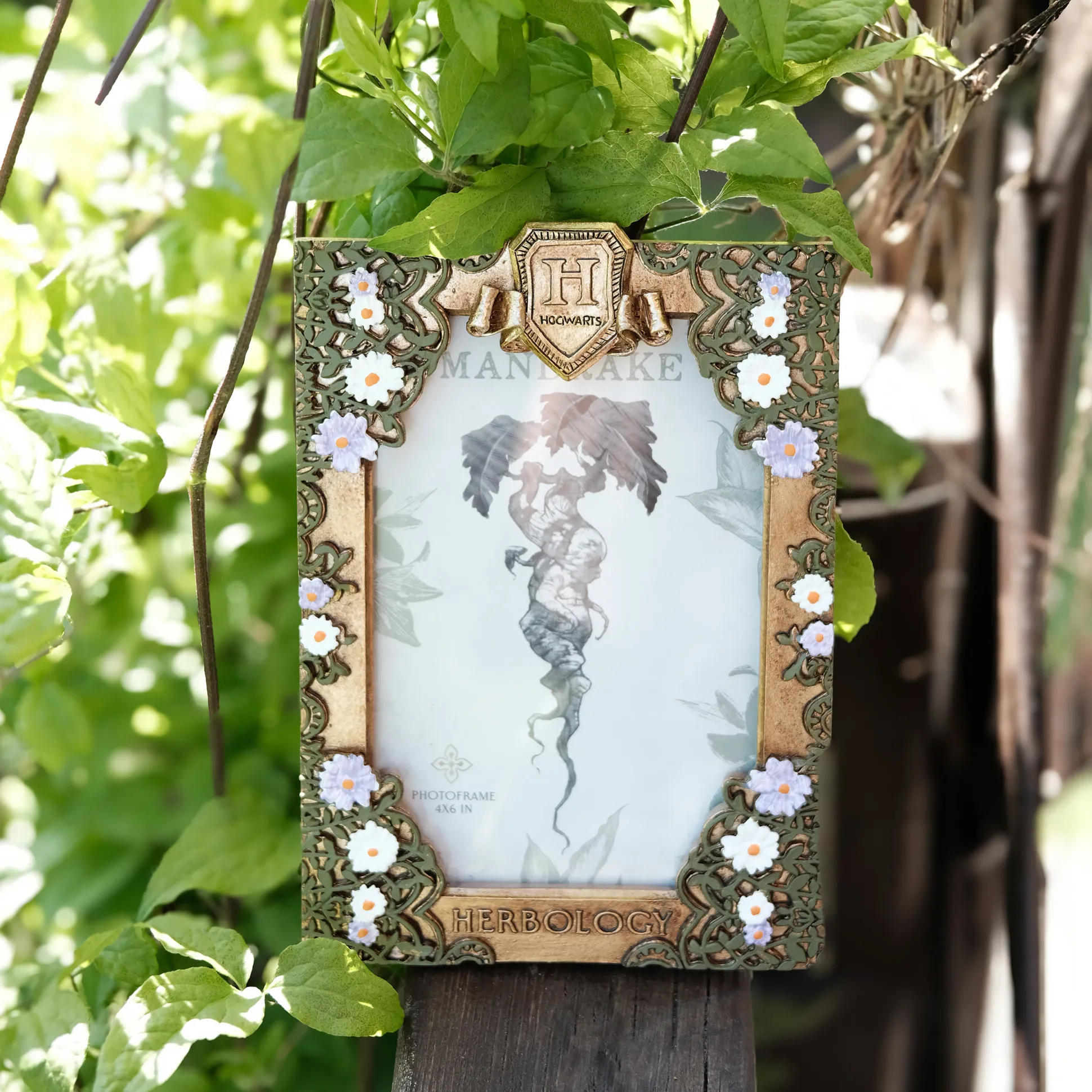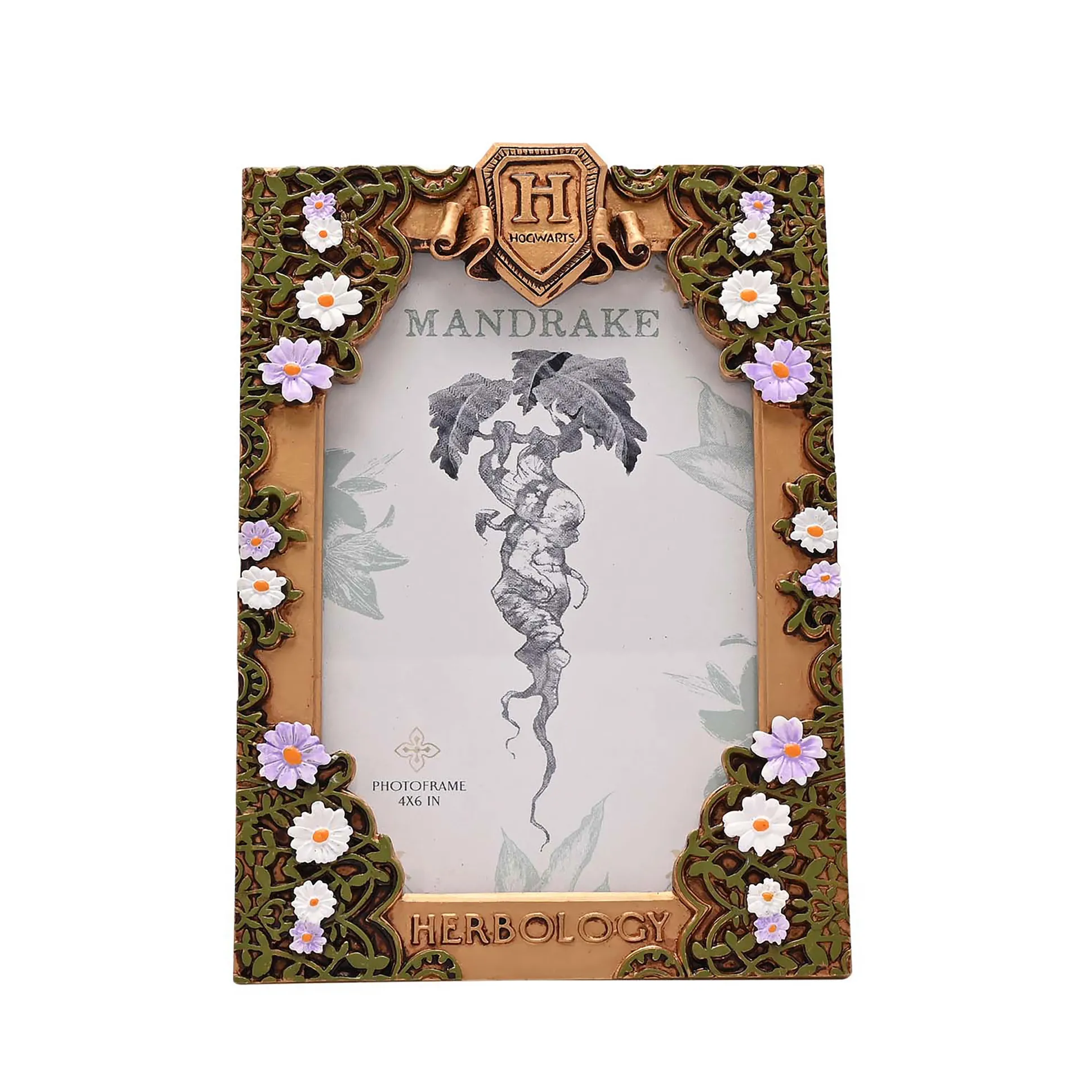 - fotolijst in kruidenkunde ontwerp versierd met Hogwarts-logo en bloemen