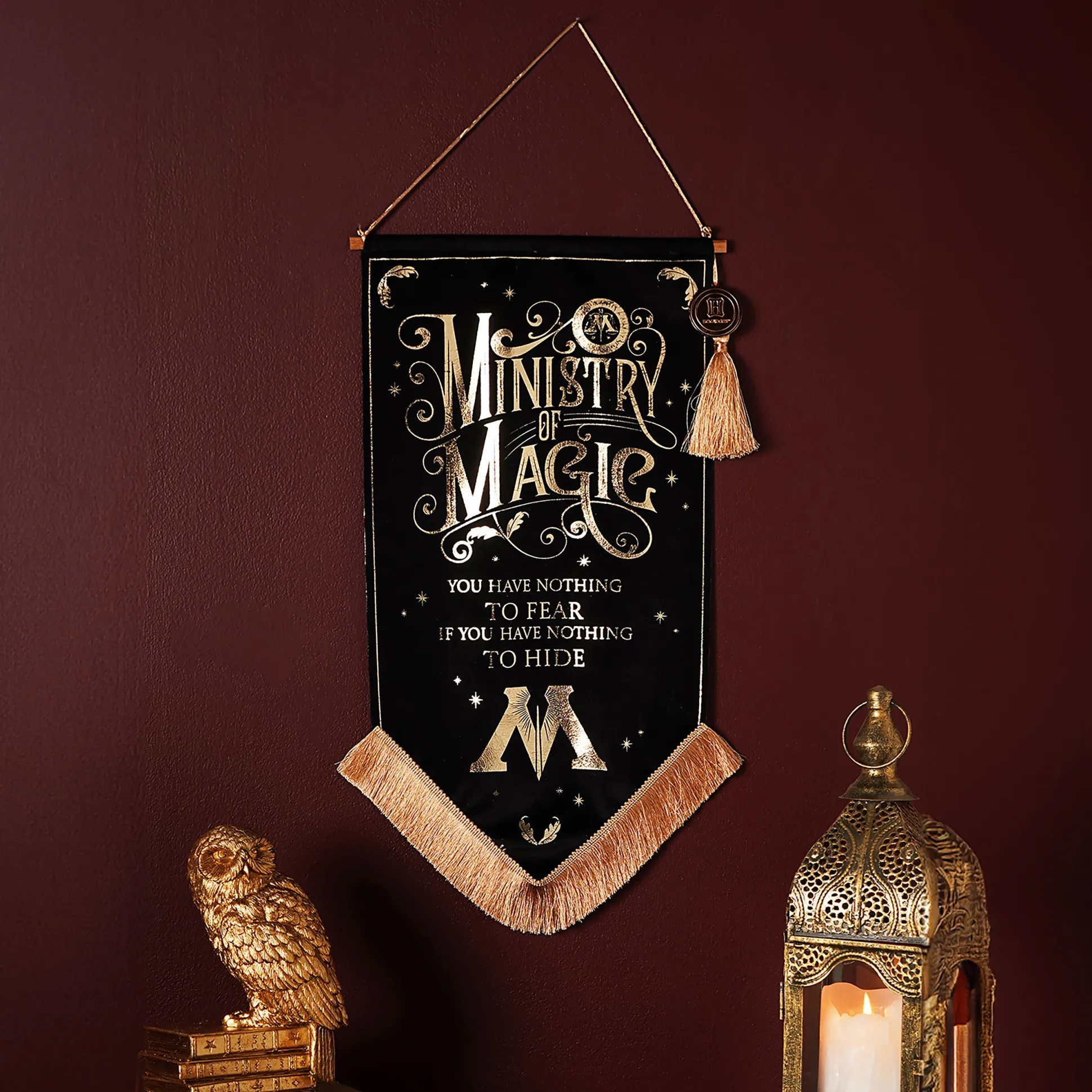 Van de gang zo aan de muur: deze officieel gelicentieerde Harry Potter-banner heeft een verhoogd embleem van het Ministerie van Toverkunst op fluweelachtige stof, opgehangen aan een goudkleurig ophanglint. Hij komt aan een houten stok met kwastjes en het Zweinstein-embleem — klaar om te hangen in je kantoor, hal of geheime vergaderruimte. Met 26 x 64 cm past hij bijna overal en geeft hij je plek die ‘Ik werk bij het Ministerie van Toverkunst’-look. Perfect cadeau voor fans die hun decor graag met autoriteit brengen. Geen toverstok nodig.