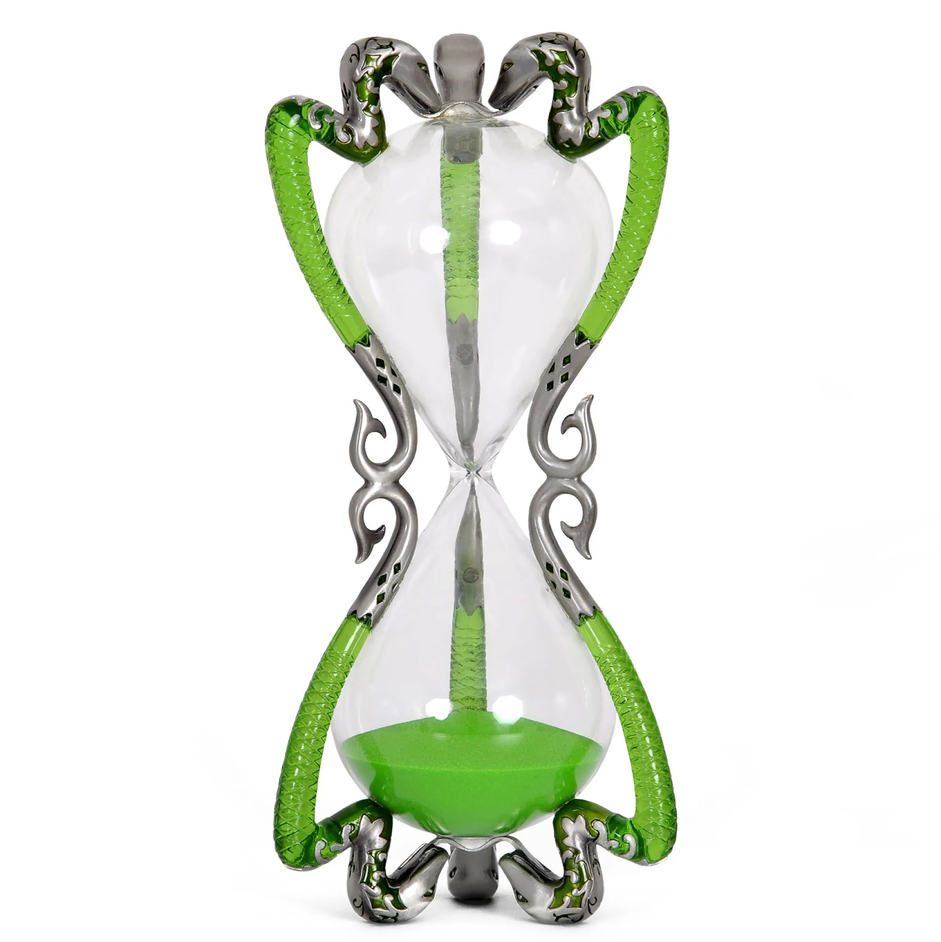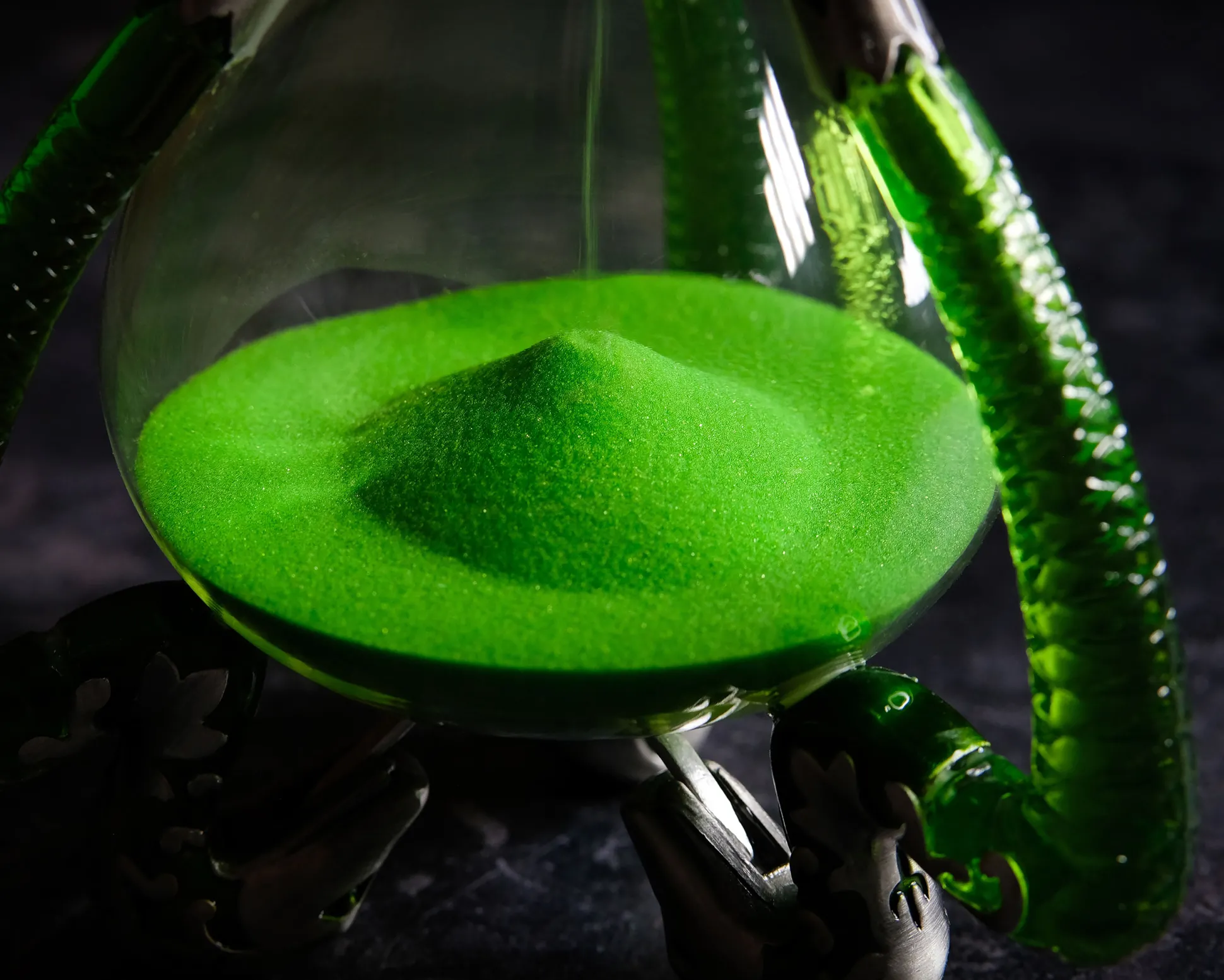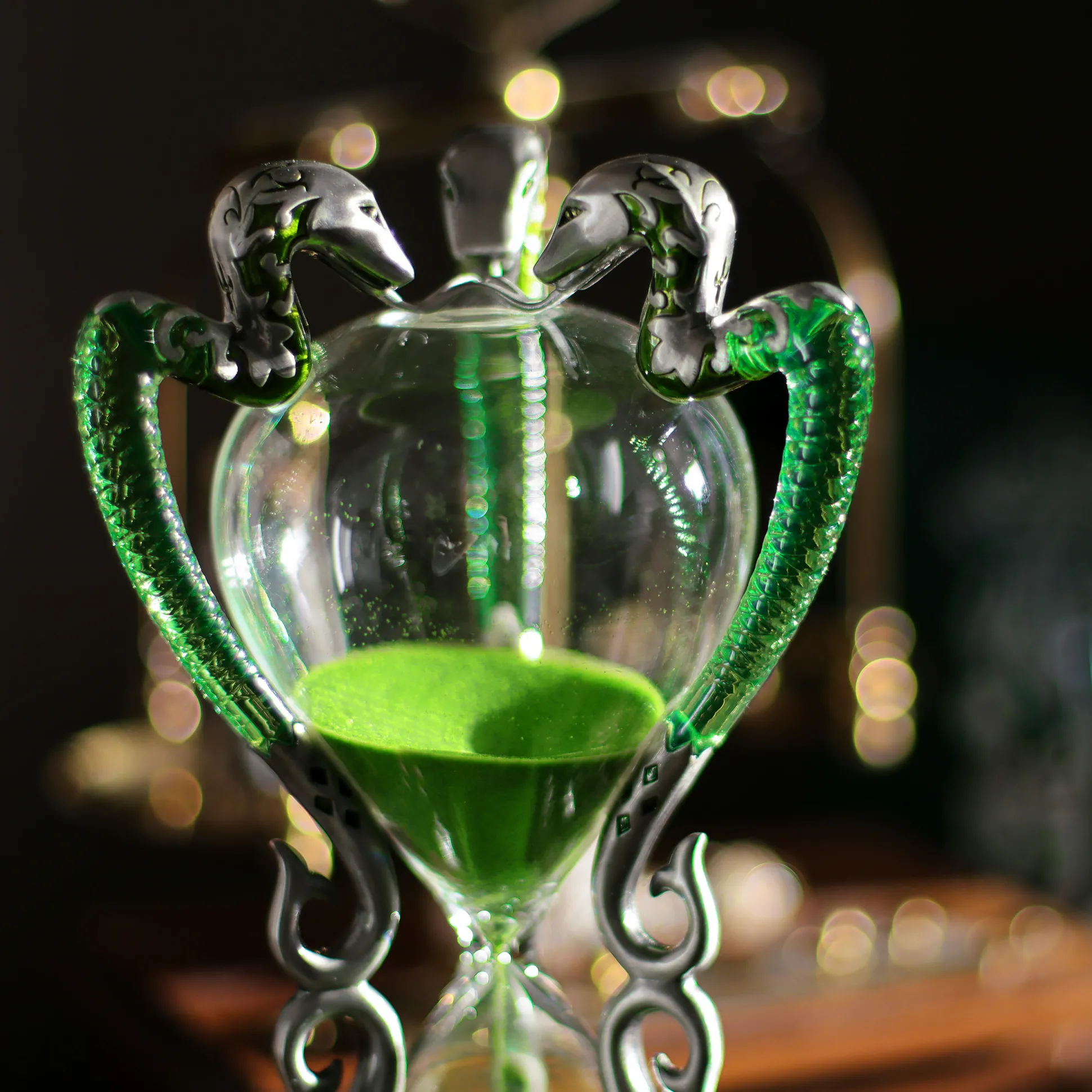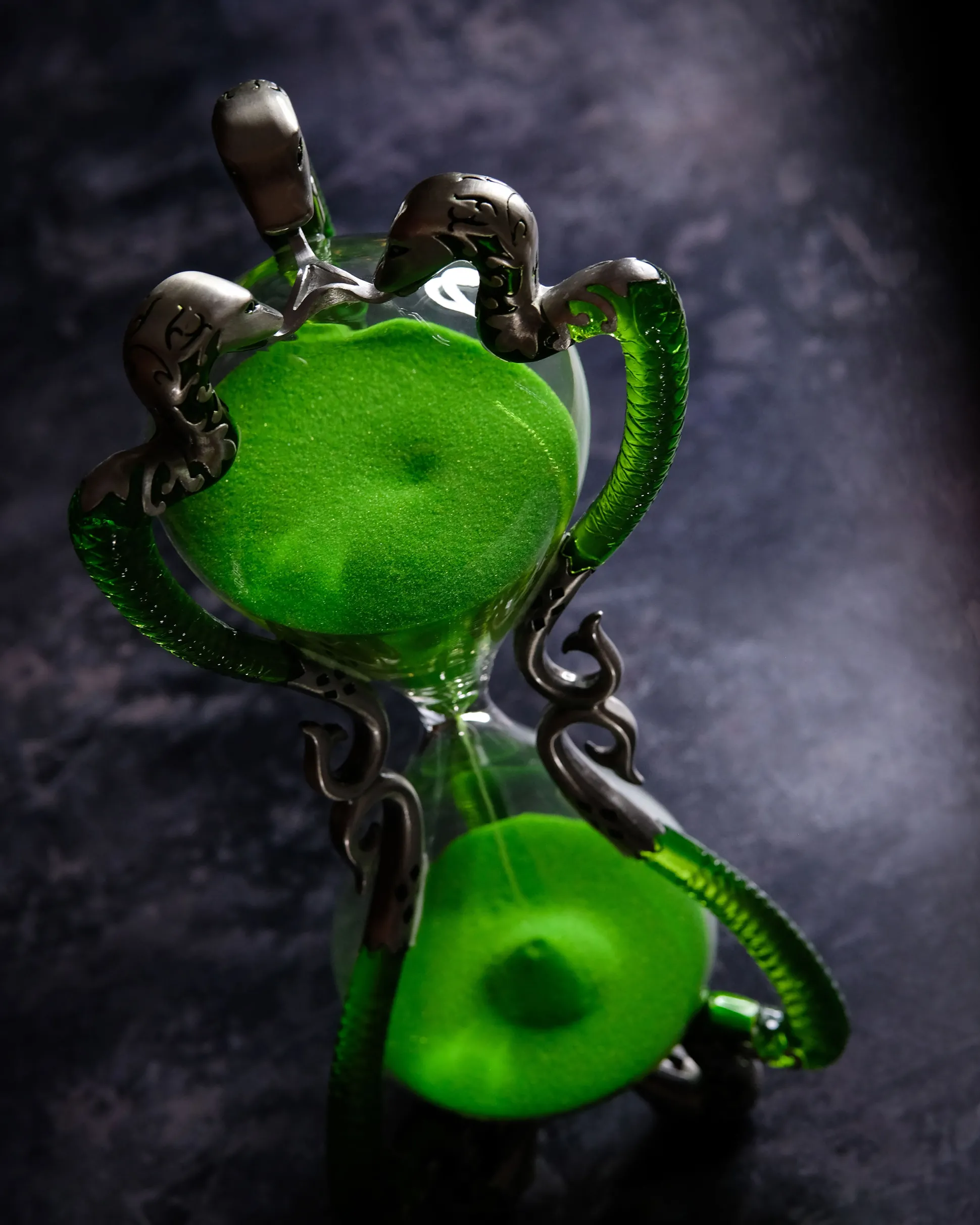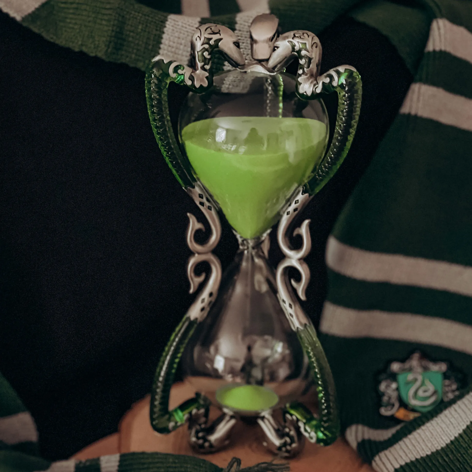 Deze filmreplica van The Noble Collection bootst het uiterlijk van Slughorn’s tijdsmeter nauwkeurig na: Zes slangen houden het glazen lichaam vast waar doorheen het gifgroene zand loopt. Het duurt ongeveer een uur voordat het doorlopen is. In deze versie voor ons Dreuzels is de kwaliteit van het gesprek irrelevant 🙂