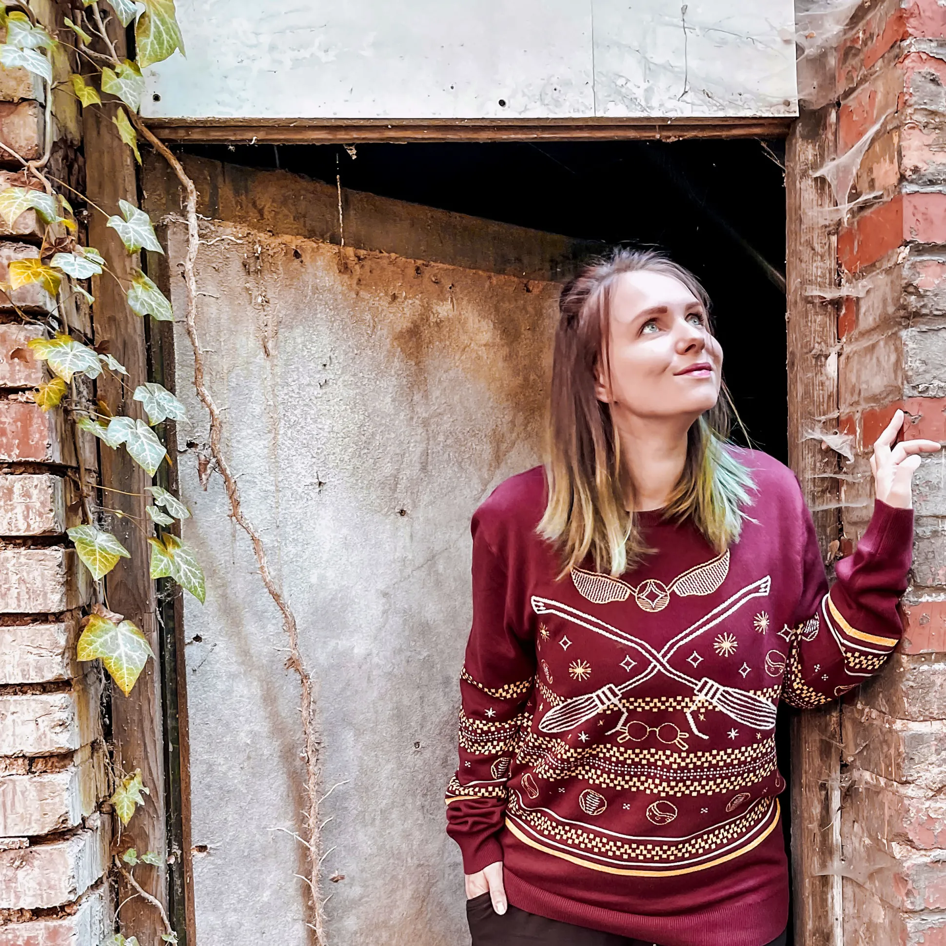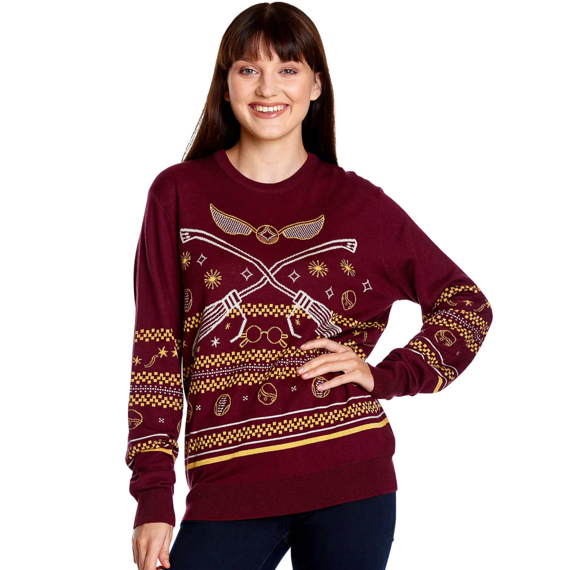 Het glinstert, het heeft een Noords patroon, het is Zwerkbal: deze officieel gelicenseerde Harry Potter foute kersttrui brengt stadionvibes naar je feestdagen. Het rode breisel toont bezems, wedstrijdspullen en – natuurlijk – de Gouden Snaai; subtiele glitter vangt het licht sneller dan een Snaai in het spel. Met ronde hals, rechte fit en brede, stevige boorden zit ’ie comfy, oogt strak en houdt z’n vorm – of je nu een feestje pakt, een filmmarathon doet of aan bank-Quidditch doet. Het patroon op zowel voor- als achterkant maakt ’m overal feestelijk; de knit is knus zonder te kriebelen. Cadeau doen, aantrekken, winter winnen.