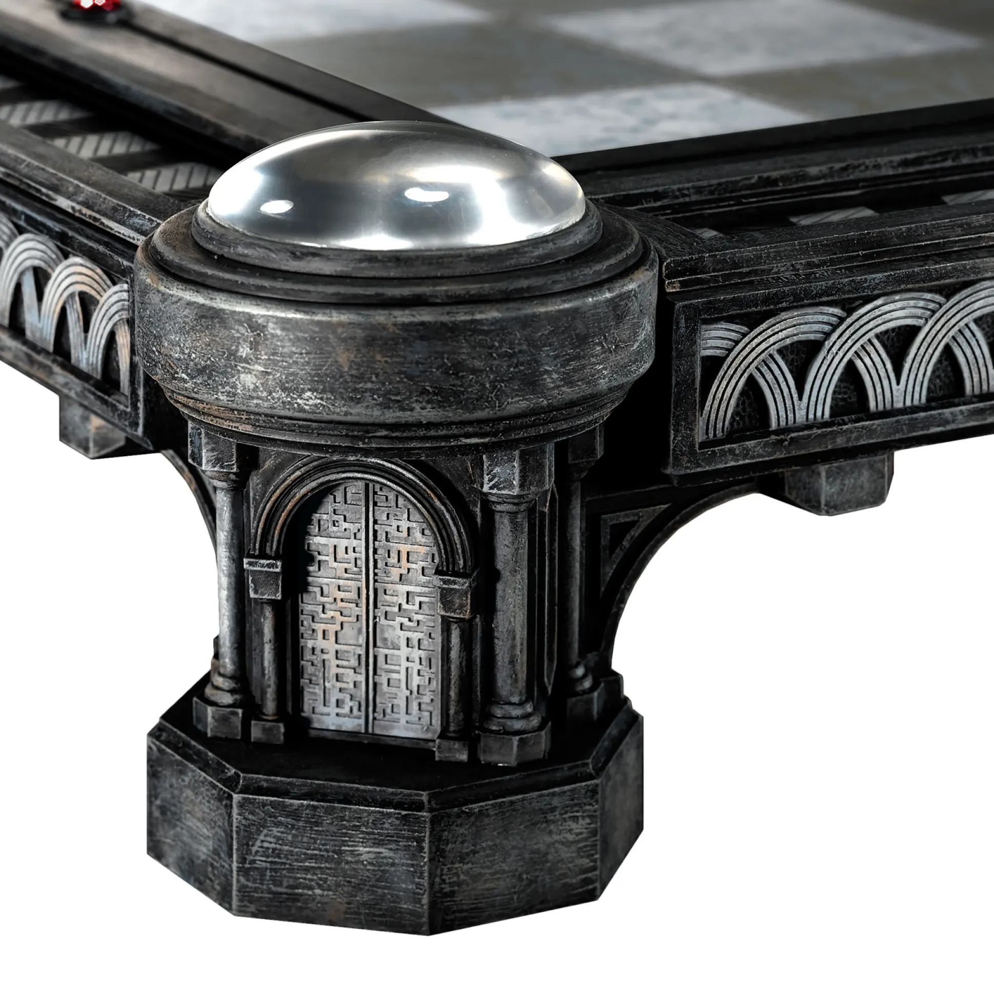 Het “Steen der Wijzen” schaakbord is ook voorzien van allerlei details en weegt 6 kg: Het glanzende marmeren speelvlak wordt omlijst door een robuust frame van hout en metaal. Kleine Harry Potter logo’s, ornamenten en de imposante standaards mogen gezien worden.