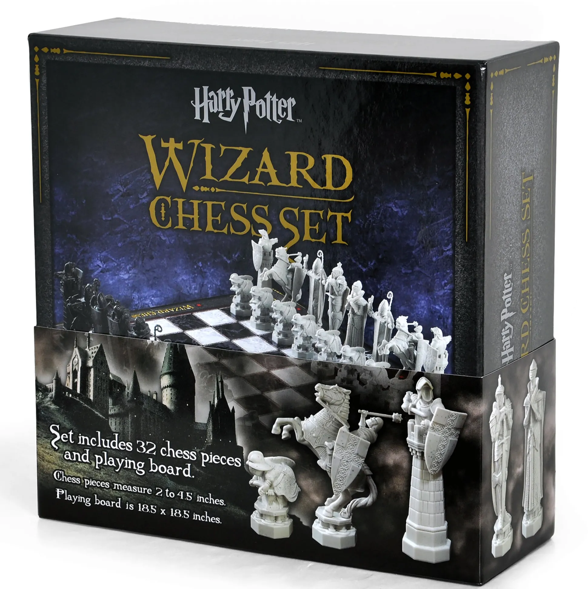 Opdat jij in je eerste partijen niet roemloos ten onder gaat zoals Harry, heeft Elbenwald dit toverschaakspel voor je, zodat je je perfect kunt voorbereiden op duels in de leerlingenkamer: pak gewoon het hoogglanzende schaakbord in marmerlook uit, met Harry Potter-logo’s aan de zijkanten, en zet de 32 schaakstukken neer, die dankzij het lichte kunststof bijna vanzelf over het bord lijken te zweven. De stukken, 5 tot 11,5 cm hoog, zitten in twee organzazakken bedrukt met het Harry Potter-logo en zijn gebaseerd op het legendarische schaakspel dat professor Anderling heeft gecreëerd om de Steen der Wijzen te beschermen – hetzelfde spel waarin Ron zichzelf opoffert zodat Harry naar de volgende kamer kan gaan en Heer Voldemort voorlopig kan verslaan.