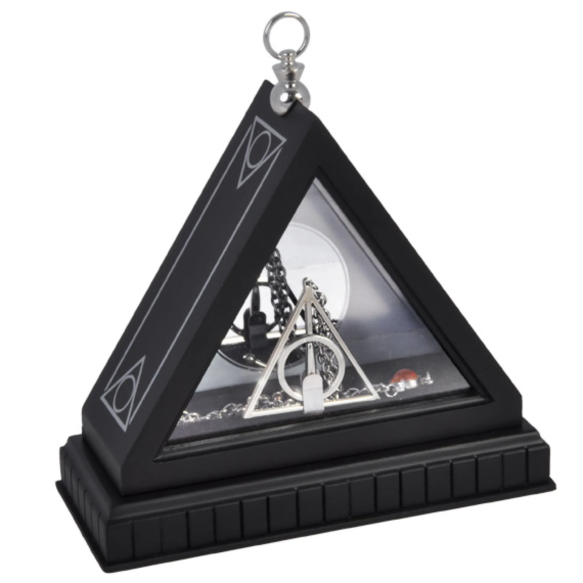 zijn de drie symbolen van de Relieken van de Dood en grafisch weergegeven in een gelijkzijdige driehoek (onzichtbaarheidsmantel), die een cirkel (steen) en een verticale middenlijn (toverstok) omsluit.