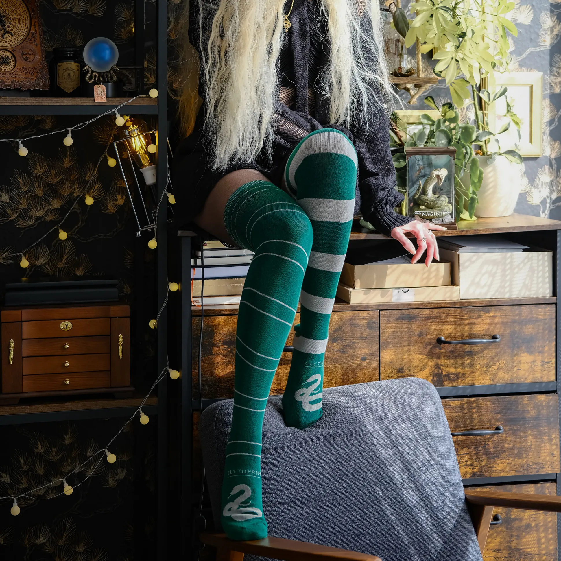 Ambitie én stijl? Zwadderich heeft het allebei. Deze overknee-kousen laten je huis zien en houden je benen warm als in de leerlingenkamer onder het meer. Het 2‑paar‑setje brengt afwisseling in je lade: elk paar met Zwadderich‑opdruk en de trotse slang in het wapen. One size (EU 38–45) past heksen, tovenaars en dreuzels. In groen en grijs – precies zoals Salazar het graag had. Officieel gelicenseerde Harry Potter merch, perfect voor elke dag, cosplay of je volgende huispunten‑heist.