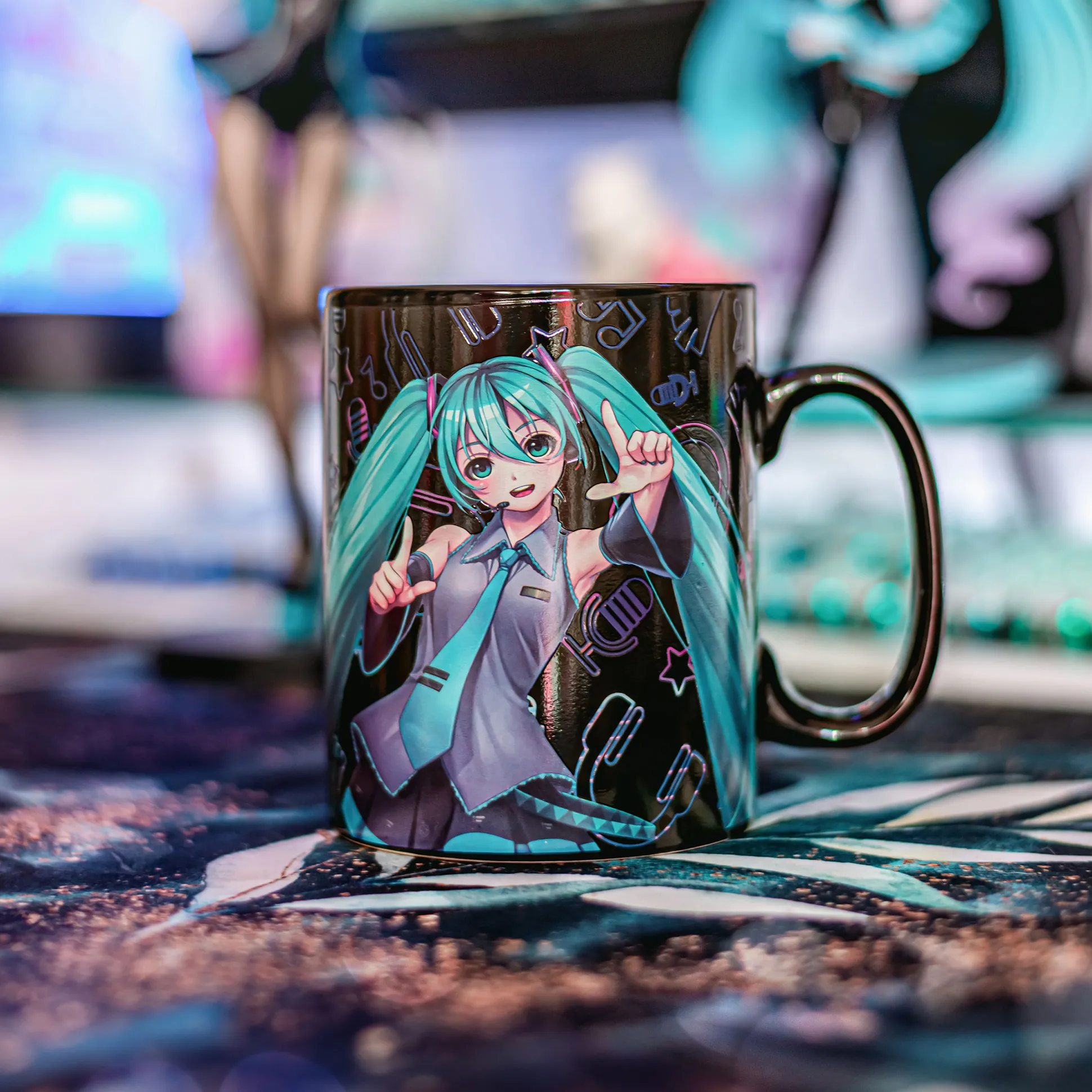Maak van je koffiepauze een mini-concert. Deze officieel gelicenseerde Vocaloid warmtegevoelige mok heeft een rondomprint met Hatsune Miku en logo. Giet er iets heets in en de achtergrond verandert voor je ogen — net als podiumlichten voor je drankje.