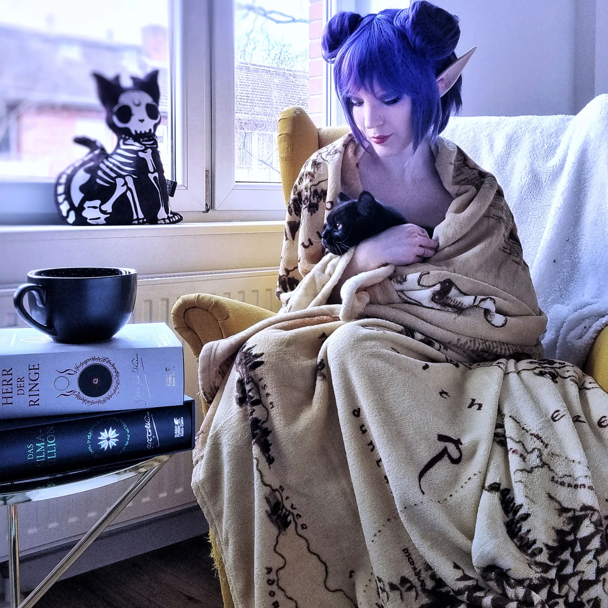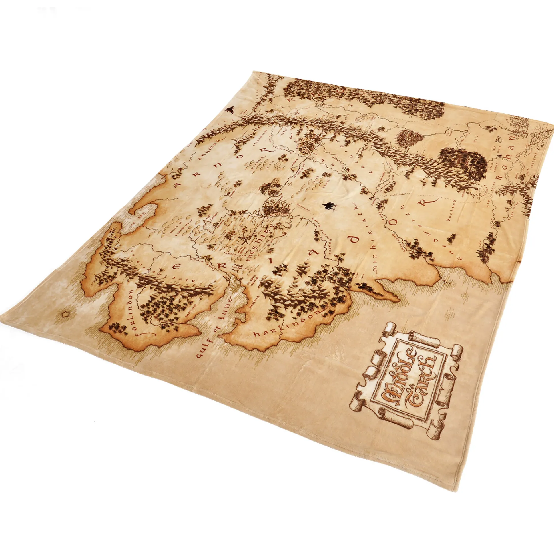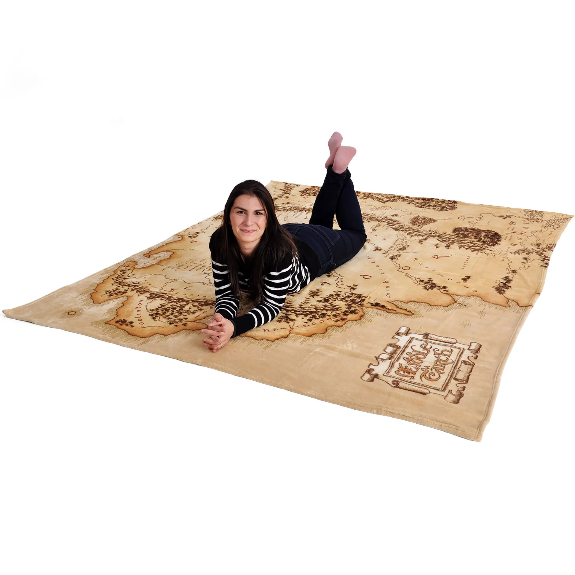 Als het gras nog niet zacht genoeg is, biedt onze zachte, 180 x 220 cm grote Midden-aarde fleece deken voldoende ruimte voor jou en je metgezellen! Onze deken toont de gebieden van het Westen, tot aan Lothlórien en Rohan, langs de Misty Mountains.