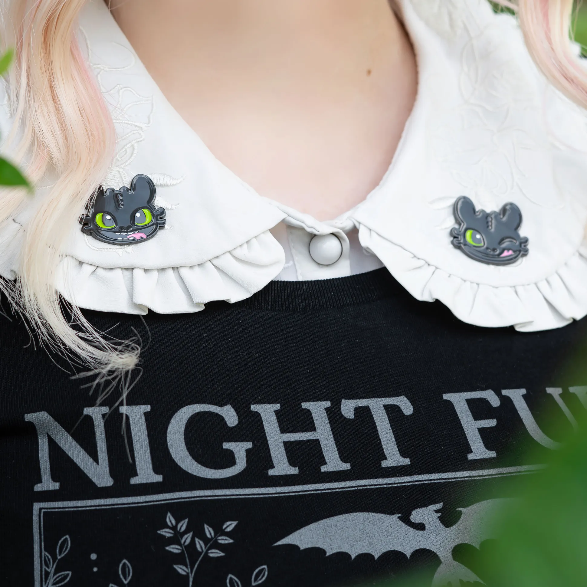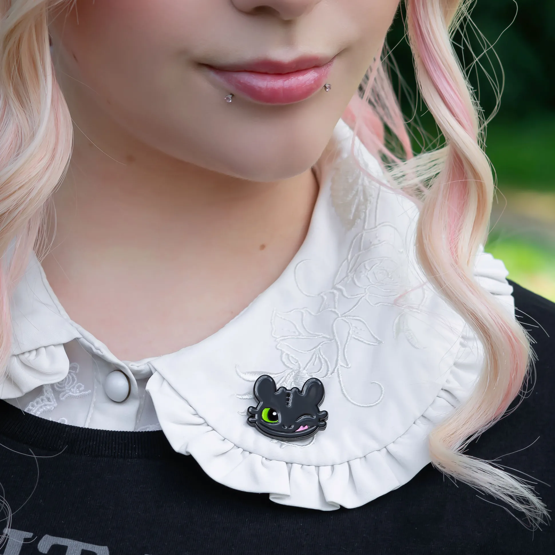 Stoer op het scherm, schattig op je outfit: met deze set van 5 pins neem je Tandloos vijf keer mee op je hoodie, tas of con-outfit. Officieel gelicenseerd en volledig in Tandloos-look, vast te maken met een handige vlindersluiting — blijft zitten zonder gedoe. Elke pin is ca. 3,3 x 0,3 x 3 cm, ideaal voor koordjes, riemen of een sleutelkoord. Voor iedereen die draken liever vastprikt dan temt: een must-have voor fans van Hoe tem je een draak.