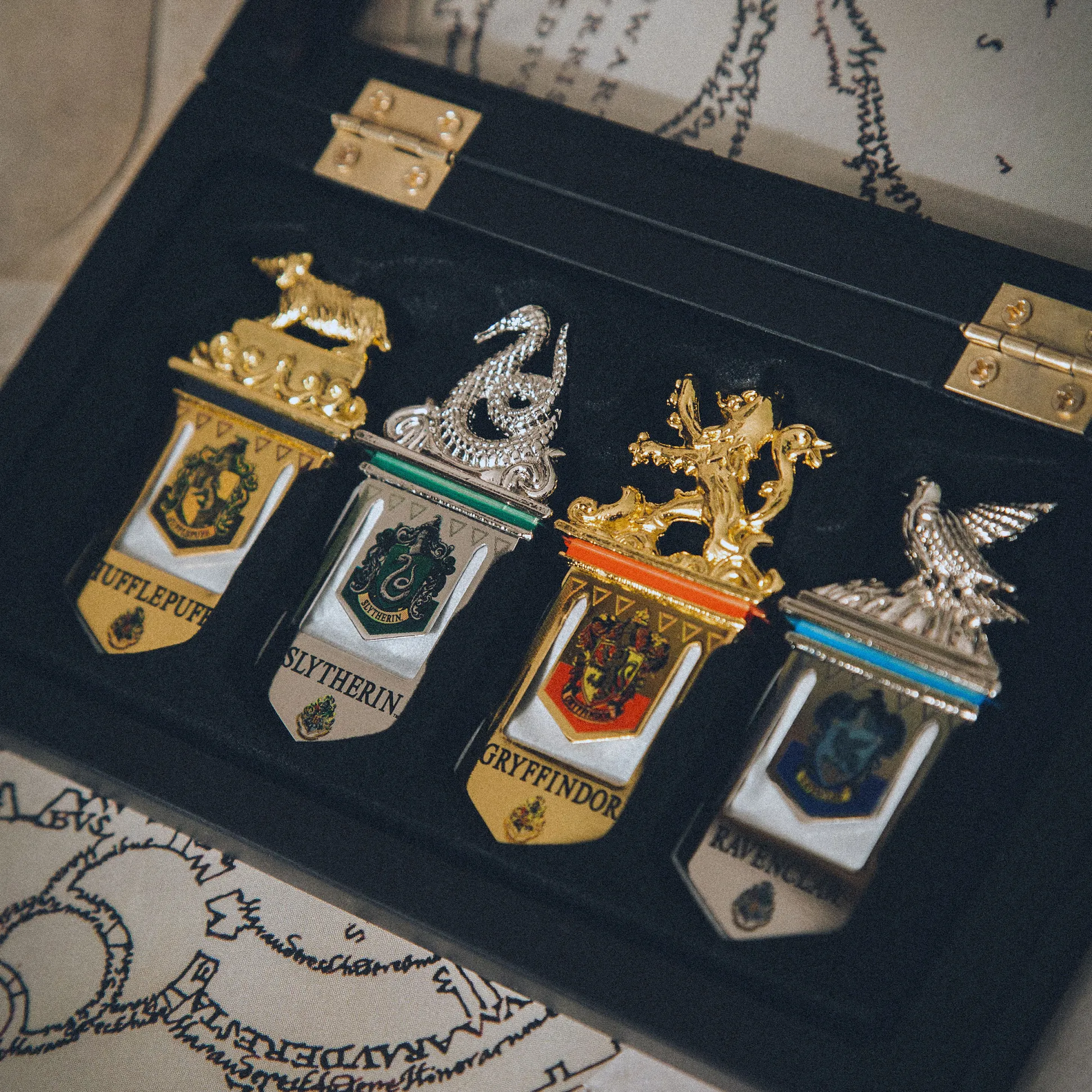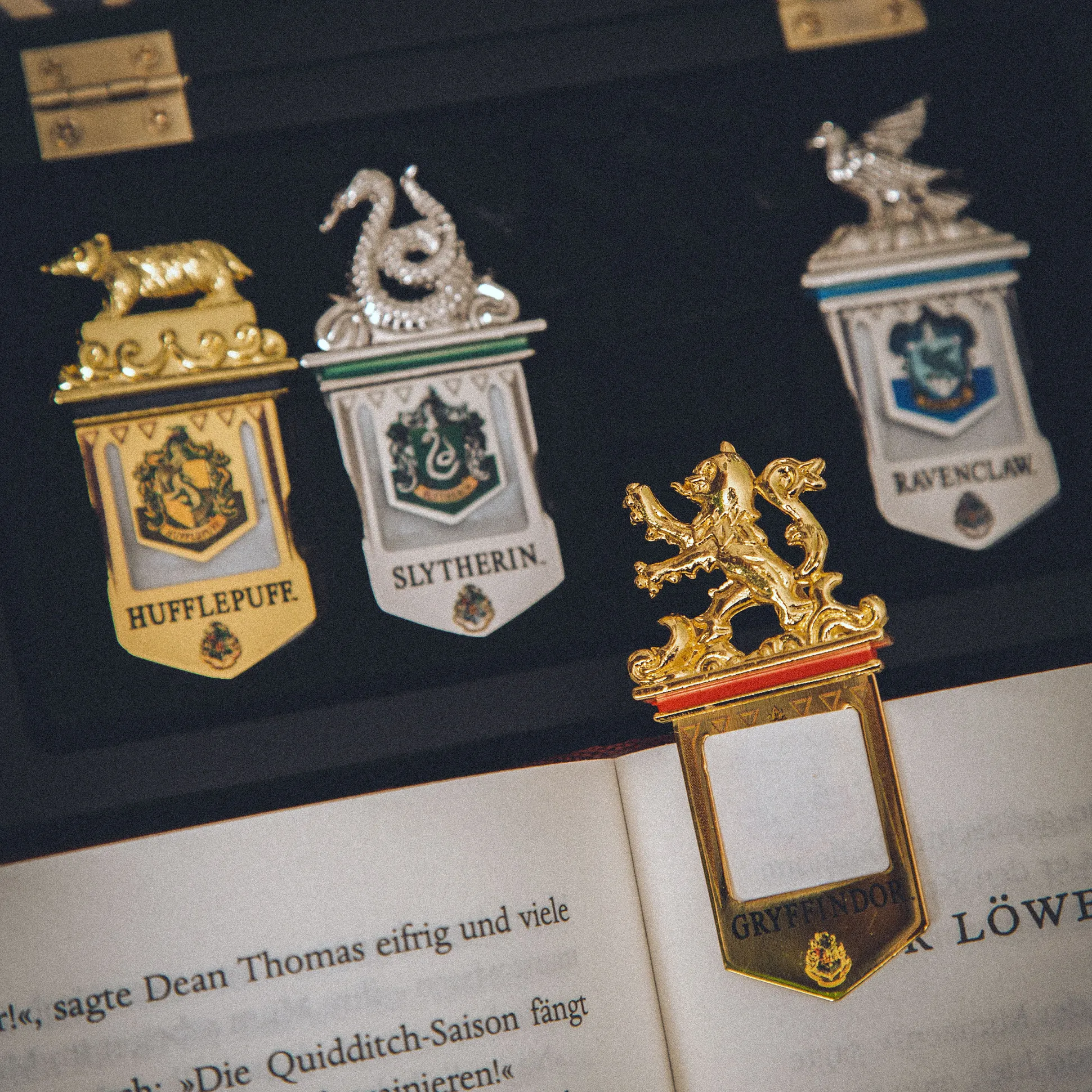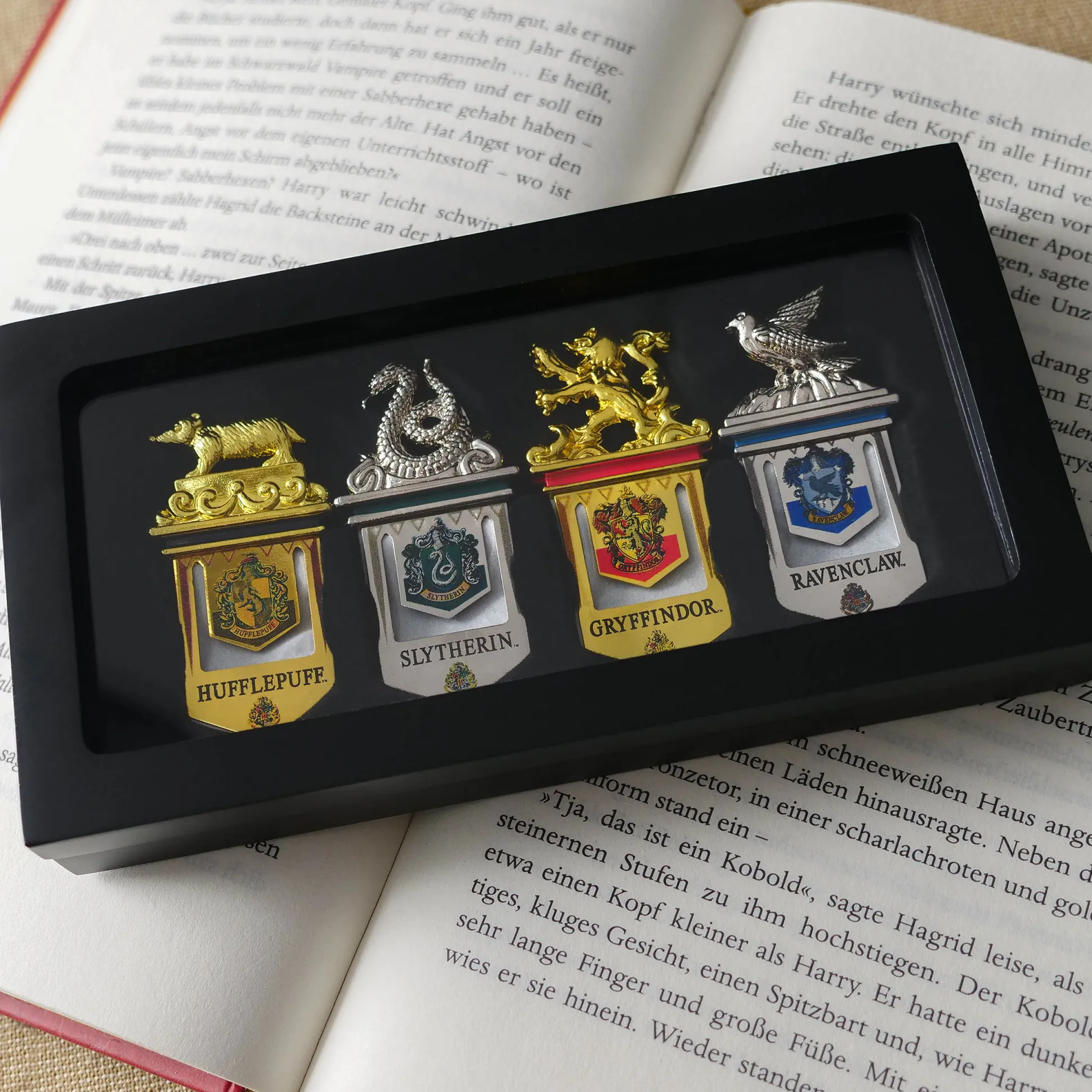 De vier boekenleggerclips zijn zeer gedetailleerd ontworpen en zullen je leesplezier vergroten. Elk bevat een huiswapen, het Hogwarts-wapen, de naam van het betreffende huis en het embleemdier van het huis. Het bovenste deel, dat uit het boek steekt, is versierd met het embleemdier van het betreffende huis. Daaronder bevindt zich het kleurrijk ontworpen huiswapen en de naam van het huis. Helemaal onderaan is een klein Hogwarts-wapen te zien.