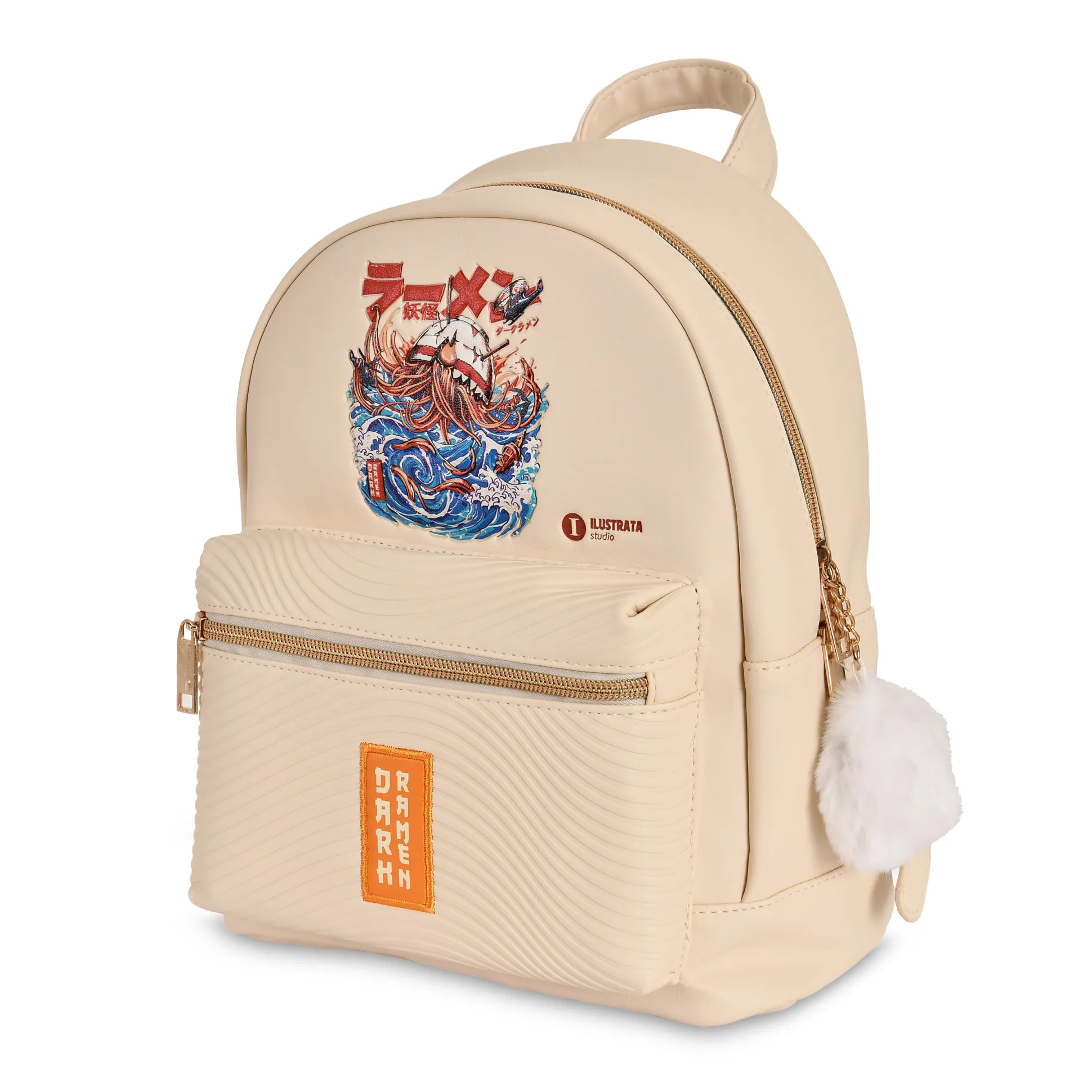 Ramen, maar dan dark. Officieel gelicentieerde Ilustrata-rugzak die het Dark Ramen-artwork serveert als reliëfmotief plus een patch op de voorkant – in zacht beige dat overal bij past. Binnen: hoofdvak met twee insteekvakken; buiten: een ritsvak voor én achter. De pompon aan de rits is de topping; verstelbare schouderbanden en een handvat zorgen voor draagcomfort onderweg. Compacte 22 x 28 x 15 cm – perfect voor conventions, stedentrips en alle anime- & mangafans die hun honger naar fanart overal mee naartoe willen nemen.