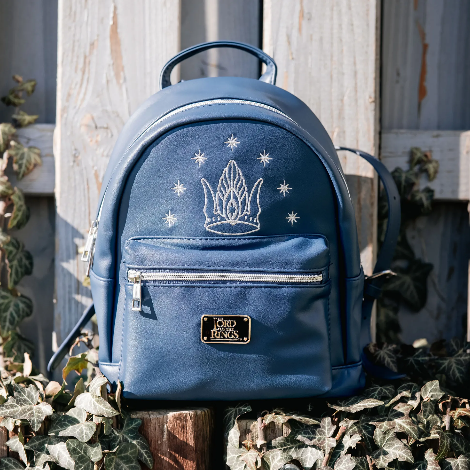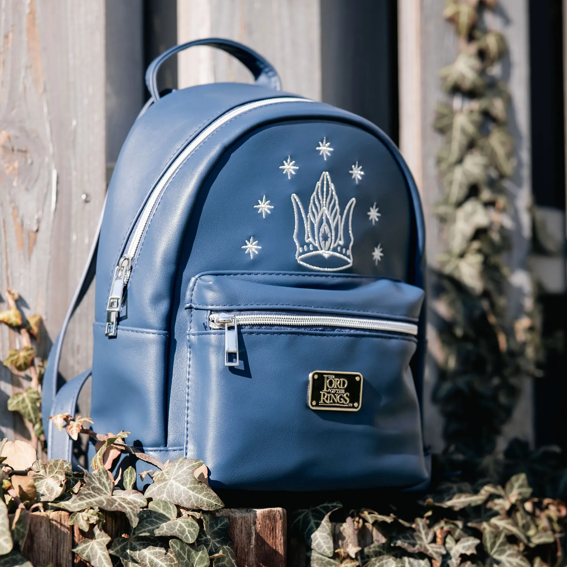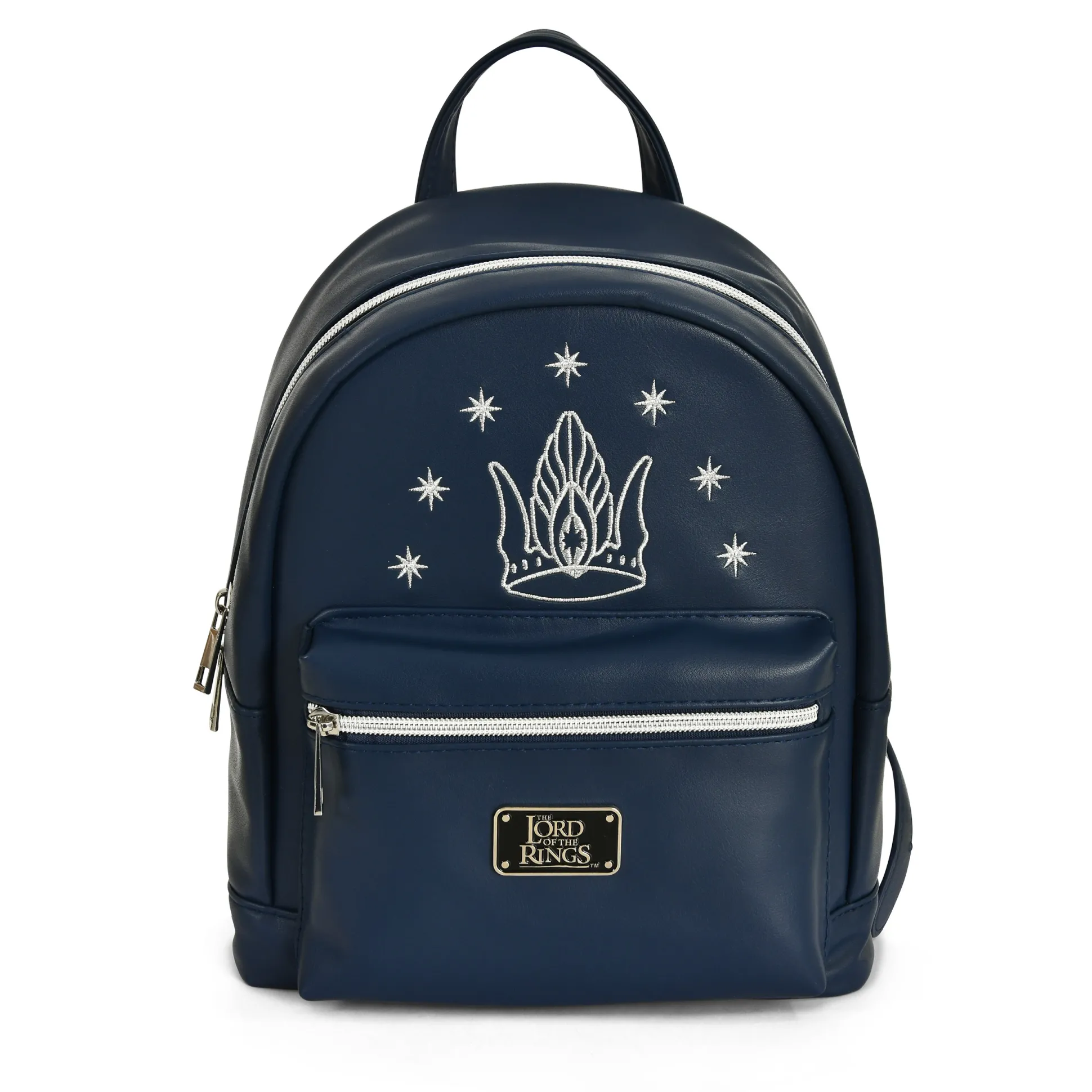 Alle hulde aan de terugkeer van de koning—nu in rugzakvorm. Deze officieel gelicentieerde In de ban van de ring mini-rugzak kroont je outfit met Aragorns kroon, netjes in zilver geborduurd op diepblauw. Van buiten compact, van binnen heldhaftig: het hoofdvak bergt je essentials en heeft een klein insteekvak; plus ritsvakken voor en achter voor schatten, snacks of geheime erfstukken.