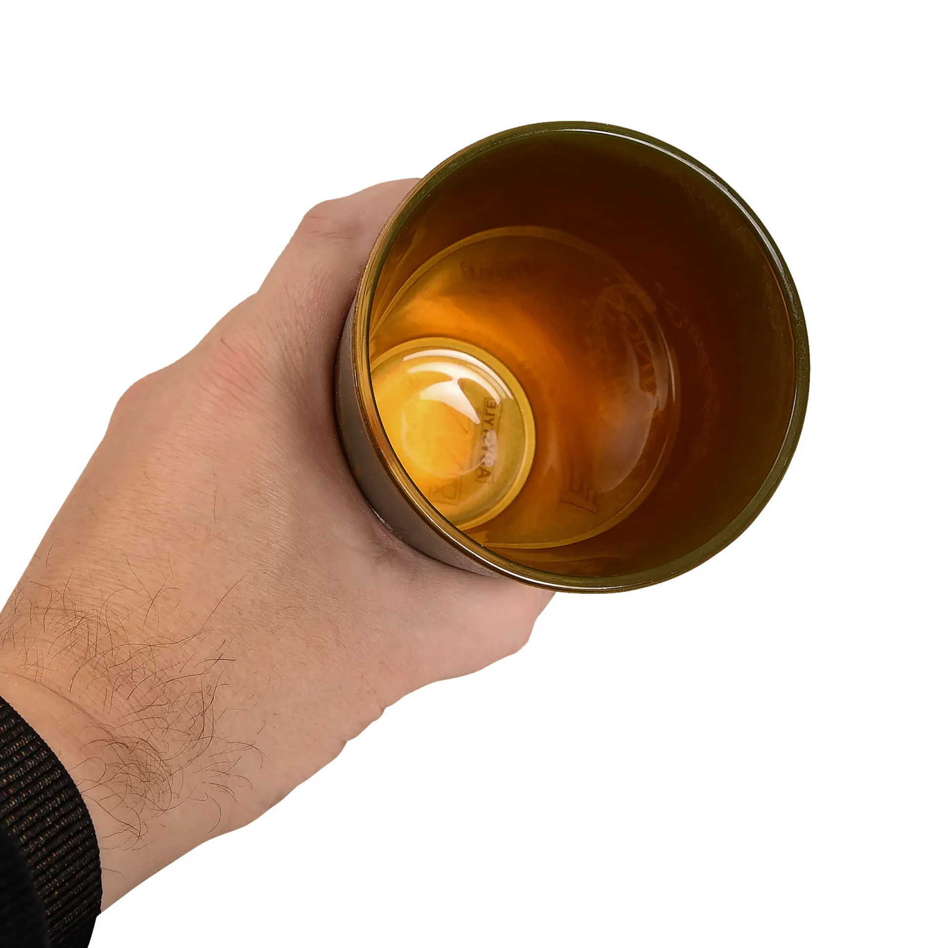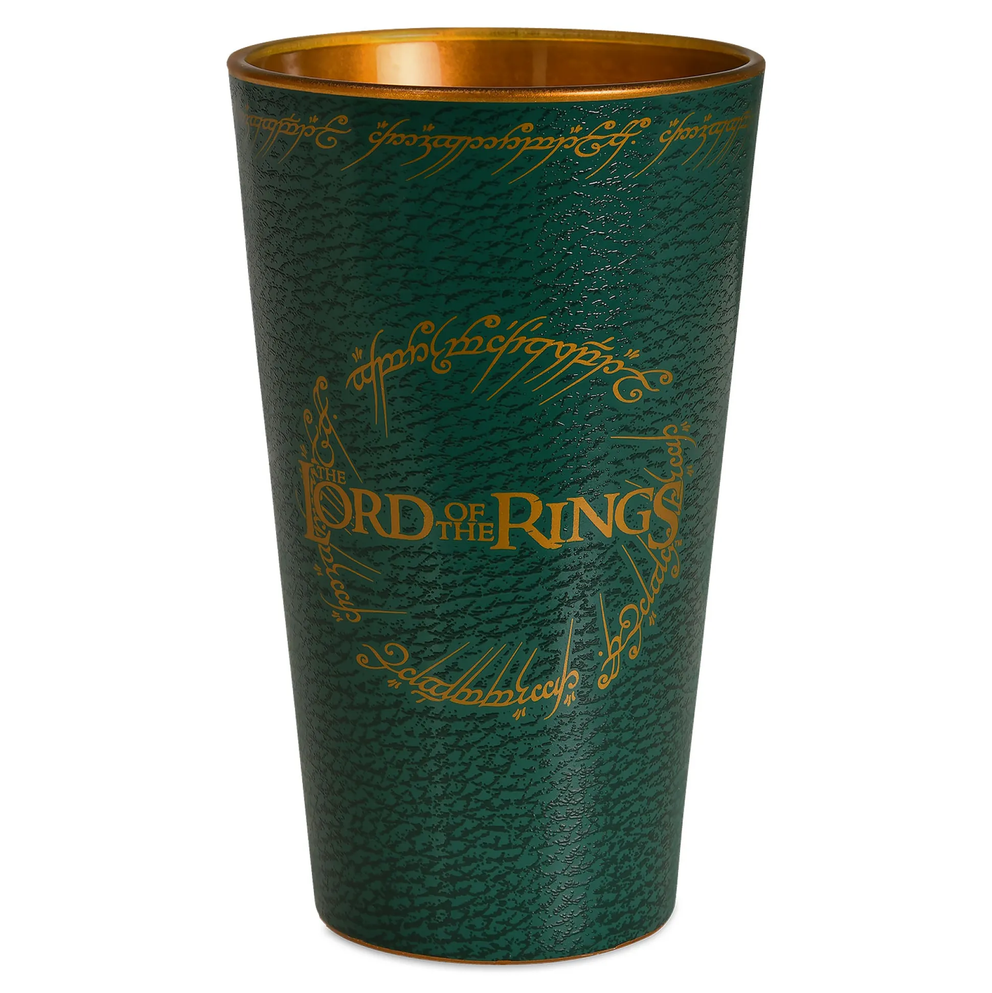 Buitenkant diepgroen met fijne structuur; binnenkant goudkleurig als een pas opgepoetste dwergenschat. Perfect om je bier, cider of ijsthee een heldhaftige glans te geven.