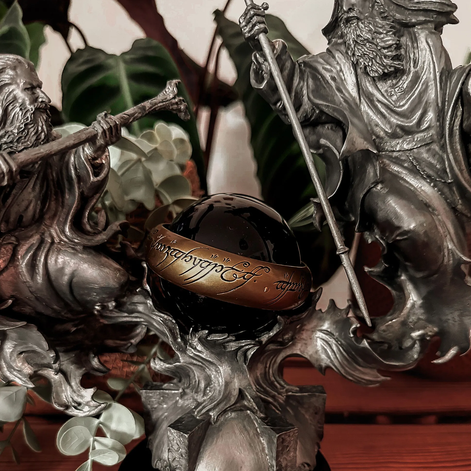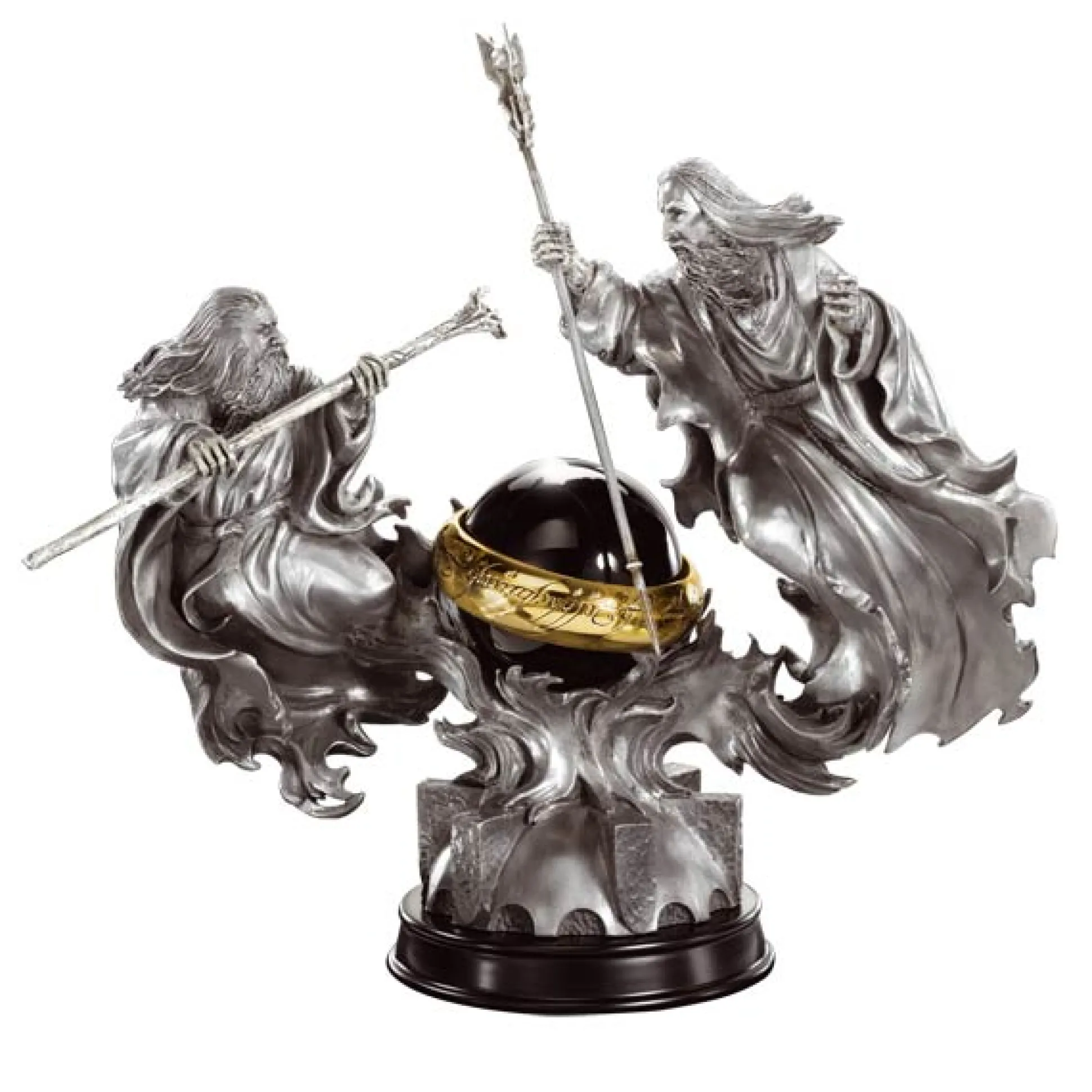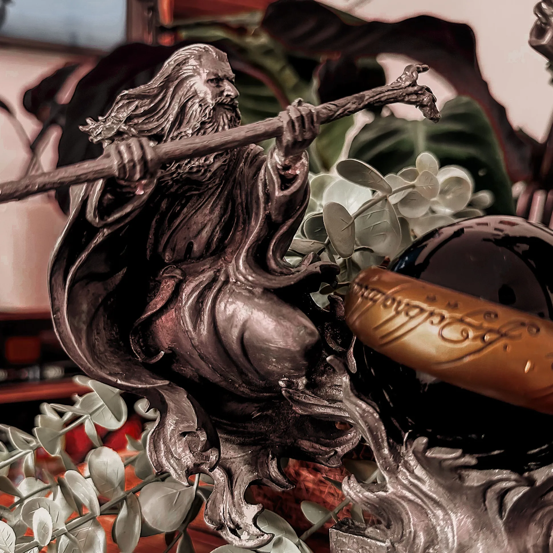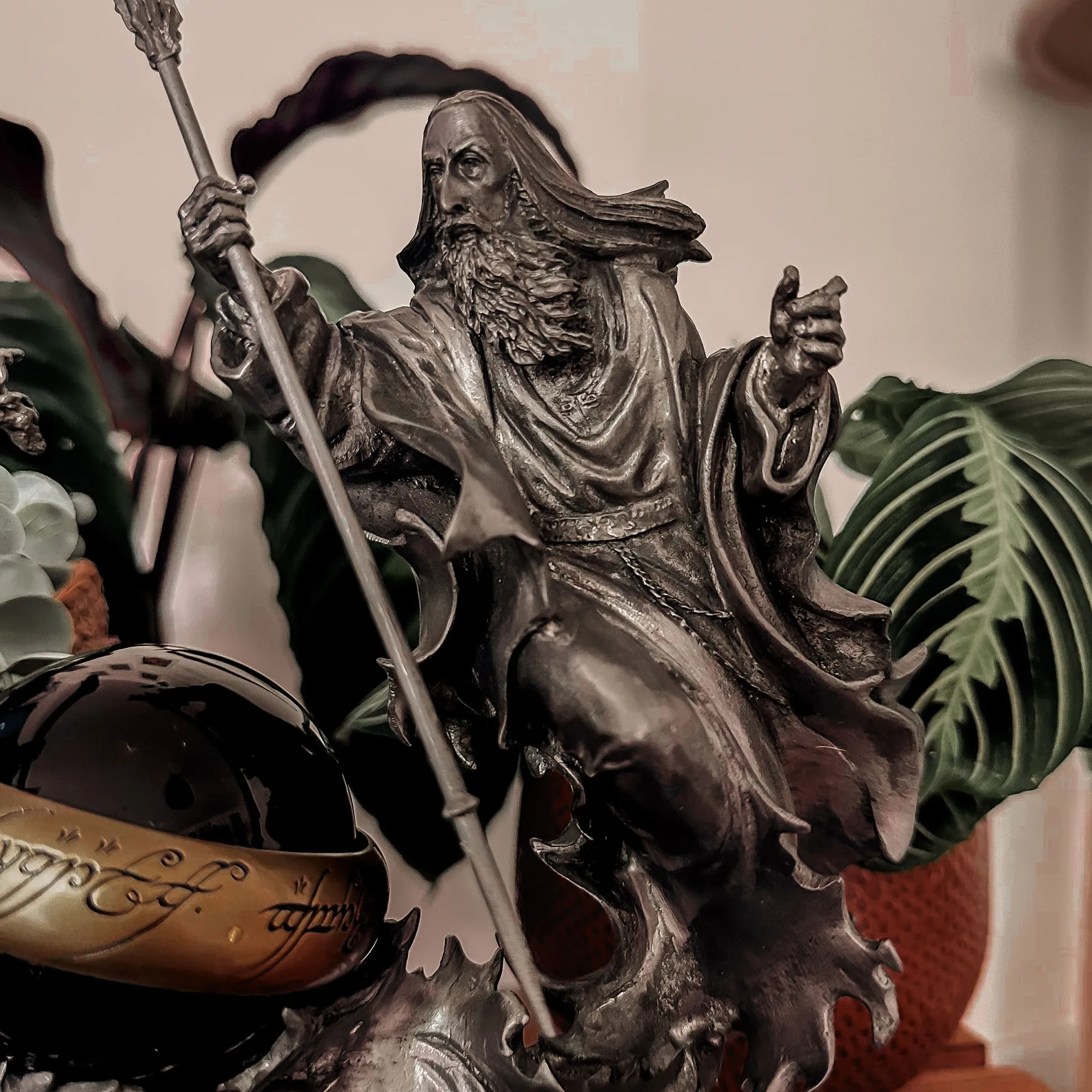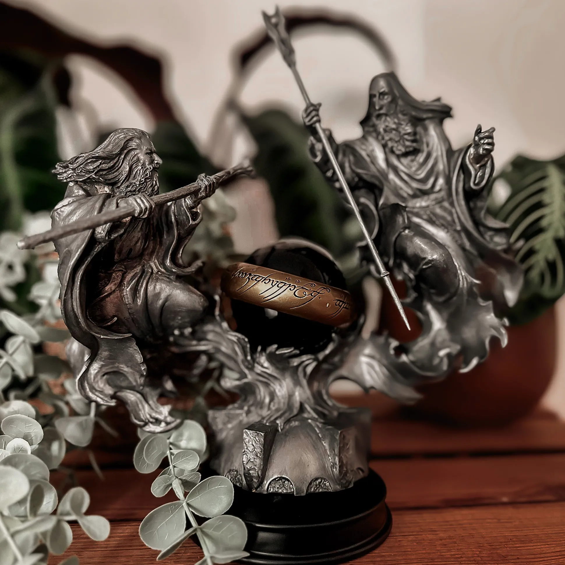 Een sculptuur die lijkt te barsten van energie en beweging: Gandalf de Grijze vecht tegen de duistere tovenaar Saruman. Het is een strijd om alles, waarbij beide tovenaars tot het uiterste gaan. De oorzaak van de strijd ligt in het midden, het is de Ene Ring.