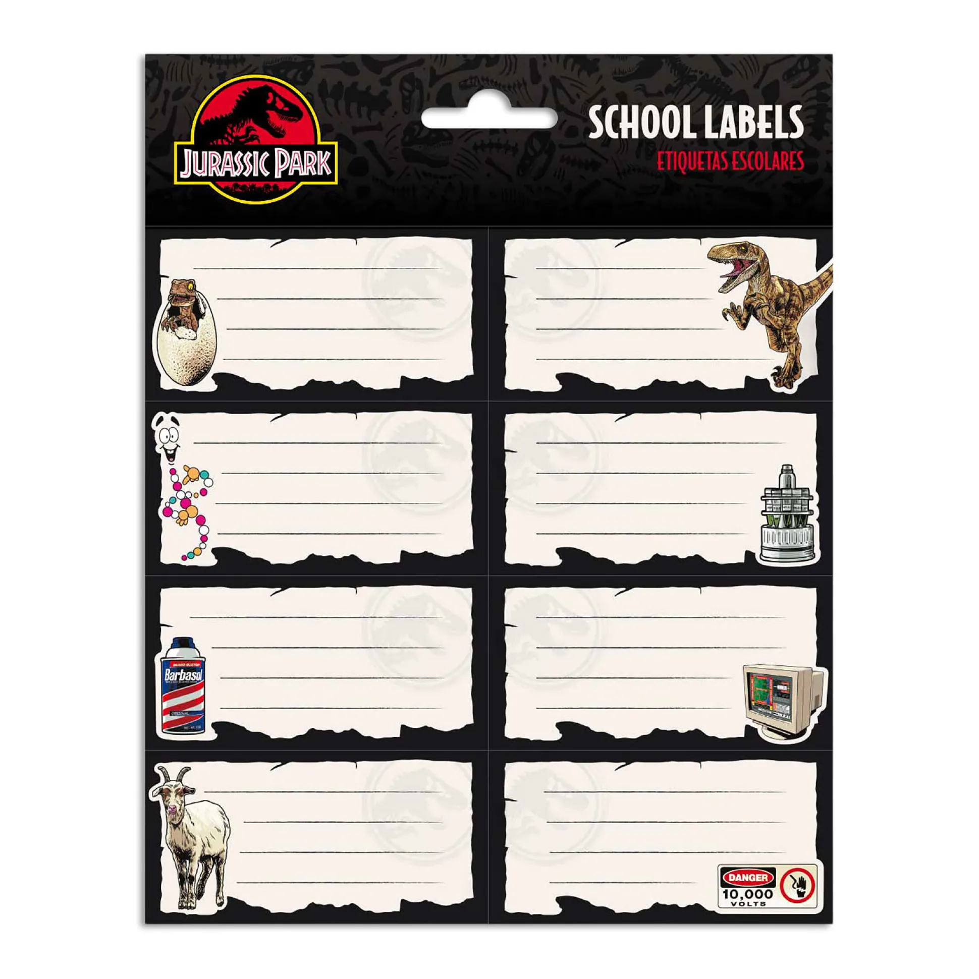 Gevonden voorwerpen? Niet op Isla Nublar. Met de officieel gelicentieerde Jurassic Park schoollabels markeer je je territorium als een Velociraptor – netjes, scherp, onmiskenbaar. Twee vellen met 16 verschillende labels met parkiconen, waaronder de Barbasol-bus, een Velociraptor en, jawel, de geit. Elk label is 8 x 4 cm: genoeg ruimte voor je naam, klas of een strenge “Afblijven, dino’s”. Perfect voor schriften, broodtrommels, flessen en alles wat graag verdwijnt. Het ideale cadeau voor fans, scholieren en iedereen die het themalied nog in de gang neuriet. Claim je spullen – zonder chaostheorie.