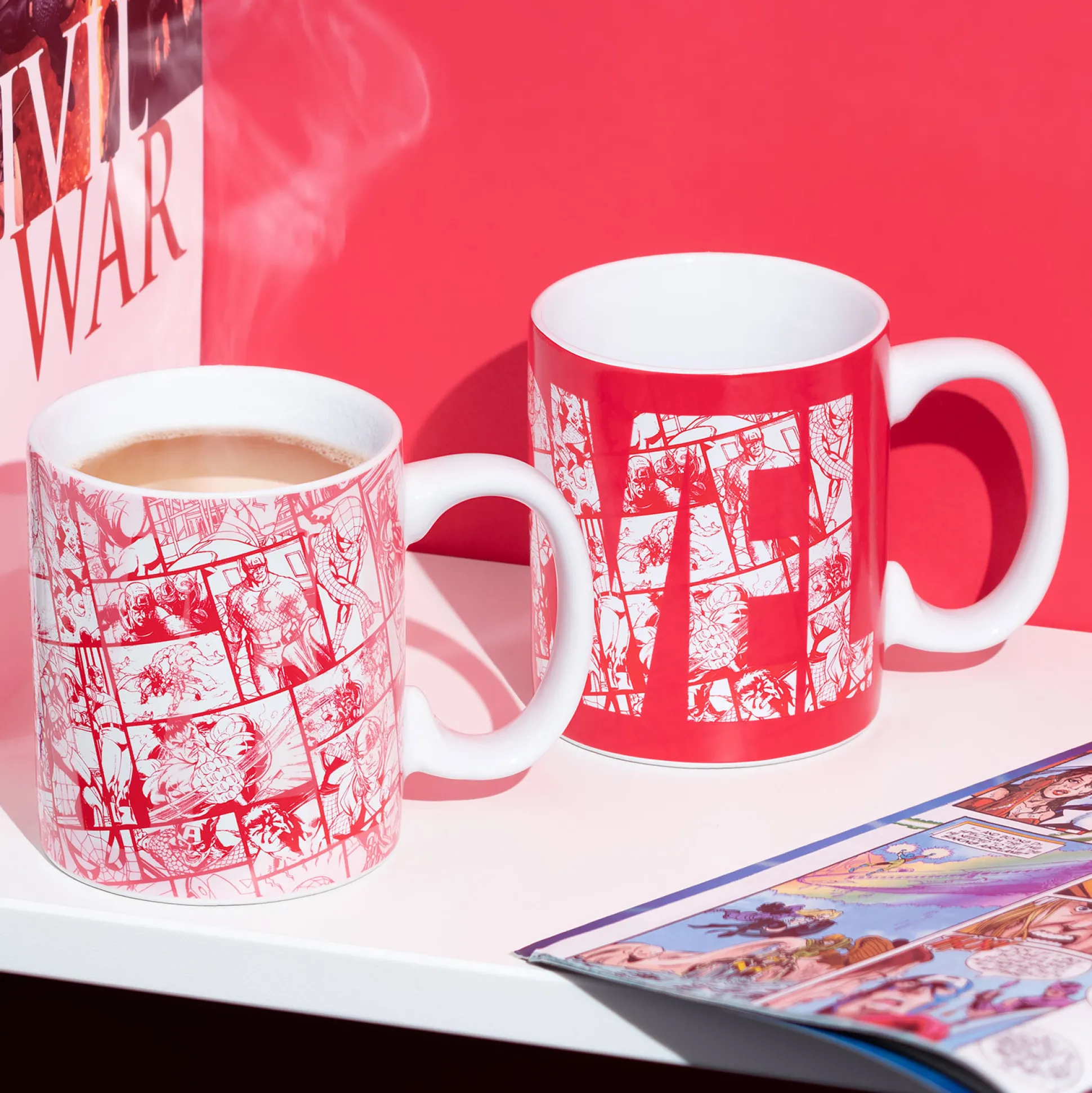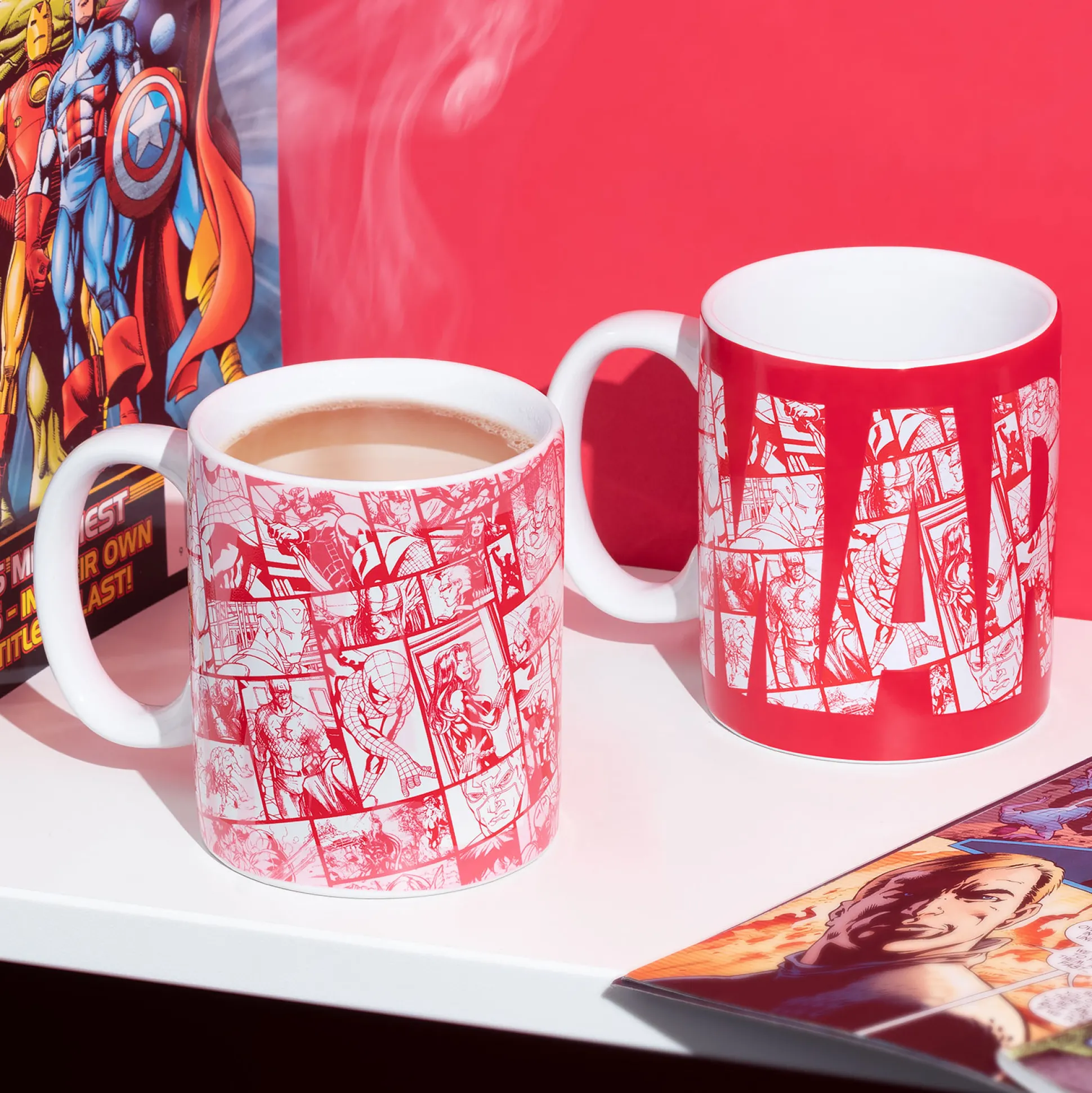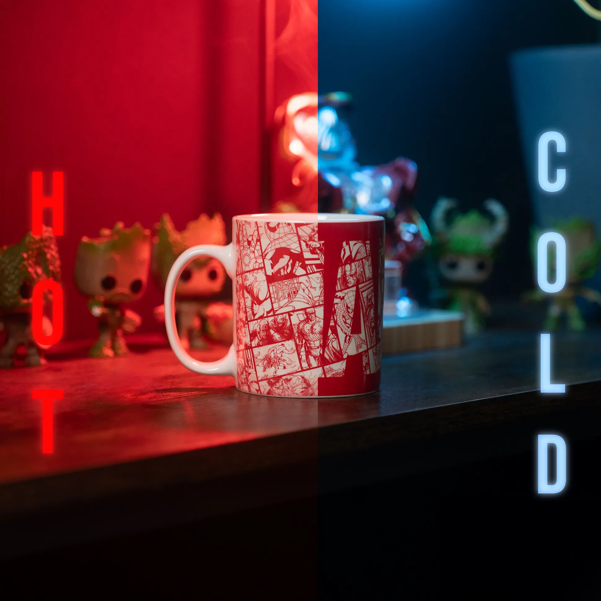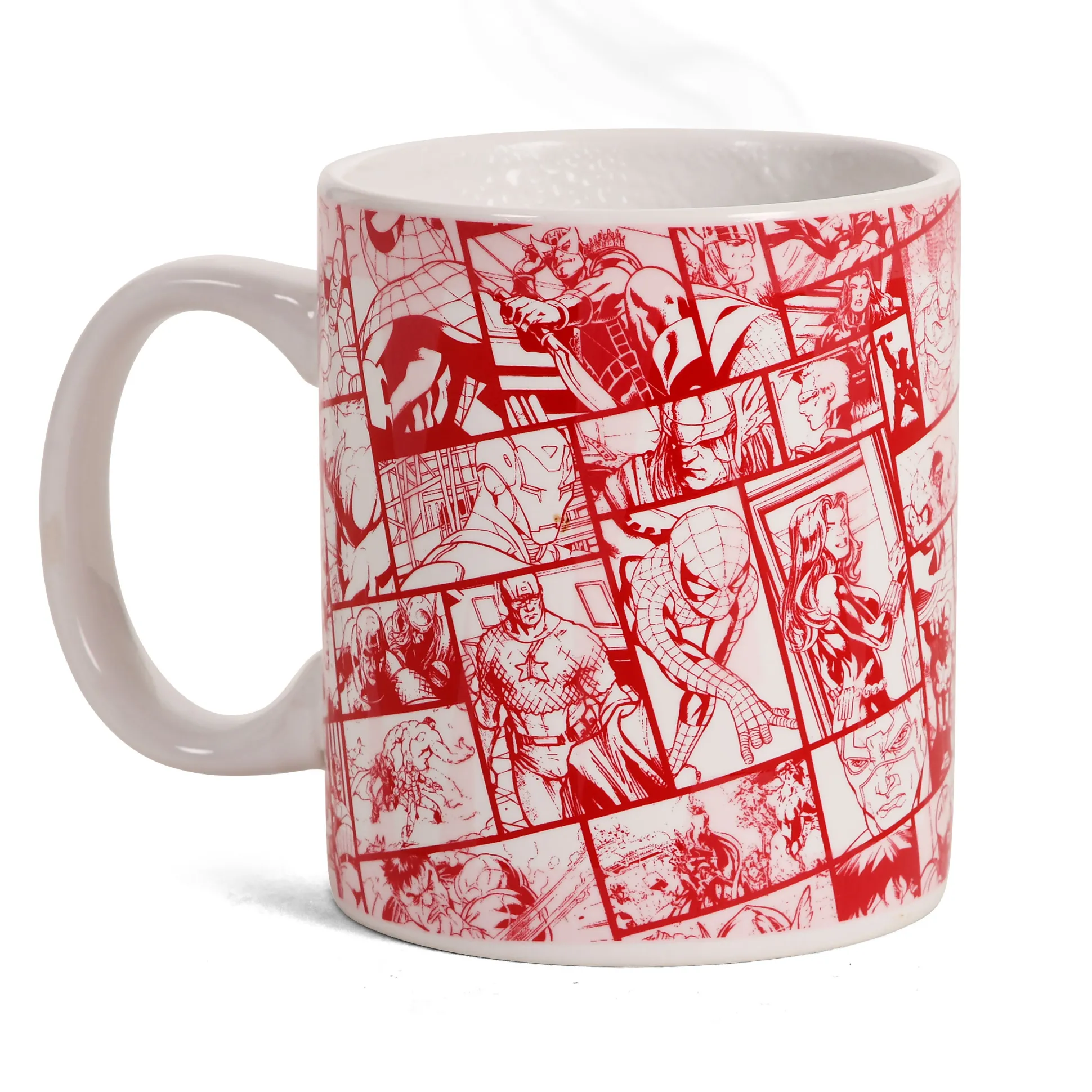 Voeg gewoon warmte toe – en het rode Marvel-logo verandert in een complete comicgalerij! Deze officieel gelicentieerde Marvel-mok heeft een thermo-effect: giet er hete koffie, thee of cacao in en comics van Marvel met Spider-Man, Captain America en meer verschijnen. Koud drankje? Het logo blijft cool in rood en wit.