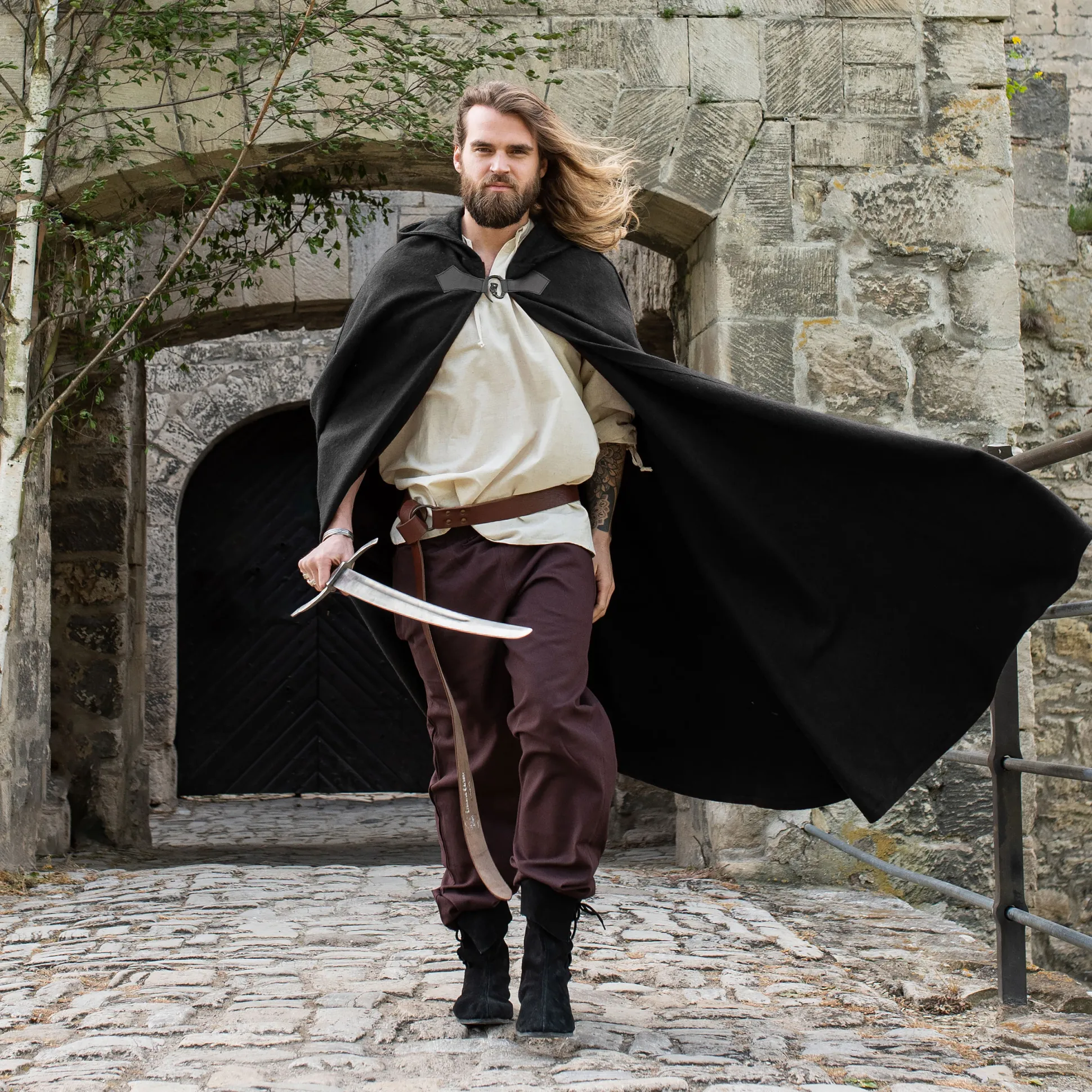 Hoor je de roep van de Middeleeuwen? Dan hebben we precies wat je nodig hebt! Met de middeleeuwse wollen mantel met wolvenklem in zwart van Elbenwald, ben je de ster van elk middeleeuws evenement. Deze mantel is niet alleen een blikvanger, maar ook praktisch: Dankzij de metalen klem bij de hals is hij gemakkelijk te sluiten en de korte kap biedt extra bescherming. Met een totale lengte van 131 cm en een stofbreedte van 231 cm biedt hij voldoende ruimte om je in te verstoppen of om in te knuffelen. En het beste: Bij lichte regen werkt de mantel zelfs waterafstotend! Gemaakt van zware wollen mix in de kleur zwart, is hij de perfecte metgezel voor elk seizoen. Dus, waar wacht je nog op? Duik in de wereld van de Middeleeuwen met Elbenwald!